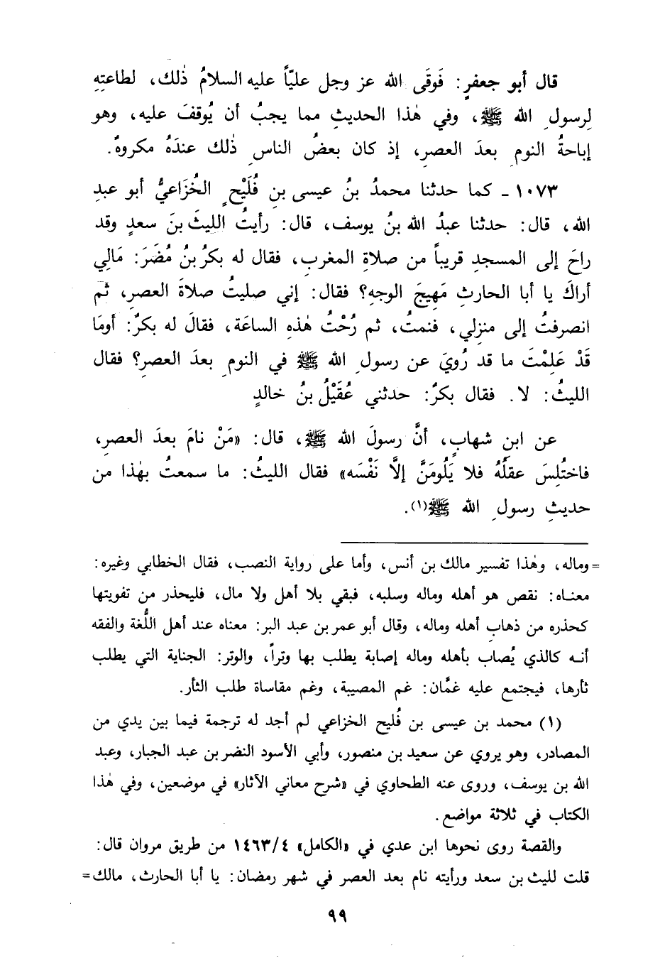 1073 - كَمَا حَدَّثَنَا مُحَمَّدُ بْنُ عِيسَى بْنِ فُلَيْحٍ الْخُزَاعِيُّ أَبُو عَبْدِ اللهِ قَالَ: حَدَّثَنَا عَبْدُ اللهِ بْنُ يُوسُفَ، قَالَ: رَأَيْتُ اللَّيْثَ بْنَ سَعْدٍ وَقَدْ رَاحَ إِلَى الْمَسْجِدِ قَرِيبًا مِنْ صَلَاةِ الْمَغْرِبِ، فَقَالَ لَهُ بَكْرُ بْنُ مُضَرَ: مَا لِي أَرَاكَ يَا أَبَا الْحَارِثِ مُهَيَّجَ الْوَجْهِ , فَقَالَ: إِنِّي صَلَّيْتُ صَلَاةَ الْعَصْرِ ثُمَّ انْصَرَفْتُ إِلَى مَنْزِلِي فَنِمْتُ ثُمَّ رُحْتُ هَذِهِ السَّاعَةَ فَقَالَ لَهُ بَكْرٌ: أَوَمَا قَدْ عَلِمْتَ مَا قَدْ رُوِيَ عَنْ رَسُولِ اللهِ صَلَّى اللَّهُ عَلَيْهِ وَسَلَّمَ فِي النَّوْمِ بَعْدَ الْعَصْرِ؟ فَقَالَ اللَّيْثُ: لَا فَقَالَ بَكْرٌ: حَدَّثَنِي عُقَيْلُ بْنُ خَالِدٍ، عَنِ ابْنِ شِهَابٍ أَنَّ رَسُولَ اللهِ صَلَّى اللَّهُ عَلَيْهِ وَسَلَّمَ قَالَ: " مَنْ نَامَ بَعْدَ الْعَصْرِ فَاخْتُلِسَ عَقْلُهُ فَلَا يَلُومَنَّ إِلَّا نَفْسَهُ " فَقَالَ اللَّيْثُ: مَا سَمِعْتُ بِهَذَا مِنْ حَدِيثِ رَسُولِ اللهِ صَلَّى اللَّهُ عَلَيْهِ وَسَلَّمَ، -[101]- فَكَانَ هَذَا الْحَدِيثُ مُنْقَطِعًا. وَكَانَ مَا رَوَيْنَاهُ قَبْلَهُ أَوْلَى مِنْهُ لِاتِّصَالِهِ بِرَسُولِ اللهِ صَلَّى اللَّهُ عَلَيْهِ وَسَلَّمَ