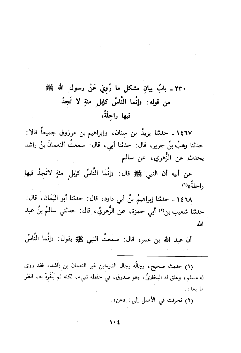 1467 - حَدَّثَنَا يَزِيدُ بْنُ سِنَانٍ , وَإِبْرَاهِيمُ بْنُ مَرْزُوقٍ , جَمِيعًا قَالَا: حَدَّثَنَا وَهْبُ بْنُ جَرِيرٍ , قَالَ: حَدَّثَنَا أَبِي قَالَ: سَمِعْتُ النُّعْمَانَ بْنَ رَاشِدٍ , يُحَدِّثُ عَنِ الزُّهْرِيِّ , عَنْ سَالِمٍ , عَنْ أَبِيهِ , أَنَّ النَّبِيَّ صَلَّى اللَّهُ عَلَيْهِ وَسَلَّمَ قَالَ: " إنَّمَا النَّاسُ كَإِبِلٍ مِائَةٍ لَا تَجِدُ فِيهَا رَاحِلَةً "