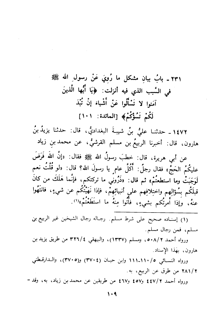 1472 - حَدَّثَنَا عَلِيُّ بْنُ شَيْبَةَ الْبَغْدَادِيُّ , قَالَ: حَدَّثَنَا يَزِيدُ بْنُ هَارُونَ , قَالَ: أَخْبَرَنَا الرَّبِيعُ بْنُ مُسْلِمٍ الْقُرَشِيُّ , عَنْ مُحَمَّدِ بْنِ زِيَادٍ , عَنْ أَبِي هُرَيْرَةَ , قَالَ: " خَطَبَ رَسُولُ اللهِ صَلَّى اللَّهُ عَلَيْهِ وَسَلَّمَ، فَقَالَ: " إنَّ اللهَ فَرَضَ عَلَيْكُمُ الْحَجَّ " فَقَالَ رَجُلٌ: أَكُلَّ عَامٍ يَا رَسُولَ اللهِ؟ قَالَ " لَوْ قُلْتُ: نَعَمْ لَوَجَبَتْ وَمَا اسْتَطَعْتُمْ ثُمَّ قَالَ: " ذَرُونِي مَا تَرَكْتُكُمْ فَإِنَّمَا هَلَكَ مَنْ كَانَ قَبْلَكُمْ بِسُؤَالِهِمْ وَاخْتِلَافِهِمْ عَلَى أَنْبِيَائِهِمْ فَإِذَا نَهَيْتُكُمْ عَنْ شَيْءٍ فَانْتَهُوا عَنْهُ، وَإِذَا أَمَرْتُكُمْ بِشَيْءٍ فَأْتُوا مِنْهُ مَا اسْتَطَعْتُمْ "