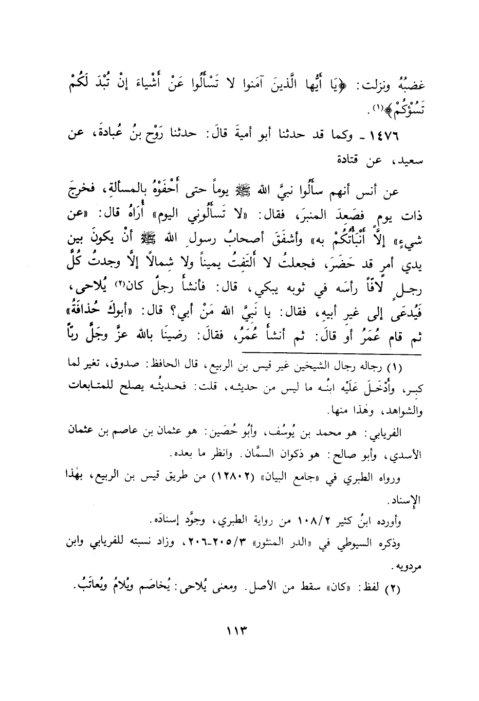 1477 - كَمَا قَدْ حَدَّثَنَا أَبُو أُمَيَّةَ , قَالَ: حَدَّثَنَا رَوْحُ بْنُ عُبَادَةَ , عَنْ هِشَامِ بْنِ أَبِي عَبْدِ اللهِ , عَنْ قَتَادَةَ , عَنْ أَنَسٍ , بِمِثْلِهِ قَالَ: فَكَانَ قَتَادَةُ يَذْكُرُ هَذَا الْحَدِيثَ إذَا سُئِلَ عَنْ هَذِهِ الْآيَةِ {يَا أَيُّهَا الَّذِينَ آمَنُوا لَا تَسْأَلُوا عَنْ أَشْيَاءَ إنْ تُبْدَ لَكُمْ تَسُؤْكُمْ} [المائدة: 101] قَالَ أَبُو جَعْفَرٍ: فَفِي هَذِهِ الْآثَارِ أَنَّ نُزُولَ هَذِهِ الْآيَةِ كَانَ فِي -[115]- الْأَسْبَابِ الْمَذْكُورَةِ فِيهَا فَقَالَ: قَائِلٌ هَذِهِ آثَارٌ تُضَادُّ الْآثَارَ الْأُوَلَ فَكَيْفَ يَجُوزُ أَنْ يَكُونَ نُزُولُ هَذِهِ الْآيَةِ كَانَ فِي هَذَيْنِ السَّبَبَيْنِ جَمِيعًا , وَلَا نَجِدُهَا فِي كِتَابِ اللهِ عَزَّ وَجَلَّ فِي مَوْضِعَيْنِ , وَلَوْ كَانَتْ نَزَلَتْ فِي كُلِّ وَاحِدٍ مِنَ السَّبَبَيْنِ لَكَانَتْ مَذْكُورَةً مِنْهُ فِي مَوْضِعَيْنِ كَمَا كَانَ قَوْلُهُ عَزَّ وَجَلَّ {يَا أَيُّهَا النَّبِيُّ جَاهِدِ الْكُفَّارَ وَالْمُنَافِقِينَ وَاغْلُظْ عَلَيْهِمْ} [التوبة: 73] الْآيَةَ مَذْكُورًا فِي مَوْضِعَيْنِ إذْ كَانَتْ نَزَلَتْ مَرَّتَيْنِ ; لِأَنَّهُ أُرِيدَ بِهَا فِي كُلِّ وَاحِدٍ مِنَ الْمَوْضِعَيْنِ غَيْرُ مَنْ أُرِيدَ بِهَا فِي الْمَوْضِعِ الْآخَرِ مِنْهُمَا فَكَانَ جَوَابَنَا لَهُ فِي ذَلِكَ بِتَوْفِيقِ اللهِ عَزَّ وَجَلَّ وَعَوْنِهِ أَنَّهُ قَدْ يُحْتَمَلُ أَنْ تَكُونَ هَذِهِ السُّؤَالِاتُ الْمَذْكُورَاتُ فِي هَذَيْنِ الْفَصْلَيْنِ مِنْ هَذَا الْبَابِ قَدْ كَانَتْ قَبْلَ نُزُولِ هَذِهِ الْآيَةِ ثُمَّ أَنْزَلَ اللهُ عَزَّ وَجَلَّ بَعْدَ ذَلِكَ هَذِهِ الْآيَةَ نَهْيًا لَهُمْ عَنْ هَذِهِ السُّؤَالِاتِ وَإِعْلَامًا لَهُمْ أَنَّهُ لَا حَاجَةَ لَهُمْ فِي الْجَوَابَاتِ عَنْهَا بِحَقَائِقِ أُمُورِهَا الَّتِي أُرِيدَتْ بِهَا إذْ كَانَ ذَلِكَ مِمَّا إذَا سَمِعُوهُ سَاءَهُمْ، وَإِذَا كَانَ ذَلِكَ إنَّمَا يَسْتَعْمِلُونَ بِهِ مَا لَا مَنْفَعَةَ لَهُمْ فِيهِ، وَمِمَّا لَوْ جَهِلُوهُ لَمْ يَضُرَّهُمْ وَإِنَّمَا الْمَنْفَعَةُ بِالسُّؤَالِاتِ اسْتِعْلَامُ الْفَرَائِضِ عَلَيْهِمْ فِي دِينِهِمْ وَمَا يَتَقَرَّبُونَ بِهِ إلَى رَبِّهِمْ عَزَّ وَجَلَّ، فَذَلِكَ الْعِلْمُ الَّذِي يَنْفَعُهُمْ , وَالَّذِي إذَا جَهِلُوهُ ضَرَّهُمْ فَعَلَيْهِمُ السُّؤَالُ عَنْهُ حَتَّى يَعْلَمُوهُ وَالدَّلِيلُ عَلَى أَنَّهُ عَزَّ وَجَلَّ إنَّمَا كَرِهَ مِنْهُمُ السُّؤَالِاتِ عَنْ مَا لَا مَنْفَعَةَ لَهُمْ فِيهِ وَعَنْ مَا إذَا عَلِمُوهُ سَاءَهُمْ لَا عَنْ مَا سِوَاهُ مِنْ أُمُورِ دِينِهِمُ الَّتِي بِهِمُ الْحَاجَةُ إلَى عِلْمِهَا حَتَّى يُؤَدُّوا الْمَفْرُوضَ فِيهَا عَلَيْهِمْ وَحَتَّى -[116]- يَتَقَرَّبُوا إلَى رَبِّهِمْ عَزَّ وَجَلَّ بِمَا يُقَرِّبُهُمْ إلَيْهِ مِنْهَا مَا قَدْ رُوِيَ عَنْ مُعَاذِ بْنِ جَبَلٍ مِمَّا قَدْ دَلَّ عَلَى ذَلِكَ