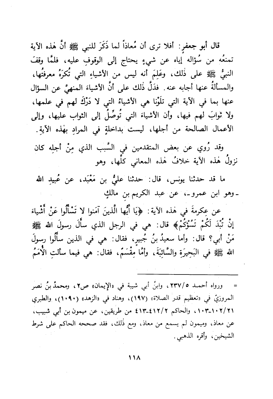 مَا قَدْ حَدَّثَنَا يُونُسُ قَالَ: حَدَّثَنَا عَلِيُّ بْنُ مَعْبَدٍ عَنْ عُبَيْدِ اللهِ وَهُوَ ابْنُ عَمْرٍو عَنْ عَبْدِ الْكَرِيمِ بْنِ مَالِكٍ عَنْ عِكْرِمَةَ فِي هَذِهِ الْآيَةِ {يَا أَيُّهَا الَّذِينَ آمَنُوا لَا تَسْأَلُوا عَنْ أَشْيَاءَ إنْ تُبْدَ لَكُمْ تَسُؤْكُمْ} [المائدة: 101] قَالَ: " هِيَ فِي الرَّجُلِ الَّذِي سَأَلَ رَسُولَ اللهِ صَلَّى اللَّهُ عَلَيْهِ وَسَلَّمَ مَنْ أَبِي " قَالَ: وَأَمَّا سَعِيدُ بْنُ جُبَيْرٍ فَقَالَ: " هِيَ فِي الَّذِينَ سَأَلُوا رَسُولَ اللهِ صَلَّى اللَّهُ عَلَيْهِ وَسَلَّمَ فِي الْبَحِيرَةِ وَالسَّائِبَةِ وَأَمَّا مِقْسَمٌ فَقَالَ: " هِيَ فِيمَا سَأَلَتِ الْأُمَمُ -[119]- أَنْبِيَاءَهُمْ مِنَ الْآيَاتِ " قَالَ: وَمَعْنَى مَا رُوِيَ فِي ذَلِكَ عَنْ عِكْرِمَةَ قَدْ وَافَقَ بَعْضَ مَا قَدْ تَقَدَّمَتْ رِوَايَتُنَا لَهُ فِي هَذَا الْبَابِ وَأَمَّا مَا رُوِيَ عَنْ سَعِيدِ بْنِ جُبَيْرٍ فَمَعْنَاهُ عِنْدَنَا وَاللهُ أَعْلَمُ مِنْ جِنْسِ الْمَعَانِي الَّتِي رَوَيْنَاهَا فِيمَا تَقَدَّمَ مِنَّا فِي هَذَا الْبَابِ ; لِأَنَّ الَّذِينَ كَانُوا يَفْعَلُونَ الْأَشْيَاءَ الَّتِي كَانُوا يَسْأَلُونَ رَسُولَ اللهِ صَلَّى اللَّهُ عَلَيْهِ وَسَلَّمَ عَنْهَا مِنْ تِلْكَ الْمَعَانِي كَانُوا أَبْنَاءَ بَعْضِ السَّامِعِينَ لِلْجَوَابَاتِ عَنْهَا، وَكَانَ بَعْضُ مَنْ يَحْضُرُهُ سِوَاهُمْ أَبْنَاءً لِبَعْضِ الْفَاعِلِينَ لَهَا الْمُخْبَرِ بِمَوْضِعِهِمْ مِنْهَا