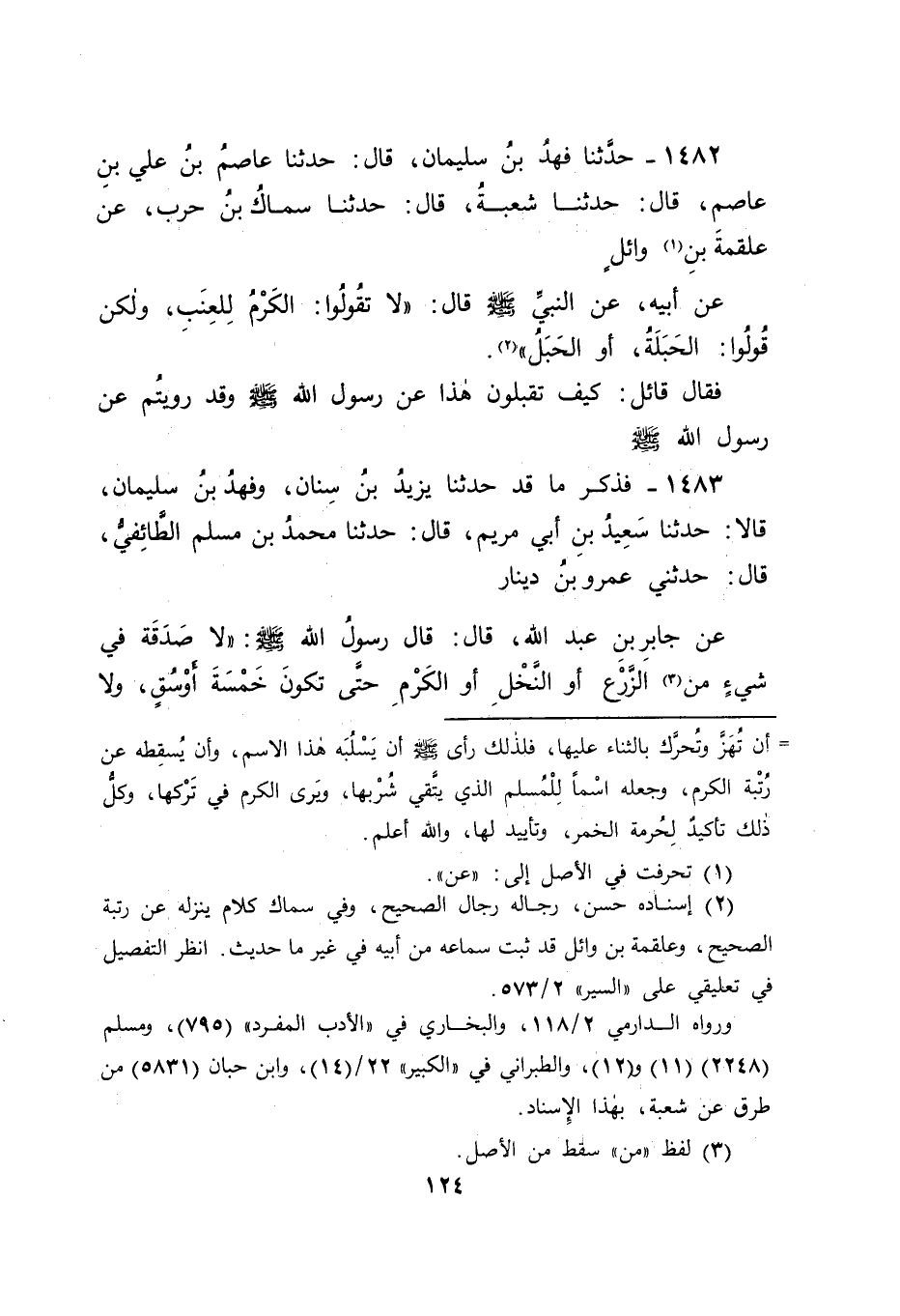 1482 - حَدَّثَنَا فَهْدُ بْنُ سُلَيْمَانَ , قَالَ: حَدَّثَنَا عَاصِمُ بْنُ عَلِيِّ بْنِ عَاصِمٍ , قَالَ: حَدَّثَنَا شُعْبَةُ , قَالَ حَدَّثَنَا سِمَاكُ بْنُ حَرْبٍ , عَنْ عَلْقَمَةَ بْنِ وَائِلٍ , عَنْ أَبِيهِ , عَنِ النَّبِيِّ صَلَّى اللَّهُ عَلَيْهِ وَسَلَّمَ قَالَ: " لَا تَقُولُوا: الْكَرْمُ لِلْعِنَبِ , وَلَكِنْ قُولُوا: الْحَبَلَةُ أَوِ الْحَبَلُ " فَقَالَ قَائِلٌ: كَيْفَ تَقْبَلُونَ هَذَا عَنْ رَسُولِ اللهِ صَلَّى اللَّهُ عَلَيْهِ وَسَلَّمَ وَقَدْ رَوَيْتُمْ عَنْ رَسُولِ اللهِ صَلَّى اللَّهُ عَلَيْهِ وَسَلَّمَ