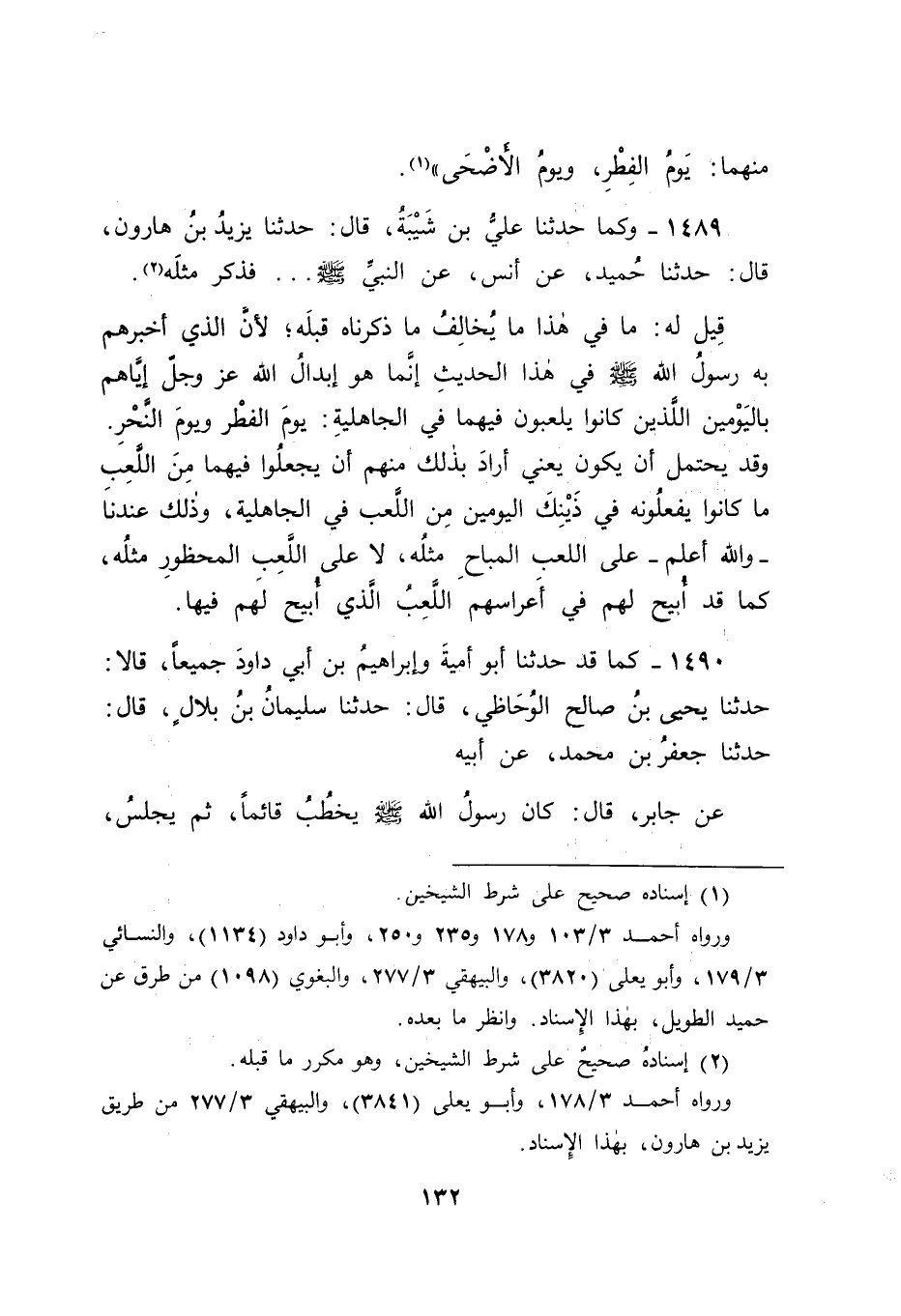 1490 - كَمَا قَدْ حَدَّثَنَا أَبُو أُمَيَّةَ , وَإِبْرَاهِيمُ بْنُ أَبِي دَاوُدَ , جَمِيعًا قَالَا: حَدَّثَنَا يَحْيَى بْنُ صَالِحٍ الْوُحَاظِيُّ , قَالَ: حَدَّثَنَا سُلَيْمَانُ بْنُ بِلَالٍ , قَالَ: حَدَّثَنَا جَعْفَرُ بْنُ مُحَمَّدٍ , عَنْ أَبِيهِ , عَنْ جَابِرٍ , قَالَ: " كَانَ رَسُولُ اللهِ صَلَّى اللَّهُ عَلَيْهِ وَسَلَّمَ يَخْطُبُ قَائِمًا ثُمَّ يَجْلِسُ، -[133]- ثُمَّ يَقُومُ فَيَخْطُبُ قَائِمًا خُطْبَتَيْنِ، فَكَانَ الْجَوَارِي إذَا نُكِحُوا يَمُرُّونَ بِالْكَبَرِ وَالْمَزَامِيرِ فَيَشْتَدُّ النَّاسُ وَيَدَعُوا رَسُولَ اللهِ صَلَّى اللَّهُ عَلَيْهِ وَسَلَّمَ قَائِمًا فَعَاتَبَهُمُ اللهُ عَزَّ وَجَلَّ فَقَالَ: {وَإِذَا رَأَوْا تِجَارَةً أَوْ لَهْوًا انْفَضُّوا إلَيْهَا وَتَرَكُوكَ قَائِمًا} [الجمعة: 11] " الْآيَةَ قَالَ أَبُو جَعْفَرٍ: أَفَلَا تَرَى أَنَّ اللهَ لَمْ يَنْهَهُمْ عَنِ اللهْوِ الَّذِي قَدْ أَبَاحَ مِثْلَهُ فِيمَا كَانَ ذَلِكَ اللهْوُ مِنْهُمْ فِيهِ، وَكَذَلِكَ اللَّعِبُ الَّذِي قَدْ أَبَاحَهُ فِي الْأَعْيَادِ غَيْرُ دَاخِلٍ فِي مِثْلِهِ مِنَ اللهْوِ الَّذِي قَدْ نَهَاهُمْ عَنْهُ فِي غَيْرِ الْأَعْيَادِ، فَبَانَ بِحَمْدِ اللهِ وَنِعْمَتِهِ أَنْ لَا تَضَادَّ فِي شَيْءٍ مِمَّا ذَكَرْنَاهُ مِنَ الْآثَارِ فِي هَذَا الْبَابِ عَنْ رَسُولِ اللهِ صَلَّى اللَّهُ عَلَيْهِ وَسَلَّمَ، وَاللهَ نَسْأَلُهُ التَّوْفِيقَ