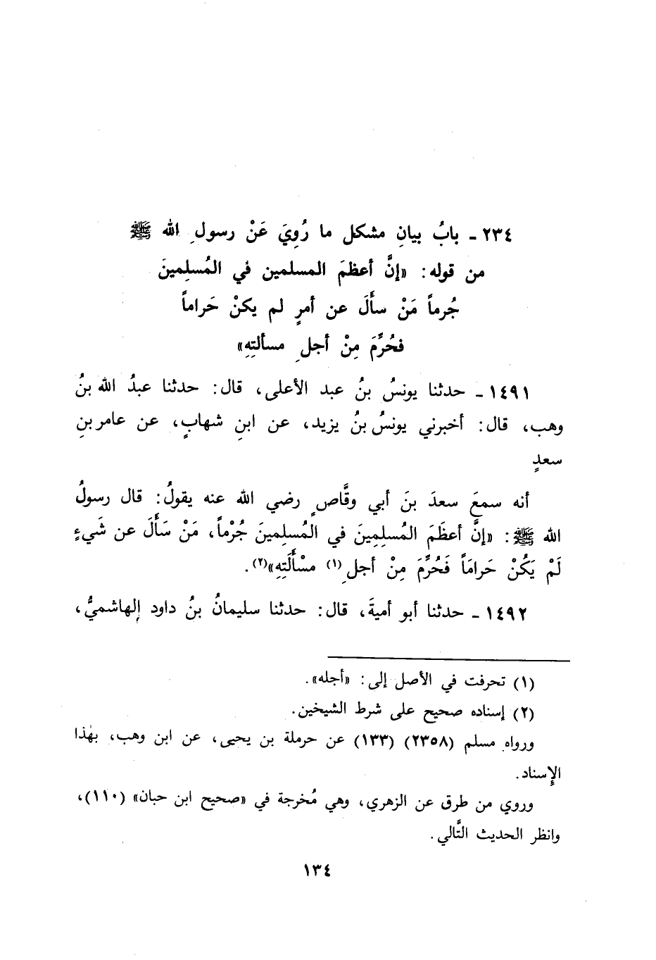 1491 - حَدَّثَنَا يُونُسُ بْنُ عَبْدِ الْأَعْلَى , قَالَ: حَدَّثَنَا عَبْدُ اللهِ بْنُ وَهْبٍ , قَالَ: أَخْبَرَنِي يُونُسُ بْنُ يَزِيدَ , عَنِ ابْنِ شِهَابٍ , عَنْ عَامِرِ بْنِ سَعْدٍ , أَنَّهُ سَمِعَ سَعْدَ بْنَ أَبِي وَقَّاصٍ , رَضِيَ اللهُ عَنْهُ يَقُولُ: قَالَ رَسُولُ اللهِ صَلَّى اللَّهُ عَلَيْهِ وَسَلَّمَ: " إنَّ أَعْظَمَ الْمُسْلِمِينَ فِي الْمُسْلِمِينَ جُرْمًا مَنْ سَأَلَ عَنْ شَيْءٍ لَمْ يَكُنْ حَرَامًا فَحُرِّمَ مِنْ أَجْلِ مَسْأَلَتِهِ "