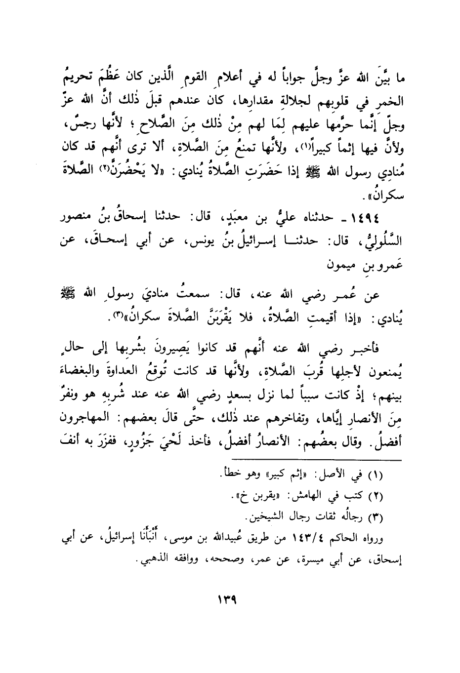 فَأَخْبَرَ رَضِيَ اللهُ عَنْهُ أَنَّهُمْ قَدْ كَانُوا يَصِيرُونَ بِشُرْبِهَا إلَى حَالٍ يُمْنَعُونَ لِأَجْلِهَا قُرْبَ الصَّلَاةِ؛ وَلِأَنَّهَا قَدْ كَانَتْ تُوقِعُ الْعَدَاوَةَ وَالْبَغْضَاءَ بَيْنَهُمْ إذْ كَانَتْ سَبَبًا لِمَا نَزَلَ بِسَعْدٍ رَضِيَ اللهُ عَنْهُ عِنْدَ شُرْبِهِ هُوَ وَنَفَرٌ مِنَ الْأَنْصَارِ إيَّاهَا وَتَفَاخُرِهِمْ عِنْدَ ذَلِكَ حَتَّى قَالَ بَعْضُهُمْ: الْمُهَاجِرُونَ أَفْضَلُ وَقَالَ بَعْضُهُمْ: الْأَنْصَارُ أَفْضَلُ فَأَخَذَ لَحْيَ جَزُورٍ فَفَزَرَ بِهِ أَنْفَ -[140]- سَعْدٍ فَكَانَ أَنْفُهُ مَفْزُورًا