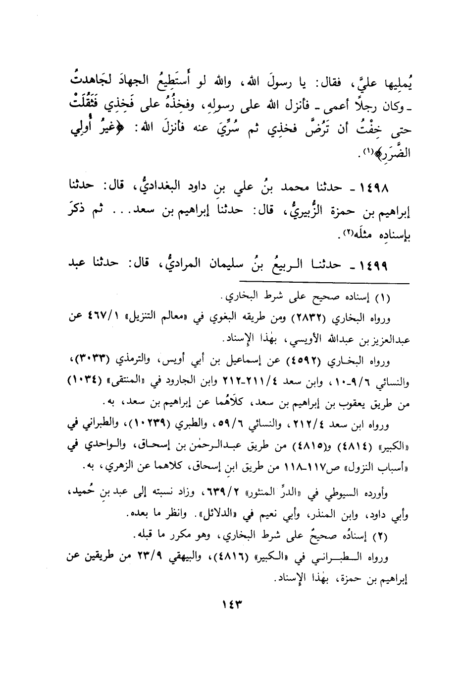 1499 - حَدَّثَنَا الرَّبِيعُ بْنُ سُلَيْمَانَ الْمُرَادِيُّ , قَالَ: حَدَّثَنَا عَبْدُ -[144]- اللهِ بْنُ وَهْبٍ , قَالَ: وَأَخْبَرَنِي عَبْدُ الرَّحْمَنِ بْنُ أَبِي الزِّنَادِ , عَنْ أَبِيهِ , عَنْ خَارِجَةَ بْنِ زَيْدِ بْنِ ثَابِتٍ , عَنْ أَبِيهِ , عَنْ رَسُولِ اللهِ صَلَّى اللَّهُ عَلَيْهِ وَسَلَّمَ " أَنَّ السَّكِينَةَ غَشِيَتْ رَسُولَ اللهِ صَلَّى اللَّهُ عَلَيْهِ وَسَلَّمَ قَالَ: زَيْدٌ: وَأَنَا إلَى جَنْبِهِ , فَوَقَعَتْ فَخِذُ رَسُولِ اللهِ صَلَّى اللَّهُ عَلَيْهِ وَسَلَّمَ عَلَى فَخِذِي فَمَا وَجَدْتُ ثِقَلَ شَيْءٍ هُوَ أَثْقَلُ مِنْ فَخِذِ رَسُولِ اللهِ صَلَّى اللَّهُ عَلَيْهِ وَسَلَّمَ، ثُمَّ سُرِّيَ عَنْهُ فَقَالَ لِي: اكْتُبْ {لَا يَسْتَوِي الْقَاعِدُونَ مِنَ الْمُؤْمِنِينَ} [النساء: 95] {وَالْمُجَاهِدُونَ فِي سَبِيلِ اللهِ بِأَمْوَالِهِمْ وَأَنْفُسِهِمْ} [النساء: 95] الْآيَةَ كُلَّهَا قَالَ زَيْدٌ فَكَتَبْتُ ذَلِكَ فِي كَتِفٍ، فَقَامَ ابْنُ أُمِّ مَكْتُومٍ وَكَانَ رَجُلًا أَعْمَى حِينَ سَمِعَ تَفْضِيلَهُ الْمُجَاهِدِينَ عَلَى الْقَاعِدِينَ فَقَالَ: يَا رَسُولَ اللهِ كَيْفَ بِمَنْ لَا يَسْتَطِيعُ الْجِهَادَ مِنَ الْمُؤْمِنِينَ؟ قَالَ خَارِجَةُ قَالَ زَيْدٌ: فَمَا قَضَى ابْنُ أُمِّ مَكْتُومٍ كَلَامَهُ أَوْ قَالَ: فَمَا هُوَ إلَّا أَنْ قَضَى كَلَامَهُ فَغَشِيَتْ رَسُولَ اللهِ صَلَّى اللَّهُ عَلَيْهِ وَسَلَّمَ السَّكِينَةُ فَوَقَعَتْ فَخِذُهُ عَلَى فَخِذِي، فَوَجَدْتُ مِنْ ثِقَلِهَا الْمَرَّةَ الثَّانِيَةَ مِثْلَ مَا وَجَدْتُ مِنْهَا فِي الْمَرَّةِ الْأُولَى ثُمَّ سُرِّيَ عَنْ رَسُولِ اللهِ صَلَّى اللَّهُ عَلَيْهِ وَسَلَّمَ، فَقَالَ: " اقْرَأْ " فَقَرَأْتُ: {لَا يَسْتَوِي الْقَاعِدُونَ مِنَ الْمُؤْمِنِينَ} [النساء: 95] {وَالْمُجَاهِدُونَ} [النساء: 95] فَقَالَ رَسُولُ اللهِ صَلَّى اللَّهُ عَلَيْهِ وَسَلَّمَ: {غَيْرُ أُولِي الضَّرَرِ} [النساء: 95] فَأَلْحَقْتُهَا فَكَأَنِّي أَنْظُرُ إلَى مُلْحَقِهَا عِنْدَ صَدْعٍ مِنَ الْكَتِفِ "