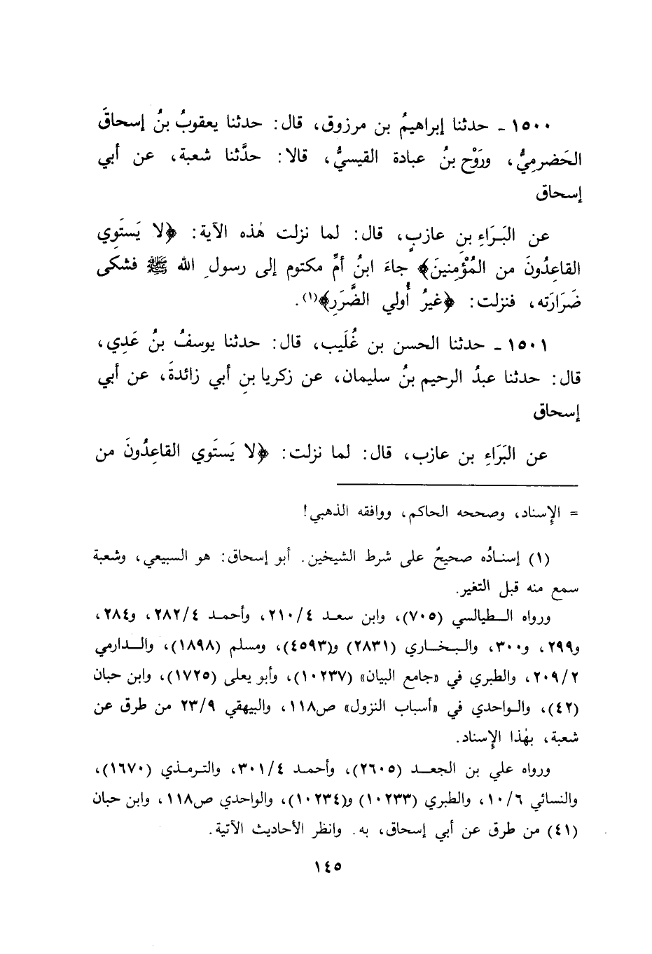 1500 - حَدَّثَنَا إبْرَاهِيمُ بْنُ مَرْزُوقٍ , قَالَ: حَدَّثَنَا يَعْقُوبُ بْنُ إِسْحَاقَ الْحَضْرَمِيُّ , وَرَوْحُ بْنُ عُبَادَةَ الْقَيْسِيُّ , قَالَا: حَدَّثَنَا شُعْبَةُ , عَنْ أَبِي إِسْحَاقَ , عَنِ الْبَرَاءِ بْنِ عَازِبٍ , قَالَ: " لَمَّا نَزَلَتْ هَذِهِ الْآيَةُ {لَا يَسْتَوِي الْقَاعِدُونَ مِنَ الْمُؤْمِنِينَ} [النساء: 95] جَاءَ ابْنُ أُمِّ مَكْتُومٍ إلَى رَسُولِ اللهِ صَلَّى اللَّهُ عَلَيْهِ وَسَلَّمَ فَشَكَا ضَرَارَتَهُ فَنَزَلَتْ {غَيْرُ أُولِي الضَّرَرِ} [النساء: 95]