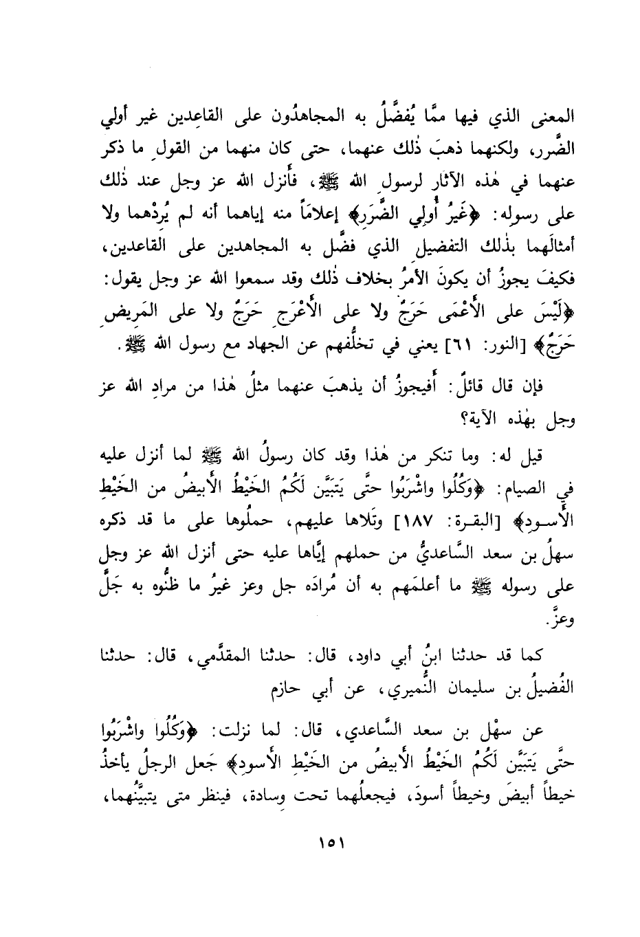 كَمَا قَدْ حَدَّثَنَا ابْنُ أَبِي دَاوُدَ قَالَ: حَدَّثَنَا الْمُقَدَّمِيُّ، قَالَ: حَدَّثَنَا الْفُضَيْلُ بْنُ سُلَيْمَانَ النُّمَيْرِيُّ، عَنْ أَبِي حَازِمٍ، عَنْ سَهْلِ بْنِ سَعْدٍ السَّاعِدِيُّ قَالَ: " لَمَّا نَزَلَتْ {وَكُلُوا وَاشْرَبُوا حَتَّى يَتَبَيَّنَ لَكُمُ الْخَيْطُ الْأَبْيَضُ مِنَ الْخَيْطِ الْأَسْوَدِ} [البقرة: 187] جَعَلَ الرَّجُلُ يَأْخُذُ خَيْطًا أَبْيَضَ وَخَيْطًا أَسْوَدَ فَيَجْعَلُهُمَا تَحْتَ وِسَادَةٍ فَيَنْظُرُ مَتَى يَتَبَيَّنُهُمَا -[152]- فَيَتْرُكُ الطَّعَامَ قَالَ: فَبَيَّنَ اللهُ تَعَالَى ذَلِكَ وَنَزَلَتْ {مِنَ الْفَجْرِ} [البقرة: 187] " فَكَانَ فِي هَذَا الْحَدِيثِ تِبْيَانُ اللهِ أَنَّ الَّذِي أَرَادَ بِالْخَيْطِ الْأَبْيَضِ وَالْخَيْطِ الْأَسْوَدِ غَيْرُ الَّذِي ظَنُّوا أَنَّهُ أَرَادَهُ بِهِمَا، وَكَذَلِكَ عَدِيُّ بْنُ حَاتِمٍ الطَّائِيُّ فِيمَا رُوِيَ عَنْهُ فِي هَذَا الْمَعْنَى