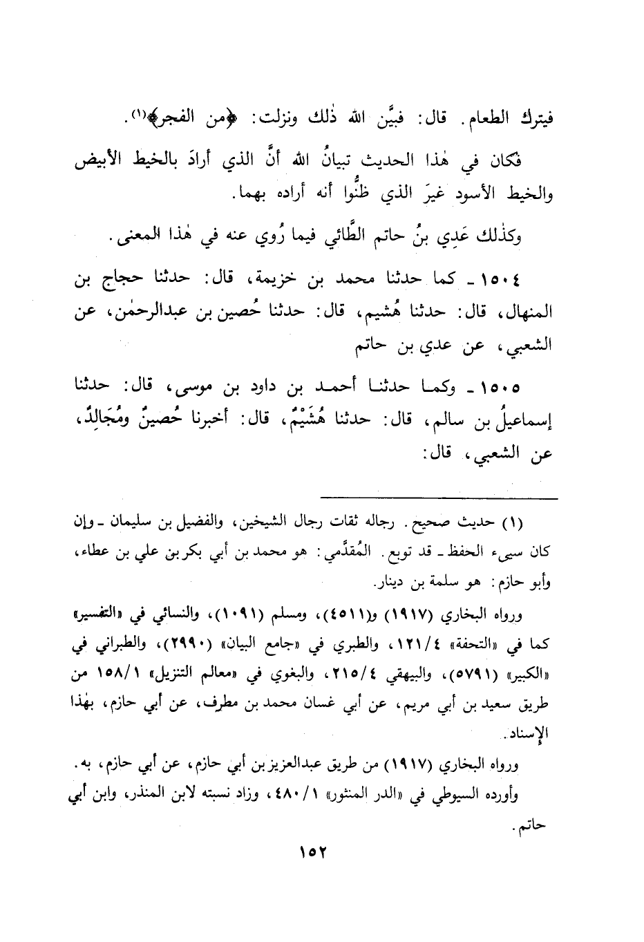 1504 - كَمَا حَدَّثَنَا مُحَمَّدُ بْنُ خُزَيْمَةَ , قَالَ: حَدَّثَنَا حَجَّاجُ بْنُ الْمِنْهَالِ , قَالَ: حَدَّثَنَا هُشَيْمٌ , قَالَ: حَدَّثَنَا حُصَيْنُ بْنُ عَبْدِ الرَّحْمَنِ , عَنِ الشَّعْبِيِّ , عَنْ عَدِيِّ بْنِ حَاتِمٍ ,