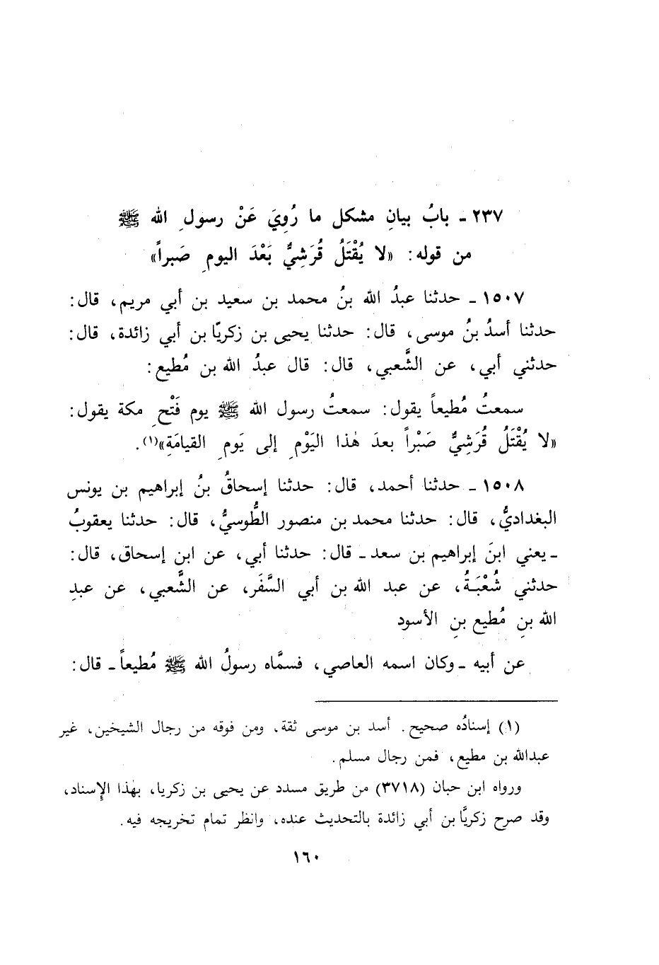 1508 - حَدَّثَنَا أَحْمَدُ , قَالَ: حَدَّثَنَا إِسْحَاقُ بْنُ إبْرَاهِيمَ بْنِ يُونُسَ الْبَغْدَادِيُّ , قَالَ: حَدَّثَنَا مُحَمَّدُ بْنُ مَنْصُورٍ الطُّوسِيُّ , قَالَ: حَدَّثَنَا يَعْقُوبُ يَعْنِي ابْنَ إبْرَاهِيمَ بْنِ سَعْدٍ قَالَ: حَدَّثَنَا أَبِي , عَنِ ابْنِ إِسْحَاقَ , قَالَ: حَدَّثَنِي شُعْبَةُ , عَنْ عَبْدِ اللهِ بْنِ أَبِي السَّفَرِ , عَنِ الشَّعْبِيِّ , عَنْ عَبْدِ اللهِ بْنِ مُطِيعِ بْنِ الْأَسْوَدِ , عَنْ أَبِيهِ , وَكَانَ اسْمُهُ الْعَاصِيَ فَسَمَّاهُ رَسُولُ اللهِ صَلَّى اللَّهُ عَلَيْهِ وَسَلَّمَ مُطِيعًا قَالَ: -[161]- سَمِعْتُ رَسُولَ اللهِ صَلَّى اللَّهُ عَلَيْهِ وَسَلَّمَ حِينَ أَمَرَ بِقَتْلِ هَؤُلَاءِ الرَّهْطِ بِمَكَّةَ يَقُولُ: " لَا تُغْزَى مَكَّةُ بَعْدَ هَذَا الْعَامِ أَبَدًا , وَلَا يُقْتَلُ رَجُلٌ مِنْ قُرَيْشٍ صَبْرًا بَعْدَ الْعَامِ " قَالَ أَبُو جَعْفَرٍ: فَكَانَ هَذَا الْقَوْلُ مِنْ رَسُولِ اللهِ صَلَّى اللَّهُ عَلَيْهِ وَسَلَّمَ مَا لَمْ يَذْكُرْ لَنَا فِيهِ مَنْ رَوَى لَنَا هَذَا الْحَدِيثَ لَفْظَ رَسُولِ اللهِ صَلَّى اللَّهُ عَلَيْهِ وَسَلَّمَ بِهِ مُعْرَبًا، وَذَلِكَ مِمَّا يَقَعُ فِيهِ الْإِشْكَالُ ; لِأَنَّهُ إنْ كَانَ لَا يُقْتَلُ بِالْحَرَمِ كَانَ ذَلِكَ عَلَى الْأَمْرِ، وَفِي ذَلِكَ خِلَافٌ لِأَحْكَامِ اللهِ عَزَّ وَجَلَّ الْمَذْكُورَةِ فِي غَيْرِ هَذَا الْحَدِيثِ ; لِأَنَّ أَحْكَامَ اللهِ عَزَّ وَجَلَّ أَنَّ الْقُرَشِيَّ يُقْتَلُ قَوَدًا إذَا قَتَلَ عَمْدًا، وَأَنَّهُ يُرْجَمُ إذَا زَنَى مُحْصَنًا وَحَاشَ لِلَّهِ عَزَّ وَجَلَّ أَنْ يَكُونَ لَفْظُ رَسُولِ اللهِ صَلَّى اللَّهُ عَلَيْهِ وَسَلَّمَ بِذَلِكَ الْحَرْفِ يَخْرُجُ مِنْ هَذِهِ الْأَحْكَامِ، وَلَكِنَّهُ عِنْدَنَا وَاللهُ أَعْلَمُ لَا يُقْتَلُ مَرْفُوعًا فَيَكُونُ ذَلِكَ عَلَى الْخَبَرِ كَمِثْلِ مَا قَدْ ذَكَرْنَاهُ فِيمَا تَقَدَّمَ مِنَّا فِي كِتَابِنَا هَذَا عَنْ رَسُولِ اللهِ صَلَّى اللَّهُ عَلَيْهِ وَسَلَّمَ مِنْ قَوْلِهِ " لَا يُلْدَغُ مُؤْمِنٌ مِنْ جُحْرٍ مَرَّتَيْنِ " وَأَتَيْنَا فِي ذَلِكَ بِمَا يُوجِبُ أَنَّهُ عَلَى الْخَبَرِ لَا عَلَى الْأَمْرِ فَغَنِينَا بِذَلِكَ عَنْ إعَادَتِهِ هَاهُنَا -[162]- فَقَالَ قَائِلٌ: فَقَدْ رَأَيْنَا مَنْ لَا يُحْصَى عَدَدُهُ مِنْ قُرَيْشٍ قَدْ قُتِلُوا فِي الْإِسْلَامِ صَبْرًا وَنَحْنُ نَعْلَمُ أَنَّ رَسُولَ اللهِ صَلَّى اللَّهُ عَلَيْهِ وَسَلَّمَ لَا خُلْفَ لِقَوْلِهِ فَكَانَ جَوَابَنَا لَهُ فِي ذَلِكَ بِتَوْفِيقِ وَجَلَّ وَعَوْنِهِ أَنَّ مُرَادَهُ صَلَّى اللَّهُ عَلَيْهِ وَسَلَّمَ بِقَوْلِهِ " لَا يُقْتَلُ قُرَشِيٌّ بَعْدَ الْعَامِ صَبْرًا " إنَّمَا هُوَ أَنَّهُ لَا يُقْتَلُ بَعْدَ ذَلِكَ الْعَامِ قُرَشِيٌّ صَبْرًا عَلَى مَا أَبَاحَ مِنْ قَتْلِ الْأَرْبَعَةِ الْقُرَشِيِّينَ الْمَذْكُورِينَ فِي حَدِيثِ سَعْدٍ عَلَيْهِ عَامَئِذٍ ; لِأَنَّهُ كَانَ قَتْلًا عَلَى مُحَارَبَةٍ , قُتِلَ مَنْ قُتِلَ مِنْهُمْ فِيهَا عَلَى الْكُفْرِ، وَذَلِكَ بِحَمْدِ اللهِ لَمْ يَكُنْ مِنْ عَامَئِذٍ فِي قُرَشِيٍّ بَعْدَ ذَلِكَ الْعَامِ عَادَ كَافِرًا مُحَارِبًا لِلَّهِ وَرَسُولِهِ فِي دَارِ كُفْرٍ إلَى يَوْمِنَا هَذَا , وَلَا يَكُونُ ذَلِكَ إلَى يَوْمِ الْقِيَامَةِ ; لِأَنَّ اللهَ عَزَّ وَجَلَّ لَا يُخْلِفُ وَعْدَهُ رُسُلَهُ وَمِمَّا قَدْ دَلَّ عَلَى مَا قُلْنَا مِنْ ذَلِكَ مَا قَدْ رُوِيَ عَنْ رَسُولِ اللهِ صَلَّى اللَّهُ عَلَيْهِ وَسَلَّمَ فِي غَيْرِ هَذَا الْحَدِيثِ فِي مَكَّةَ