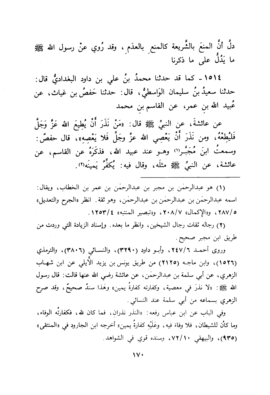 1514 - كَمَا قَدْ حَدَّثَنَا مُحَمَّدُ بْنُ عَلِيِّ بْنِ دَاوُدَ الْبَغْدَادِيُّ , قَالَ حَدَّثَنَا سَعِيدُ بْنُ سُلَيْمَانَ الْوَاسِطِيُّ , قَالَ حَدَّثَنَا حَفْصُ بْنُ غِيَاثٍ , عَنْ عُبَيْدِ اللهِ بْنِ عُمَرَ , عَنِ الْقَاسِمِ بْنِ مُحَمَّدٍ , عَنْ عَائِشَةَ , عَنِ النَّبِيِّ صَلَّى اللَّهُ عَلَيْهِ وَسَلَّمَ قَالَ: " مَنْ نَذَرَ أَنْ يُطِيعَ اللهَ عَزَّ وَجَلَّ فَلْيُطِعْهُ، وَمَنْ نَذَرَ أَنْ يَعْصِيَ اللهَ عَزَّ وَجَلَّ فَلَا يَعْصِهِ " قَالَ حَفْصٌ وَسَمِعْتُ ابْنَ مُجَبَّرٍ وَهُوَ عِنْدَ عُبَيْدِ اللهِ فَذَكَرَهُ عَنِ الْقَاسِمِ عَنْ عَائِشَةَ عَنِ النَّبِيِّ صَلَّى اللَّهُ عَلَيْهِ وَسَلَّمَ مِثْلَهُ، وَقَالَ فِيهِ يُكَفِّرُ يَمِينَهُ -[171]- قَالَ أَبُو جَعْفَرٍ: وَهَذَا الْحَدِيثُ فِي الْحَقِيقَةِ لَمْ يَسْمَعْهُ عُبَيْدُ اللهِ بْنُ عُمَرَ مِنَ الْقَاسِمِ وَإِنَّمَا أَخَذَهُ عَنْ طَلْحَةَ بْنِ عَبْدِ الْمَلِكِ الْأَيْلِيِّ عَنِ الْقَاسِمِ عَنْ عَائِشَةَ