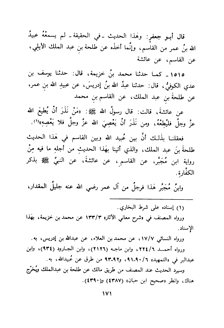 1515 - كَمَا حَدَّثَنَا مُحَمَّدُ بْنُ خُزَيْمَةَ , قَالَ حَدَّثَنَا يُوسُفُ بْنُ عَدِيٍّ الْكُوفِيُّ , قَالَ حَدَّثَنَا عَبْدُ اللهِ بْنُ إدْرِيسَ , عَنْ عُبَيْدِ اللهِ بْنِ عُمَرَ , عَنْ طَلْحَةَ بْنِ عَبْدِ الْمَلِكِ , عَنِ الْقَاسِمِ بْنِ مُحَمَّدٍ , عَنْ عَائِشَةَ , قَالَتْ: قَالَ رَسُولُ اللهِ صَلَّى اللَّهُ عَلَيْهِ وَسَلَّمَ: " مَنْ نَذَرَ أَنْ يُطِيعَ اللهَ عَزَّ وَجَلَّ فَلْيُطِعْهُ، وَمَنْ نَذَرَ أَنْ يَعْصِيَ اللهَ عَزَّ وَجَلَّ فَلَا يَعْصِهِ " فَعَقَلْنَا بِذَلِكَ أَنَّ بَيْنَ عُبَيْدِ اللهِ وَبَيْنَ الْقَاسِمِ فِي هَذَا الْحَدِيثِ طَلْحَةَ بْنَ عَبْدِ الْمَلِكِ وَالَّذِي أَتَيْنَا بِهَذَا الْحَدِيثِ مِنْ أَجْلِهِ مَا فِيهِ مِنْ رِوَايَةِ ابْنِ مُجَبَّرٍ عَنِ الْقَاسِمِ عَنْ عَائِشَةَ عَنِ النَّبِيِّ صَلَّى اللَّهُ عَلَيْهِ وَسَلَّمَ بِذِكْرِ الْكَفَّارَةِ وَابْنُ مُجَبَّرٍ هَذَا فَرَجُلٌ مِنْ آلِ عُمَرَ رَضِيَ اللهُ عَنْهُ جَلِيلُ الْمِقْدَارِ، -[172]- وَقَدْ رَوَى عَنْهُ مَالِكُ بْنُ أَنَسٍ رَضِيَ اللهُ عَنْهُ، وَلَهُ ابْنٌ يُتَكَلَّمُ فِي حَدِيثِهِ قَدْ رَوَى عَنْهُ الْمُتَأَخِّرُونَ وَإِذَا كَانَ مَنْ نَذَرَ أَنْ يَعْصِيَ اللهَ عَزَّ وَجَلَّ مَأْمُورًا بِالْكَفَّارَةِ مِمَّا تَمْنَعُهُ مِنْهُ الشَّرِيعَةُ كَانَ مَنْ نَذَرَ مَا تُطْلِقُهُ لَهُ الشَّرِيعَةُ ثُمَّ مَنَعَتْهُ مِنْهُ الشَّرِيعَةُ بَعْدَ ذَلِكَ بِالْكَفَّارَةِ عَنْ نَذْرِهِ الَّذِي عَجَزَ عَنِ الْوَفَاءِ بِهِ أَوْلَى وَاللهُ الْمُوَفِّقُ