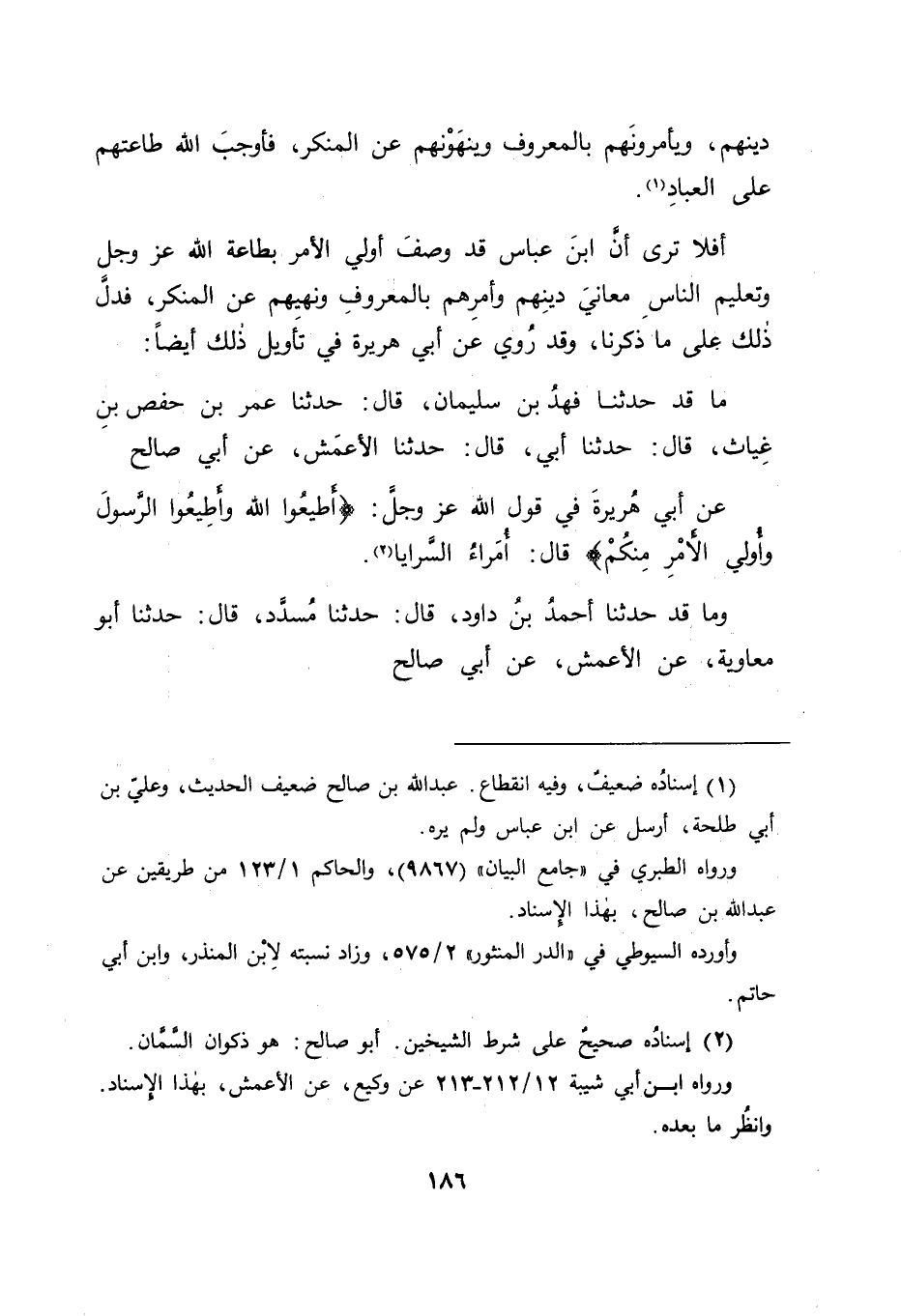 وَمَا قَدْ حَدَّثَنَا أَحْمَدُ بْنُ دَاوُدَ قَالَ: حَدَّثَنَا مُسَدَّدٌ قَالَ: حَدَّثَنَا أَبُو مُعَاوِيَةَ عَنِ الْأَعْمَشِ عَنْ أَبِي صَالِحٍ -[187]- عَنْ أَبِي هُرَيْرَةَ {وَأُولِي الْأَمْرِ مِنْكُمْ} [النساء: 59] قَالَ: " هُمُ الْأُمَرَاءُ " قَالَ أَبُو جَعْفَرٍ: فَدَلَّ ذَلِكَ أَنَّ أُولِي الْأَمْرِ الْمَأْمُورِ بِطَاعَتِهِمْ هُمْ مَنْ هَذِهِ صِفَتُهُ أُمَرَاءَ كَانُوا أَوْ غَيْرَ أُمَرَاءَ , وَاللهَ نَسْأَلُهُ التَّوْفِيقَ