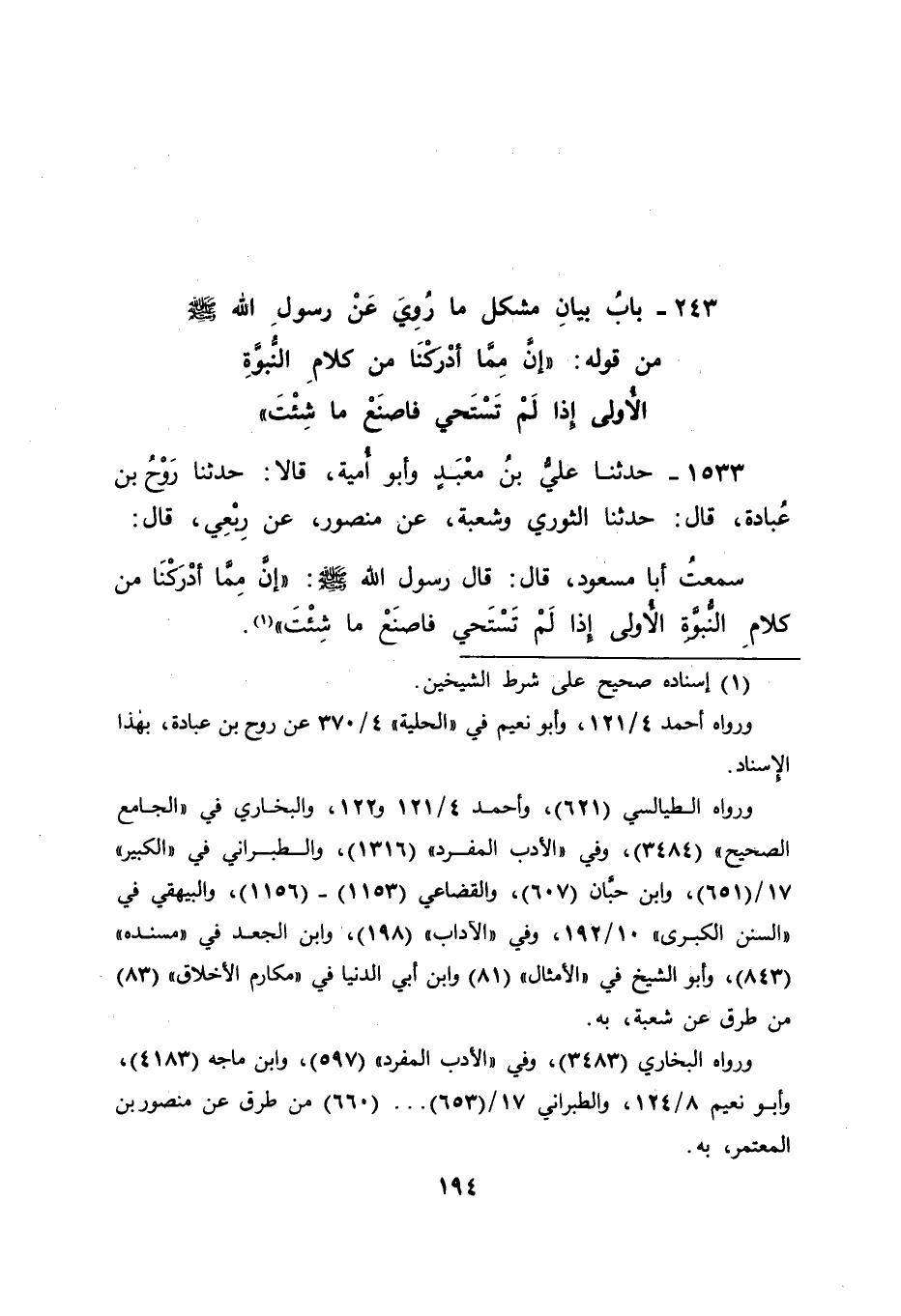 1533 - حَدَّثَنَا عَلِيُّ بْنُ مَعْبَدٍ , وَأَبُو أُمَيَّةَ قَالَا: حَدَّثَنَا رَوْحُ بْنُ عُبَادَةَ , قَالَ: حَدَّثَنَا الثَّوْرِيُّ , وَشُعْبَةُ , عَنْ مَنْصُورٍ , عَنْ رِبْعِيٍّ , قَالَ: سَمِعْتُ أَبَا مَسْعُودٍ , قَالَ: قَالَ رَسُولُ اللهِ صَلَّى اللَّهُ عَلَيْهِ وَسَلَّمَ: " إنَّ مِمَّا أَدْرَكْنَا مِنْ كَلَامِ النُّبُوَّةِ الْأُولَى إذَا لَمْ تَسْتَحْيِ فَاصْنَعْ مَا شِئْتَ " -[195]-