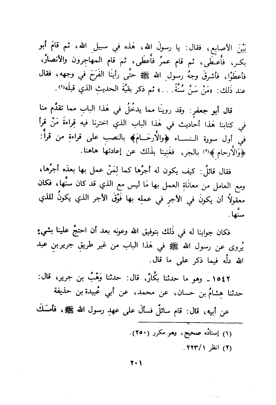 1542 - وَهُوَ مَا حَدَّثَنَا بَكَّارٌ , قَالَ: حَدَّثَنَا وَهْبُ بْنُ جَرِيرٍ , قَالَ: حَدَّثَنَا هِشَامُ بْنُ حَسَّانَ , عَنْ مُحَمَّدٍ , عَنْ أَبِي عُبَيْدَةَ بْنِ حُذَيْفَةَ , عَنْ أَبِيهِ , قَالَ: قَامَ سَائِلٌ فَسَأَلَ عَلَى عَهْدِ رَسُولِ اللهِ صَلَّى اللَّهُ عَلَيْهِ وَسَلَّمَ فَأَمْسَكَ -[202]- الْقَوْمُ ثُمَّ إنَّ رَجُلًا مِنَ الْقَوْمِ أَعْطَى وَأَعْطَى الْقَوْمُ، فَقَالَ رَسُولُ اللهِ صَلَّى اللَّهُ عَلَيْهِ وَسَلَّمَ: " " مَنْ سَنَّ خَيْرًا فَاسْتُنَّ بِهِ فَلَهُ أَجْرُهُ وَمِنْ أُجُورِ مَنْ تَبِعَهُ غَيْرَ مُنْتَقَصٍ مِنْ أُجُورِهِمْ شَيْئًا , وَمَنْ سَنَّ شَرًّا فَاسْتُنَّ بِهِ فَعَلَيْهِ وِزْرُهُ وَمِنْ أَوْزَارِ مَنِ اتَّبَعَهُ غَيْرَ مُنْتَقَصٍ مِنْ أَوْزَارِهِمْ شَيْئًا " " فَكَانَ جَوَابَنَا لَهُ فِي ذَلِكَ بِتَوْفِيقِ اللهِ وَعَوْنِهِ أَنَّهُ قَدْ يَحْتَمِلُ أَنْ يَكُونَ الْمُرَادُ بِقَوْلِهِ " " وَمِثْلُ أَجْرِ مَنْ عَمِلَ بِهَا " " وَقَوْلِهِ صَلَّى اللَّهُ عَلَيْهِ وَسَلَّمَ: وَمِنْ أَجْرِ مَنْ عَمِلَ بِهَا بِمَعْنًى وَاحِدٍ وَتَكُونُ مِنْ صِلَةً، وَهَذَا جَائِزٌ فِي اللُّغَةِ، وَمِنْهُ قَوْلُ اللهِ عَزَّ وَجَلَّ {هَلْ مِنْ خَالِقٍ غَيْرُ اللهِ} [فاطر: 3] بِمَعْنَى هَلْ خَالِقٌ غَيْرُ اللهِ، وَمِنْهُ قَوْلُهُ عَزَّ وَجَلَّ {وَمَا مِنْ إلَهٍ إلَّا اللهُ} [آل عمران: 62] بِمَعْنَى وَمَا إلَهٌ إلَّا اللهُ فَيَرْجِعُ مَعْنَى قَوْلِ النَّبِيِّ صَلَّى اللَّهُ عَلَيْهِ وَسَلَّمَ وَمِنْ أُجُورِ مَنْ عَمِلَ بِهَا فِي حَدِيثِ حُذَيْفَةَ إلَى مَعْنَى وَأُجُورِ مَنْ عَمِلَ بِهَا فِي حَدِيثِ جَرِيرٍ فَيَتَّفِقَانِ وَلَا يَتَضَادَّانِ فَقَالَ هَذَا الْقَائِلُ: فَقَدْ رُوِيَ عَنْ عَبْدِ اللهِ بْنِ مَسْعُودٍ مَا يَدُلُّ عَلَى خِلَافِ مَا ذَكَرْتُ وَذَكَرَ