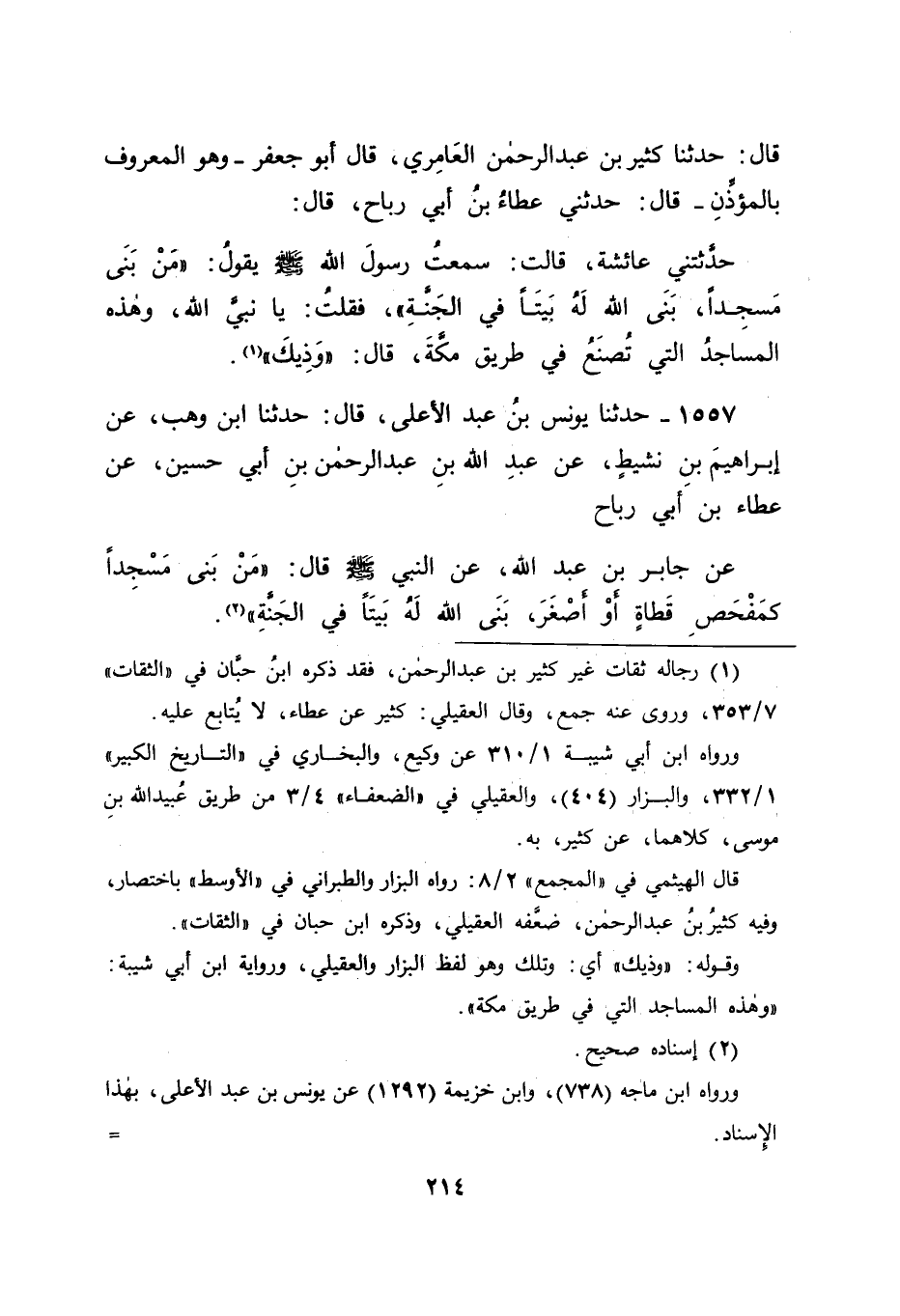 1557 - حَدَّثَنَا يُونُسُ بْنُ عَبْدِ الْأَعْلَى , قَالَ: حَدَّثَنَا ابْنُ وَهْبٍ , عَنْ إبْرَاهِيمَ بْنِ نَشِيطٍ , عَنْ عَبْدِ اللهِ بْنِ عَبْدِ الرَّحْمَنِ بْنِ أَبِي حُسَيْنٍ , عَنْ عَطَاءِ بْنِ أَبِي رَبَاحٍ , عَنْ جَابِرِ بْنِ عَبْدِ اللهِ , عَنِ النَّبِيِّ صَلَّى اللَّهُ عَلَيْهِ وَسَلَّمَ قَالَ: " مَنْ بَنَى مَسْجِدًا كَمَفْحَصِ قَطَاةٍ أَوْ أَصْغَرَ بَنَى اللهُ لَهُ بَيْتًا فِي الْجَنَّةِ " -[215]- فَقَالَ قَائِلٌ: فَقَدْ جَاءَ هَذَا الْحَدِيثُ مُضْطَرِبًا فَبَعْضُهُمْ رَوَاهُ " بَنَى اللهُ لَهُ بَيْتًا فِي الْجَنَّةِ " وَبَعْضُهُمْ رَوَاهُ " بَنَى اللهُ لَهُ مَسْجِدًا فِي الْجَنَّةِ " وَهَذَا اضْطِرَابٌ مِنَ الرُّوَاةِ فَكَانَ جَوَابَنَا لَهُ فِي ذَلِكَ: أَنَّ هَذَا لَيْسَ بِاضْطِرَابٍ مِنْهُمْ رُضْوَانُ اللهِ عَلَيْهِمْ وَقَدْ كَانَ يَنْبَغِي لَكَ أَنْ تَجْعَلَ مَا رَوَاهُ الْجَمَاعَةُ أَوْلَى مِمَّا رَوَى الْوَاحِدُ حَتَّى تَصِحَّ الْآثَارُ فِي ذَلِكَ، وَلَا تَتَضَادَّ فَإِذْ لَمْ تَفْعَلْ ذَلِكَ وَاللهُ عَزَّ وَجَلَّ الْمُسْتَعَانُ فَإِنَّ ذَلِكَ عِنْدَنَا بِمَعْنًى قَدْ ذَهَبَ عَلَيْكَ الْمُرَادُ بِهِ؛ لِأَنَّ الْمَسَاجِدَ إنَّمَا تُبْنَى بُيُوتًا، ثُمَّ تَعُودُ مَسَاجِدَ بِالصَّلَاةِ فِيهَا وَهِيَ قَبْلَ الصَّلَاةِ فِيهَا بُيُوتٌ لَا مَسَاجِدُ وَإِنْ كَانَ الَّذِينَ بَنَوْهَا بُيُوتًا أَرَادُوا أَنْ تَكُونَ مَسَاجِدَ، فَإِنَّهَا لَا تَكُونُ كَذَلِكَ حَتَّى يُصَلَّى فِيهَا فَتَكُونَ بُيُوتًا مَسَاجِدَ وَإِذَا كَانَ ذَلِكَ كَذَلِكَ فِي الدُّنْيَا جَازَ أَنْ يَكُونَ مَا يُثِيبُ اللهُ عَزَّ وَجَلَّ بِهِ مَنْ بَنَى مَسْجِدًا فِي الدُّنْيَا أَنْ يَبْنِيَ لَهُ فِي الْجَنَّةِ ثَوَابًا لِذَلِكَ الْمَسْجِدِ مَا يُرَادُ بِهِ ثَوَابُ مَا بَنَى فِي الدُّنْيَا , وَمَا بَنَى فِي الدُّنْيَا لَمْ يَكُنْ مَسْجِدًا بِبِنَائِهِ إيَّاهُ يُرِيدُ بِهِ الْمَسْجِدَ حَتَّى صَلَّى الْمُسْلِمُونَ فِيهِ , وَمَا بَنَى اللهُ لَهُ فِي الْجَنَّةِ ثَوَابًا عَلَيْهِ لَيْسَ مِمَّا يُصَلَّى فِيهِ فِي الْجَنَّةِ؛ لِأَنَّ الْجَنَّةَ لَيْسَتْ بِدَارِ عَمَلٍ، وَإِنَّمَا هِيَ دَارُ جَزَاءٍ , فَبَقِيَ بَعْدَ بِنَاءِ اللهِ عَزَّ وَجَلَّ إيَّاهُ لَهُ بِمِثْلِ اسْمِ الْمَسْجِدِ الَّذِي بَنَى فِي الدُّنْيَا قَبْلَ صَلَاةِ -[216]- النَّاسِ فِيهِ وَهُوَ بَيْتٌ عَلَى مَا فِي الْأَحَادِيثِ الْأُخَرِ " مَنْ بَنَى لِلَّهِ بَيْتًا بَنَى الله عَزَّ وَجَلَّ لَهُ بَيْتًا فِي الْجَنَّةِ " فَلَمْ يَكُنْ بِحَمْدِ اللهِ فِي شَيْءٍ مِمَّا رُوِيَ فِي هَذَا الْبَابِ تَضَادٌّ وَلَا اخْتِلَافَ , وَاللهَ نَسْأَلُهُ التَّوْفِيقَ
