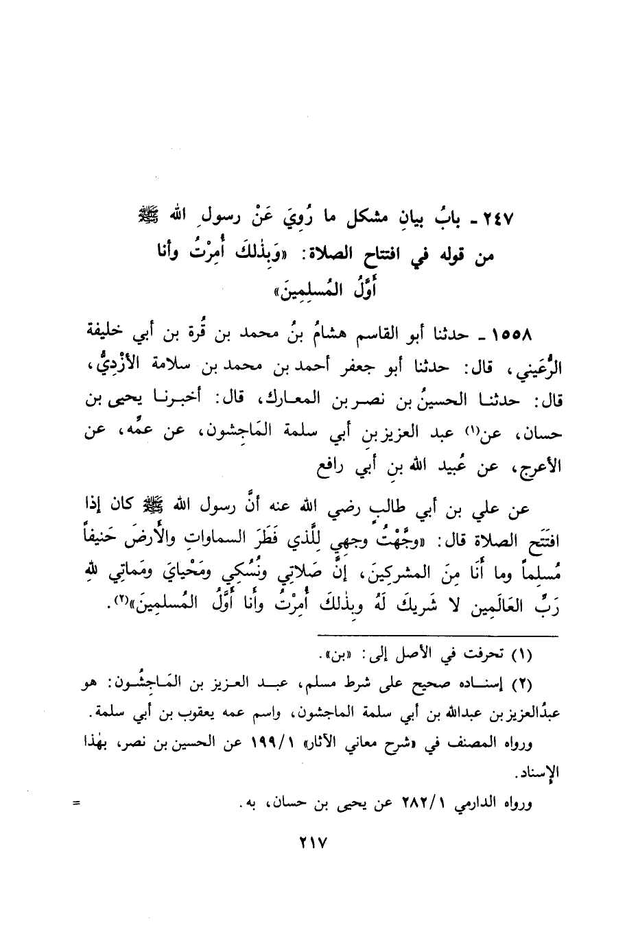 1558 - حَدَّثَنَا أَبُو الْقَاسِمِ هِشَامُ بْنُ مُحَمَّدِ بْنِ قُرَّةَ بْنِ أَبِي خَلِيفَةَ الرُّعَيْنِيُّ , قَالَ: حَدَّثَنَا أَبُو جَعْفَرٍ أَحْمَدُ بْنُ مُحَمَّدِ بْنِ سَلَامَةَ الْأَزْدِيُّ قَالَ: حَدَّثَنَا الْحُسَيْنُ بْنُ نَصْرِ بْنِ الْمُعَارِكِ , قَالَ: أَخْبَرَنَا يَحْيَى بْنُ حَسَّانَ , عَنْ عَبْدِ الْعَزِيزِ بْنِ أَبِي سَلَمَةَ الْمَاجِشُونِ , عَنْ عَمِّهِ , عَنِ الْأَعْرَجِ , عَنْ عُبَيْدِ اللهِ بْنِ أَبِي رَافِعٍ , عَنْ عَلِيِّ بْنِ أَبِي طَالِبٍ , رَضِيَ اللهُ عَنْهُ , أَنَّ رَسُولَ اللهِ صَلَّى اللَّهُ عَلَيْهِ وَسَلَّمَ كَانَ إذَا افْتَتَحَ الصَّلَاةَ قَالَ: " وَجَّهْتُ وَجْهِيَ لِلَّذِي فَطَرَ السَّمَوَاتِ وَالْأَرْضَ حَنِيفًا مُسْلِمًا وَمَا أَنَا مِنَ الْمُشْرِكِينَ إنَّ صَلَاتِي وَنُسُكِي وَمَحْيَايَ وَمَمَاتِي لِلَّهِ رَبِّ الْعَالَمِينَ لَا شَرِيكَ لَهُ وَبِذَلِكَ أُمِرْتُ وَأَنَا أَوَّلُ الْمُسْلِمِينَ " -[218]-