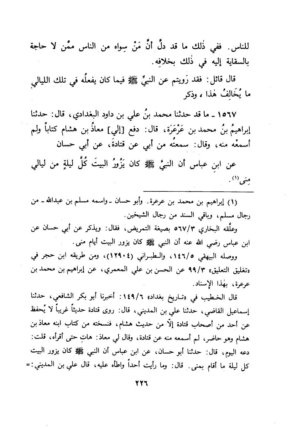 1567 - مَا قَدْ حَدَّثَنَا مُحَمَّدُ بْنُ عَلِيِّ بْنِ دَاوُدَ الْبَغْدَادِيُّ , قَالَ: حَدَّثَنَا إبْرَاهِيمُ بْنُ مُحَمَّدِ بْنِ عَرْعَرَةَ , قَالَ: دَفَعَ إلَيَّ مُعَاذُ بْنُ هِشَامٍ كِتَابًا وَلَمْ أَسْمَعْهُ مِنْهُ وَقَالَ: سَمِعْتُهُ مِنْ أَبِي , عَنْ قَتَادَةَ , عَنْ أَبِي حَسَّانَ , عَنِ ابْنِ عَبَّاسٍ " أَنَّ النَّبِيَّ صَلَّى اللَّهُ عَلَيْهِ وَسَلَّمَ كَانَ يَزُورُ الْبَيْتَ كُلَّ لَيْلَةٍ مِنْ لَيَالِي مِنًى " -[227]- فَكَانَ جَوَابَنَا لَهُ بِتَوْفِيقِ اللهِ عَزَّ وَجَلَّ وَعَوْنِهِ أَنَّ هَذَا الْحَدِيثَ عِنْدَنَا مُخَالِفٌ لِلْحَدِيثِ الْأَوَّلِ لِأَنَّ الَّذِي فِي الْحَدِيثِ الْأَوَّلِ إطْلَاقُ رَسُولِ اللهِ صَلَّى اللَّهُ عَلَيْهِ وَسَلَّمَ لِلْعَبَّاسِ الْبَيْتُوتَةَ بِمَكَّةَ لِحَاجَةِ السِّقَايَةِ إلَى ذَلِكَ مِنْهُ، وَالدَّلِيلُ عَلَى مَنْعِ غَيْرِهِ مِنْ مِثْلِ ذَلِكَ مِمَّنْ لَا حَاجَةَ بِالسِّقَايَةِ إلَيْهِ وَالَّذِي فِي حَدِيثِ ابْنِ عَبَّاسٍ زِيَارَةُ رَسُولِ اللهِ صَلَّى اللَّهُ عَلَيْهِ وَسَلَّمَ الْبَيْتَ فِي كُلِّ لَيْلَةٍ مِنْ لَيَالِي مِنًى وَلَيْسَ فِي ذَلِكَ بَيْتُوتَتُهُ صَلَّى اللَّهُ عَلَيْهِ وَسَلَّمَ بِمَكَّةَ؛ لِأَنَّهُ قَدْ يَجُوزُ أَنْ يَكُونَ صَلَّى اللَّهُ عَلَيْهِ وَسَلَّمَ يَزُورُ الْبَيْتَ ثُمَّ يَرْجِعُ فَيَبِيتُ فِي لَيْلَتِهِ تِلْكَ بِمِنًى فَيَكُونُ مِمَّنْ قَدْ بَاتَ بِهَا وَفِي ذَلِكَ مَا قَدْ دَلَّ عَلَى أَنَّهُ إنَّمَا أُرِيدَ مِنَ الْحَاجِّ الْبَيْتُوتَةُ بِمِنًى لَيَالِيَ مِنًى وَلَمْ يُرَدْ مِنْهُمْ أَنْ لَا يَبْرَحُوا عَنْ مِنًى فِي تِلْكَ اللَّيَالِي أَلَا تَرَى أَنَّهُ جَائِزٌ لَهُمْ أَنْ يَخْرُجُوا مِنْهَا فِي اللَّيْلِ حَتَّى يَأْتُوا مَكَّةَ فَيَطُوفُونَ بِالْبَيْتِ -[228]- طَوَافَ الزِّيَارَةِ ثُمَّ يَرْجِعُونَ إلَيْهَا فَيَبِيتُونَ بِهَا، وَلَا يَكُونُونَ بِذَلِكَ مُتَخَلِّفِينَ عَنِ الْبَيْتُوتَةِ بِهَا , وَكَذَلِكَ الْمُتَعَارَفُ فِي الْبَيْتُوتَاتِ، أَلَا تَرَى أَنَّ مَنْ حَلَفَ أَنْ لَا يَبِيتَ فِي هَذَا الْمَنْزِلِ هَذِهِ اللَّيْلَةَ فَأَقَامَ فِيهِ أَقَلَّ مِنْ نِصْفِهَا ثُمَّ خَرَجَ عَنْهُ إلَى غَيْرِهِ فَأَقَامَ فِيهِ بَقِيَّتَهَا حَتَّى أَصْبَحَ أَنَّهُ لَمْ يَحْنَثْ فِي يَمِينِهِ؛ لِأَنَّهُ لَمْ يَبِتْ فِيهِ، وَأَنَّهُ لَوْ كَانَ أَقَامَ فِيهِ أَكْثَرَ مِنْ نِصْفِهَا ثُمَّ خَرَجَ إلَى غَيْرِهِ فَأَقَامَ فِيهِ بَقِيَّتَهَا حَتَّى أَصْبَحَ أَنَّهُ قَدْ حَنِثَ؛ لِأَنَّهُ قَدْ بَاتَ فِيهِ هَكَذَا الْمُتَعَارَفُ أَلَا تَرَى أَنَّ مَنْ لَقِيَ رَجُلًا فِي اللَّيْلِ قَبْلَ أَنْ يَمْضِيَ نِصْفُهُ أَنَّهُ جَائِزٌ أَنْ يَقُولَ لَهُ: أَيْنَ تَبِيتُ اللَّيْلَةَ وَأَنَّهُ لَوْ لَقِيَهُ بَعْدَ أَنْ مَضَى نِصْفُهُ أَنَّهُ جَائِزٌ أَنْ يَقُولَ لَهُ: أَيْنَ بِتَّ اللَّيْلَةَ؟ فَكَذَلِكَ مَا ذَكَرْنَاهُ عَنْ رَسُولِ اللهِ صَلَّى اللَّهُ عَلَيْهِ وَسَلَّمَ مِنْ زِيَارَتِهِ الْبَيْتَ فِي كُلِّ لَيْلَةٍ مِنْ لَيَالِي مِنًى هُوَ عِنْدَنَا وَاللهُ أَعْلَمُ عَلَى أَنَّهُ يَرْجِعُ مِنْهُ إلَى مِنًى قَبْلَ أَنْ يَمْضِيَ نِصْفُ اللَّيْلِ فَيَكُونَ بِهَا حَتَّى يُصْبِحَ فِيهَا، فَيَكُونُ بِذَلِكَ بَائِتًا فِيهَا فَاتَّفَقَ بِحَمْدِ اللهِ وَنِعْمَتِهِ هَذَا الْحَدِيثُ وَمَعْنَى الْحَدِيثِ الْأَوَّلِ وَلَمْ يَخْتَلِفَا , وَاللهَ عَزَّ وَجَلَّ نَسْأَلُهُ التَّوْفِيقَ