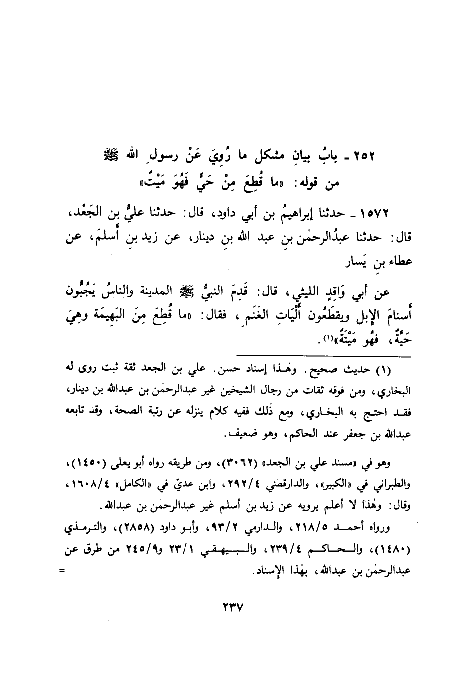1572 - حَدَّثَنَا إبْرَاهِيمُ بْنُ أَبِي دَاوُدَ , قَالَ: حَدَّثَنَا عَلِيُّ بْنُ الْجَعْدِ , قَالَ: حَدَّثَنَا عَبْدُ الرَّحْمَنِ بْنُ عَبْدِ اللهِ بْنِ دِينَارٍ , عَنْ زَيْدِ بْنِ أَسْلَمَ , عَنْ عَطَاءِ بْنِ يَسَارٍ , عَنْ أَبِي وَاقِدٍ اللَّيْثِيِّ , قَالَ: قَدِمَ النَّبِيُّ صَلَّى اللَّهُ عَلَيْهِ وَسَلَّمَ الْمَدِينَةَ وَالنَّاسُ يَجُبُّونَ أَسَنَامَ الْإِبِلِ وَيَقْطَعُونَ أَلْيَاتِ الْغَنَمِ فَقَالَ: " مَا قُطِعَ مِنَ الْبَهِيمَةِ وَهِيَ حَيَّةٌ فَهُوَ مَيْتَةٌ "