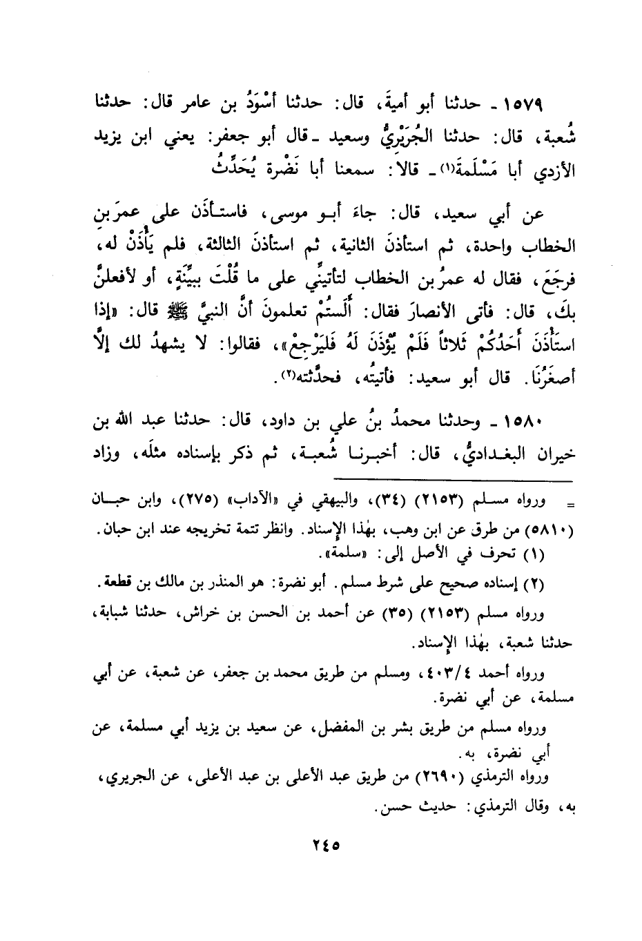 1579 - حَدَّثَنَا أَبُو أُمَيَّةَ , قَالَ: حَدَّثَنَا أَسْوَدُ بْنُ عَامِرٍ , قَالَ: حَدَّثَنَا شُعْبَةُ , قَالَ: حَدَّثَنَا الْجُرَيْرِيُّ , وَسَعِيدٌ , قَالَ: أَبُو جَعْفَرٍ يَعْنِي ابْنَ يَزِيدَ الْأَزْدِيَّ أَبَا مَسْلَمَةَ قَالَا: سَمِعْنَا أَبَا نَضْرَةَ , يُحَدِّثُ عَنْ أَبِي سَعِيدٍ , قَالَ: جَاءَ أَبُو مُوسَى فَاسْتَأْذَنَ عَلَى عُمَرَ بْنِ الْخَطَّابِ وَاحِدَةً، ثُمَّ اسْتَأْذَنَ الثَّانِيَةَ، ثُمَّ اسْتَأْذَنَ الثَّالِثَةَ، فَلَمْ يَأْذَنْ لَهُ فَرَجَعَ، فَقَالَ لَهُ عُمَرُ بْنُ الْخَطَّابِ لَتَأْتِيَنِّي عَلَى مَا قُلْتَ بِبَيِّنَةٍ أَوْ لَأَفْعَلَنَّ بِكَ قَالَ: فَأَتَى الْأَنْصَارَ فَقَالَ: أَلَسْتُمْ تَعْلَمُونَ أَنَّ النَّبِيَّ صَلَّى اللَّهُ عَلَيْهِ وَسَلَّمَ قَالَ: " إذَا اسْتَأْذَنَ أَحَدُكُمْ ثَلَاثًا فَلَمْ يُؤْذَنْ لَهُ فَلْيَرْجِعْ " فَقَالُوا: لَا يَشْهَدُ لَكَ إلَّا أَصْغَرُنَا قَالَ: أَبُو سَعِيدٍ فَأَتَيْتُهُ فَحَدَّثْتُهُ