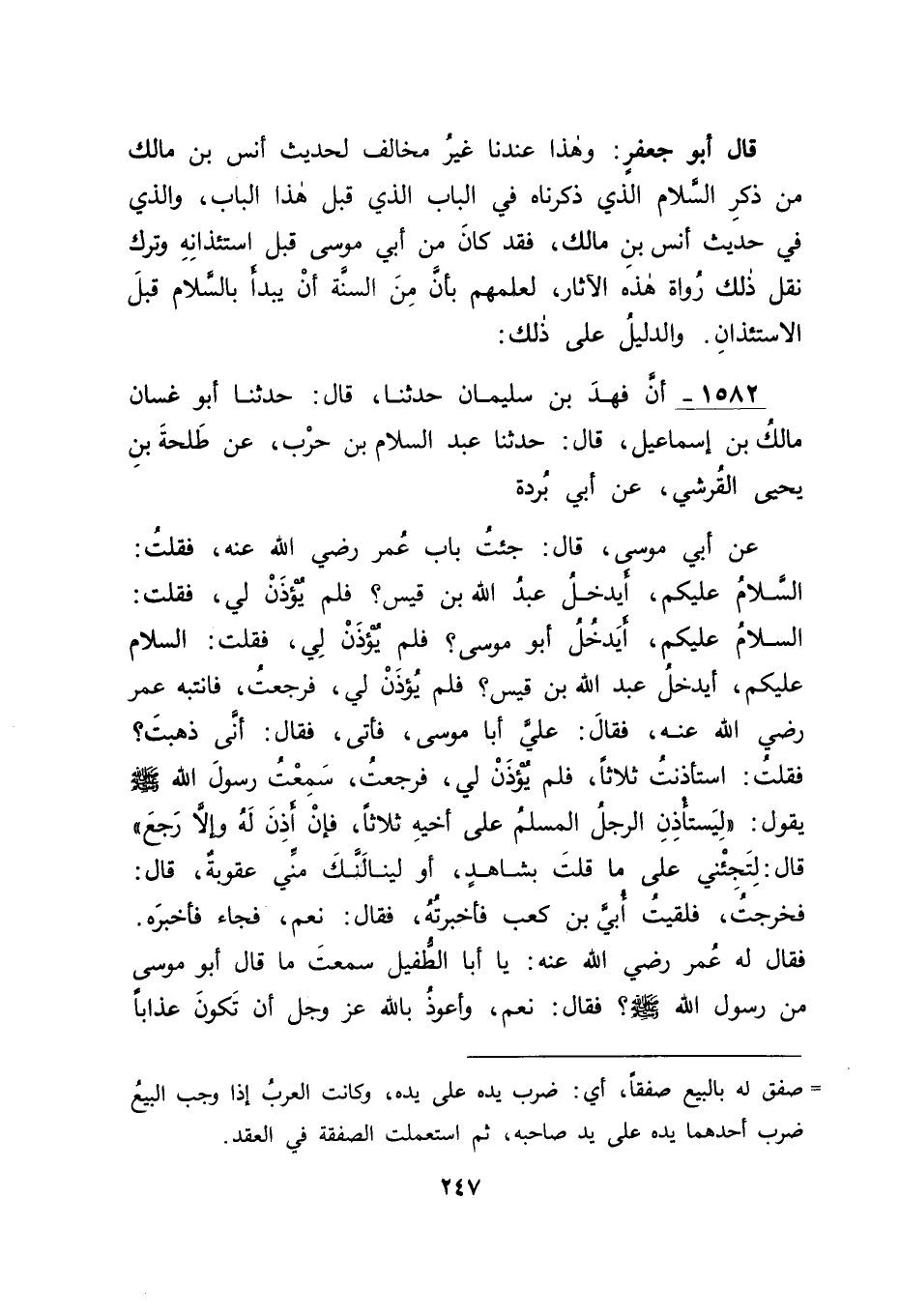 1582 - أَنَّ فَهْدَ بْنَ سُلَيْمَانَ حَدَّثَنَا قَالَ: حَدَّثَنَا أَبُو غَسَّانَ مَالِكُ بْنُ إسْمَاعِيلَ قَالَ: حَدَّثَنَا عَبْدُ السَّلَامِ بْنُ حَرْبٍ , عَنْ طَلْحَةَ بْنِ يَحْيَى الْقُرَشِيِّ , عَنْ أَبِي بُرْدَةَ , عَنْ أَبِي مُوسَى , قَالَ: جِئْتُ بَابَ عُمَرَ رَضِيَ اللهُ عَنْهُ فَقُلْتُ: السَّلَامُ عَلَيْكُمْ أَيَدْخُلُ عَبْدُ اللهِ بْنُ قَيْسٍ؟ فَلَمْ يُؤْذَنْ لِي فَقُلْتُ: السَّلَامُ عَلَيْكُمْ أَيَدْخُلُ أَبُو مُوسَى؟ فَلَمْ يُؤْذَنْ لِي، فَقُلْتُ: السَّلَامُ عَلَيْكُمْ أَيَدْخُلُ عَبْدُ اللهِ بْنُ قَيْسٍ؟ فَلَمْ يُؤْذَنْ لِي فَرَجَعْتُ فَانْتَبَهَ عُمَرُ رَضِيَ اللهُ عَنْهُ فَقَالَ: عَلَيَّ أَبَا مُوسَى فَأَتَى، فَقَالَ: أَنَّى ذَهَبْتَ؟ فَقُلْتُ: اسْتَأْذَنْتُ ثَلَاثًا فَلَمْ يُؤْذَنْ لِي فَرَجَعْتُ , سَمِعْتُ رَسُولَ اللهِ صَلَّى اللَّهُ عَلَيْهِ وَسَلَّمَ يَقُولُ: " لِيَسْتَأْذِنِ الرَّجُلُ الْمُسْلِمُ عَلَى أَخِيهِ ثَلَاثًا فَإِنْ أُذِنَ لَهُ وَإِلَّا رَجَعَ " قَالَ: لِتَجِئْنِي عَلَى مَا قُلْتَ بِشَاهِدٍ أَوْ لَيَنَالَنَّكَ مِنِّي عُقُوبَةٌ , قَالَ: فَخَرَجْتُ فَلَقِيتُ أُبَيَّ بْنَ كَعْبٍ فَأَخْبَرْتُهُ فَقَالَ: نَعَمْ، فَجَاءَ فَأَخْبَرَهُ، فَقَالَ لَهُ عُمَرُ رَضِيَ اللهُ عَنْهُ: يَا أَبَا الطُّفَيْلِ سَمِعْتَ مَا قَالَ أَبُو مُوسَى مِنْ رَسُولِ اللهِ صَلَّى اللَّهُ عَلَيْهِ وَسَلَّمَ، فَقَالَ: نَعَمْ، وَأَعُوذُ بِاللهِ عَزَّ وَجَلَّ أَنْ تَكُونَ عَذَابًا -[248]- عَلَى أَصْحَابِ مُحَمَّدٍ صَلَّى اللَّهُ عَلَيْهِ وَسَلَّمَ، قَالَ: وَأَعُوذُ بِاللهِ مِنْ ذَلِكَ قَالَ أَبُو جَعْفَرٍ: فَدَلَّ مَا ذَكَرْنَا أَنَّ أَبَا مُوسَى قَدْ كَانَ ابْتَدَأَ بِالسَّلَامِ قَبْلَ الِاسْتِئْذَانِ وَنَحْنُ نُحِيطُ عِلْمًا أَنَّ أَبَا مُوسَى لَمْ يَفْعَلْ ذَلِكَ رَأْيًا وَلَا اسْتِنْبَاطًا وَلَكِنَّهُ فَعَلَهُ تَوْقِيفًا مِنْ رَسُولِ اللهِ صَلَّى اللَّهُ عَلَيْهِ وَسَلَّمَ إيَّاهُ عَلَيْهِ؛ لِأَنَّ مِثْلَ هَذَا لَا يُؤْخَذُ مِنْ جِهَةِ الرَّأْيِ وَلَا اسْتِنْبَاطًا، وَإِنَّمَا يُؤْخَذُ مِنْ جِهَةِ التَّوْقِيفِ , وَالتَّوْقِيفُ فَمِنْ رَسُولِ اللهِ صَلَّى اللَّهُ عَلَيْهِ وَسَلَّمَ يُوجَدُ وَقَدْ قَالَ اللهُ عَزَّ وَجَلَّ فِي كِتَابِهِ {يَا أَيُّهَا الَّذِينَ آمَنُوا لَا تَدْخُلُوا بُيُوتًا غَيْرَ بُيُوتِكُمْ حَتَّى تَسْتَأْنِسُوا وَتُسَلِّمُوا عَلَى أَهْلِهَا} [النور: 27] وَالِاسْتِئْنَاسُ هَاهُنَا هُوَ الِاسْتِئْذَانُ كَذَلِكَ هُوَ فِي لُغَةِ أَهْلِ الْيَمَنِ مَوْجُودٌ فِيهَا إلَى الْآنَ، وَقَدْ ذَكَرَ ذَلِكَ الْفَرَّاءُ فَقَالَ: تَقُولُ الْعَرَبُ: اسْتَأْنِسْ فَانْظُرْ هَلْ تَرَى فِي الدَّارِ أَحَدًا بِمَعْنَى اسْتَأْذِنْ هَلْ تَرَى فِي الدَّارِ أَحَدًا فَقَالَ قَائِلٌ: فَفِي الْآيَةِ الَّتِي تَلَوْنَا تَقْدِيمُ الِاسْتِئْنَاسِ عَلَى السَّلَامِ وَفِي حَدِيثِ أَبِي مُوسَى تَقْدِيمُ السَّلَامِ عَلَى الِاسْتِئْذَانِ -[249]- فَكَانَ جَوَابُنَا لَهُ فِي ذَلِكَ بِتَوْفِيقِ اللهِ عَزَّ وَجَلَّ وَعَوْنِهِ أَنَّ الَّذِي فِي الْآيَةِ الَّتِي تَلَوْنَا عِنْدَهُمْ عَلَى التَّقْدِيمِ وَالتَّأْخِيرِ كَمِثْلِ مَا فِي قَوْلِهِ عَزَّ وَجَلَّ {مِنْ بَعْدِ وَصِيَّةٍ يُوصِي بِهَا أَوْ دَيْنٍ} [النساء: 11] عَلَى التَّقْدِيمِ وَالتَّأْخِيرِ، وَكَمِثْلِ مَا فِي قَوْلِهِ عَزَّ وَجَلَّ: {يَا مَرْيَمُ اقْنُتِي لِرَبِّكَ وَاسْجُدِي وَارْكَعِي مَعَ الرَّاكِعِينَ} [آل عمران: 43] عَلَى التَّقْدِيمِ وَالتَّأْخِيرِ؛ لِأَنَّ الرُّكُوعَ فِي الصَّلَوَاتِ قَبْلَ السُّجُودِ فِيهَا وَقَدْ وَجَدْنَا عَنْ رَسُولِ اللهِ صَلَّى اللَّهُ عَلَيْهِ وَسَلَّمَ فِي حَدِيثِ كَلَدَةَ لَمَّا دَخَلَ عَلَى النَّبِيِّ صَلَّى اللَّهُ