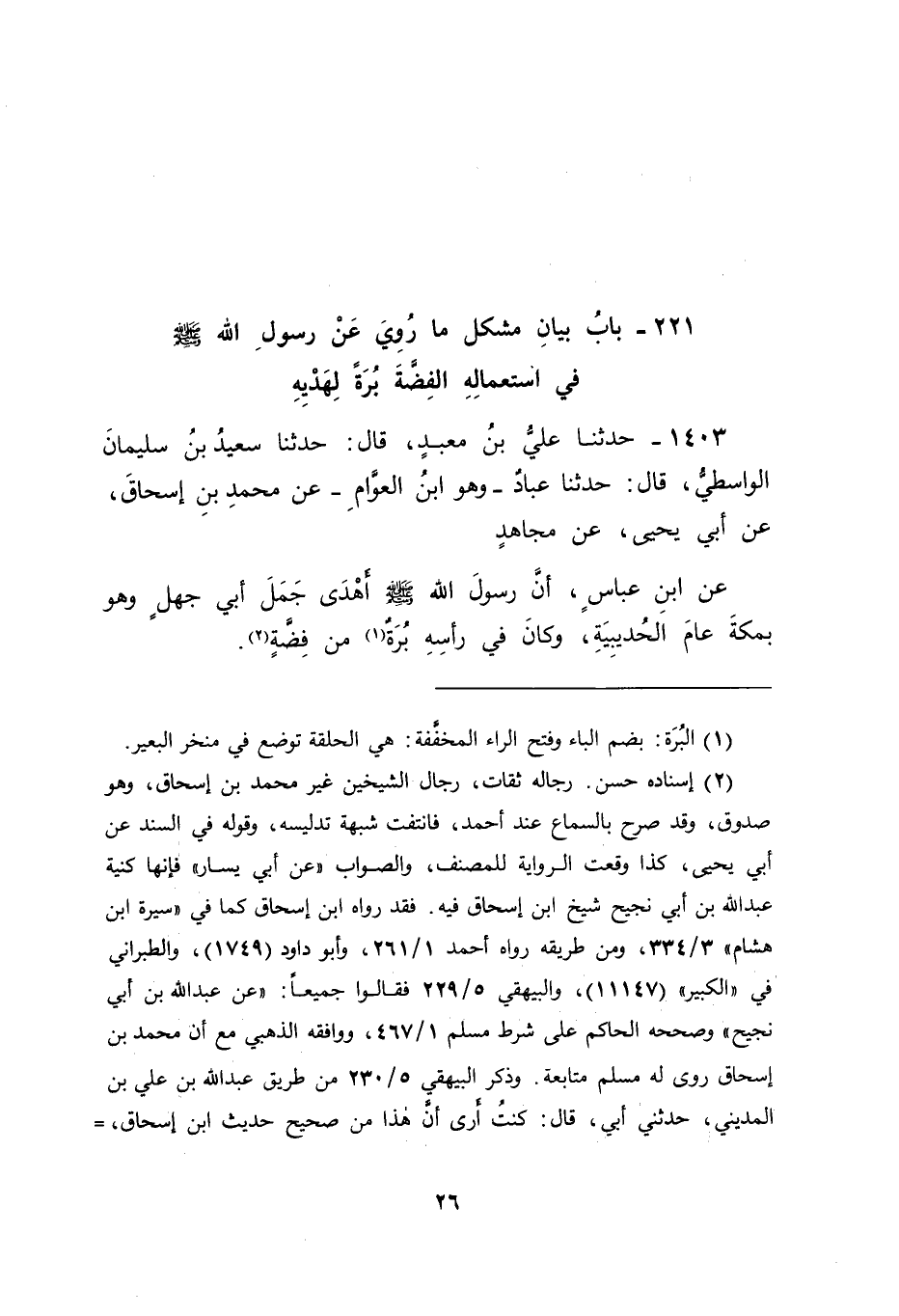 1403 - حَدَّثَنَا عَلِيُّ بْنُ مَعْبَدٍ , قَالَ: حَدَّثَنَا سَعِيدُ بْنُ سُلَيْمَانَ الْوَاسِطِيُّ , قَالَ: حَدَّثَنَا عَبَّادٌ وَهُوَ ابْنُ الْعَوَّامِ، عَنْ مُحَمَّدِ بْنِ إِسْحَاقَ , عَنْ أَبِي يَحْيَى , عَنْ مُجَاهِدٍ , عَنِ ابْنِ عَبَّاسٍ " أَنَّ رَسُولَ اللهِ صَلَّى اللَّهُ عَلَيْهِ وَسَلَّمَ أَهْدَى جَمَلَ أَبِي جَهْلٍ وَهُوَ بِمَكَّةَ عَامَ الْحُدَيْبِيَةِ وَكَانَ فِي رَأْسِهِ بُرَةٌ مِنْ فِضَّةٍ