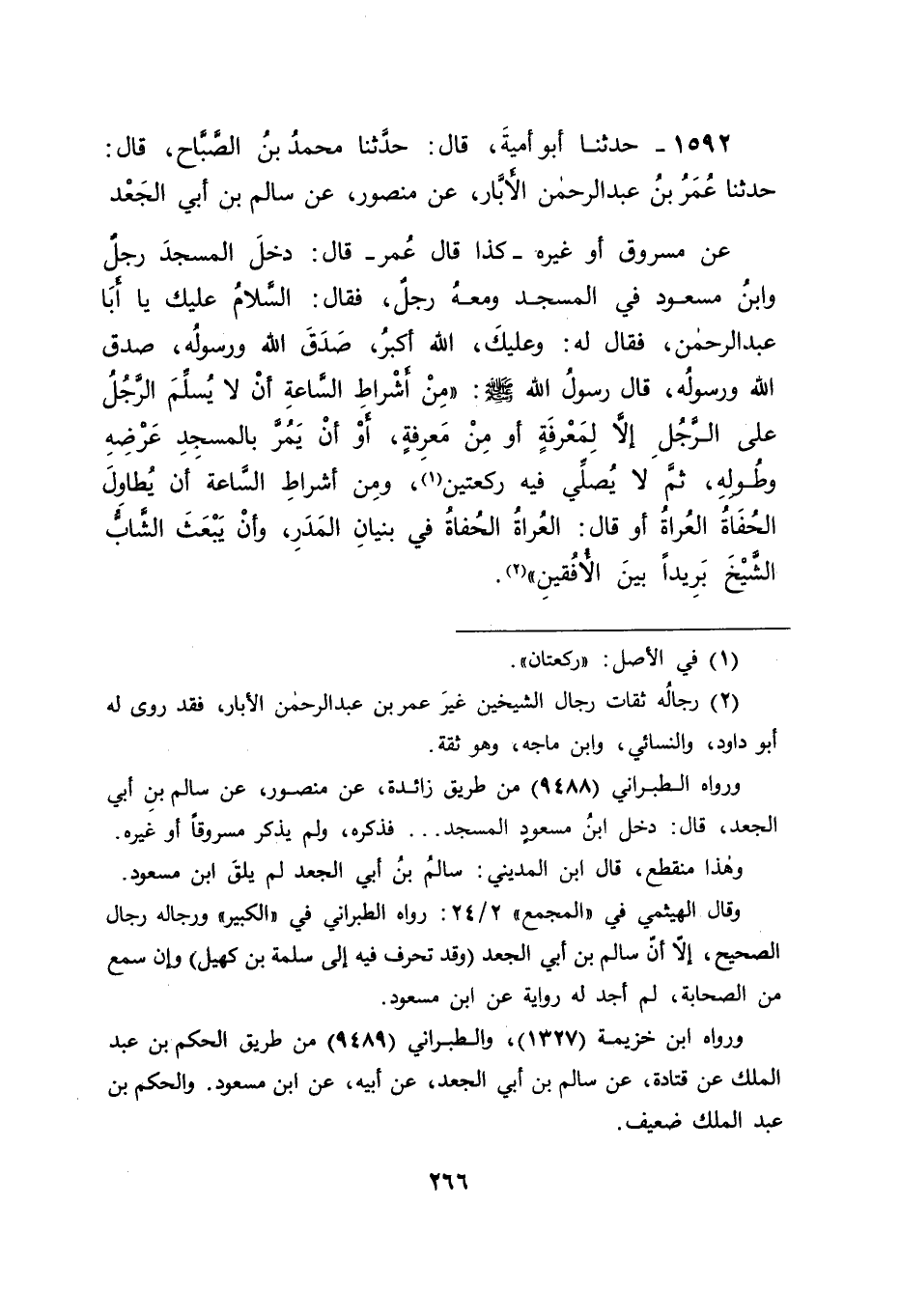 1592 - حَدَّثَنَا أَبُو أُمَيَّةَ , قَالَ: حَدَّثَنَا مُحَمَّدُ بْنُ الصَّبَّاحِ , قَالَ: حَدَّثَنَا عُمَرُ بْنُ عَبْدِ الرَّحْمَنِ الْأَبَّارُ , عَنْ مَنْصُورٍ , عَنْ سَالِمِ بْنِ أَبِي الْجَعْدِ , عَنْ مَسْرُوقٍ , أَوْ غَيْرِهِ كَذَا قَالَ: عُمَرُ قَالَ: دَخَلَ الْمَسْجِدَ رَجُلٌ وَابْنُ مَسْعُودٍ فِي الْمَسْجِدِ وَمَعَهُ رَجُلٌ فَقَالَ: السَّلَامُ عَلَيْكَ يَا أَبَا عَبْدِ الرَّحْمَنِ، فَقَالَ لَهُ: وَعَلَيْكَ , اللهُ أَكْبَرُ، صَدَقَ اللهُ وَرَسُولُهُ صَدَقَ اللهُ وَرَسُولُهُ , قَالَ رَسُولُ اللهِ صَلَّى اللَّهُ عَلَيْهِ وَسَلَّمَ: " مِنْ أَشْرَاطِ السَّاعَةِ أَنْ لَا يُسَلِّمَ الرَّجُلُ عَلَى الرَّجُلِ إلَّا لِمَعْرِفَةٍ أَوْ مِنْ مَعْرِفَةٍ , أَوْ أَنْ يَمُرَّ بِالْمَسْجِدِ عَرْضِهِ وَطُولِهِ، ثُمَّ لَا يُصَلِّي فِيهِ رَكْعَتَيْنِ، وَمِنْ أَشْرَاطِ السَّاعَةِ أَنْ يُطَاوِلَ الْحُفَاةُ الْعُرَاةُ، أَوْ قَالَ: الْعُرَاةُ الْحُفَاةُ فِي بُنْيَانِ الْمَدَرِ وَأَنْ يَبْعَثَ الشَّابُّ الشَّيْخَ بَرِيدًا بَيْنَ الْأُفُقَيْنِ " -[267]- فَقَالَ قَائِلٌ: فَقَدْ رَوَيْتُمْ عَنْ رَسُولِ اللهِ صَلَّى اللَّهُ عَلَيْهِ وَسَلَّمَ فِي رَدِّهِ السَّلَامِ عَلَى مَنْ سَلَّمَ عَلَيْهِ رَدًّا خَاصًّا بِقَوْلِهِ وَعَلَيْكَ السَّلَامُ وَذَكَرَ