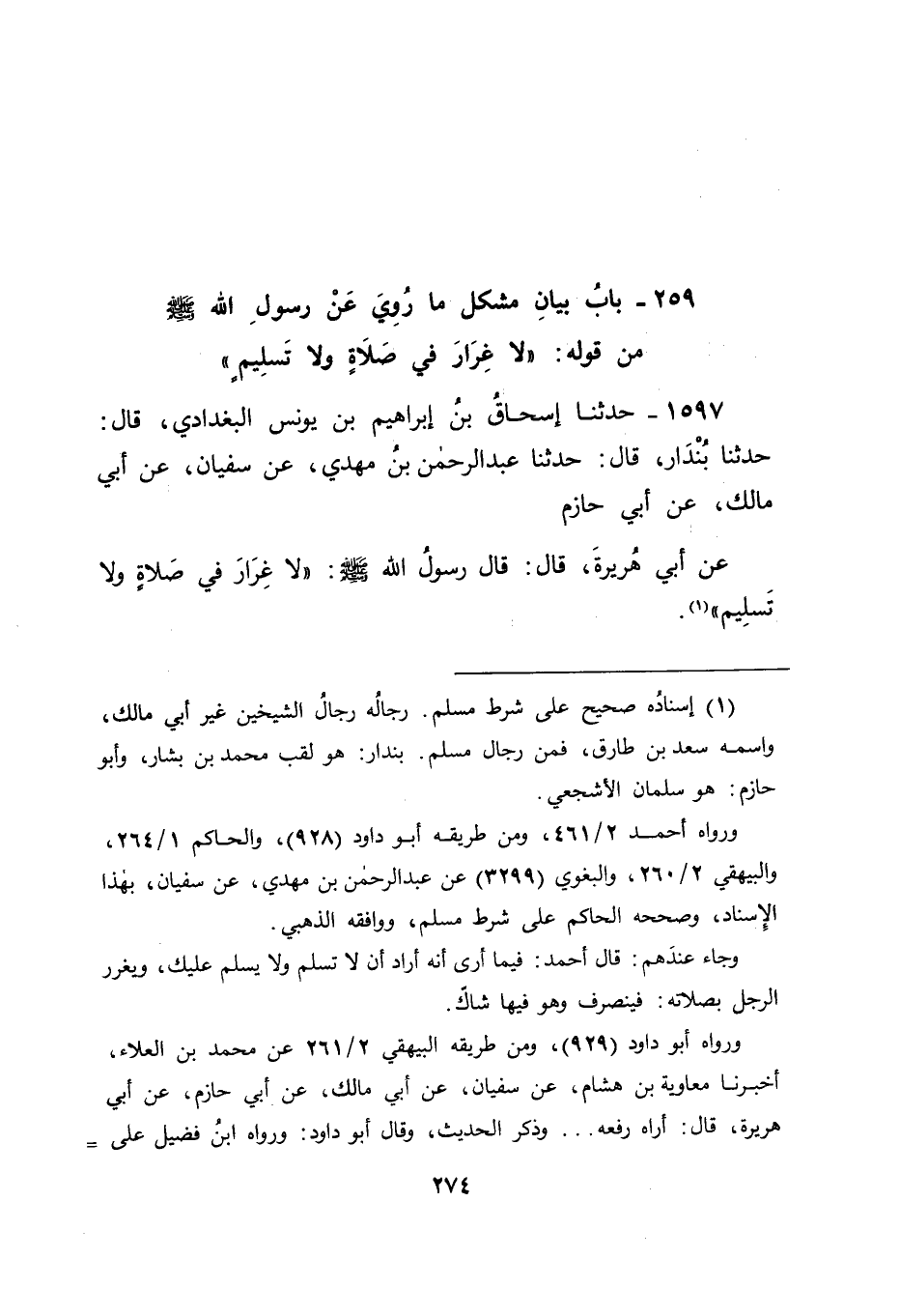 1597 - حَدَّثَنَا إِسْحَاقُ بْنُ إبْرَاهِيمَ بْنِ يُونُسَ الْبَغْدَادِيُّ , قَالَ: حَدَّثَنَا بُنْدَارٌ , قَالَ: حَدَّثَنَا عَبْدُ الرَّحْمَنِ بْنُ مَهْدِيٍّ , عَنْ سُفْيَانَ , عَنْ أَبِي مَالِكٍ , عَنْ أَبِي حَازِمٍ , عَنْ أَبِي هُرَيْرَةَ , قَالَ: قَالَ رَسُولُ اللهِ صَلَّى اللَّهُ عَلَيْهِ وَسَلَّمَ " لَا غِرَارَ فِي صَلَاةٍ وَلَا تَسْلِيمٍ " -[276]- وَسَمِعْتُ عَلِيَّ بْنَ عَبْدِ الْعَزِيزِ يَقُولُ: قَالَ: أَبُو عُبَيْدٍ: الْغِرَارُ: النُّقْصَانُ، وَحَكَاهُ عَنِ الْكِسَائِيِّ. قَالَ: وَاحْتَجَّ أَبُو عُبَيْدٍ لِذَلِكَ بِقَوْلِ الْفَرَزْدَقِ فِي مَرْثِيَّتِهِ الْحَجَّاجَ بْنَ يُوسُفَ: