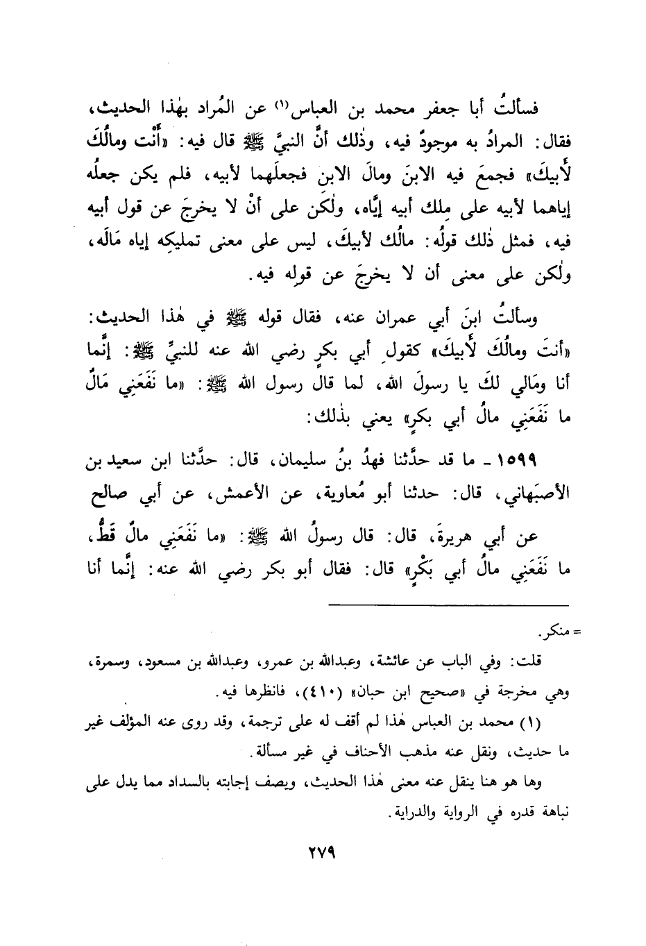 1599 - مَا قَدْ حَدَّثَنَا فَهْدُ بْنُ سُلَيْمَانَ , قَالَ: حَدَّثَنَا مُحَمَّدُ بْنُ سَعِيدِ بْنِ الْأَصْبَهَانِيِّ , قَالَ: حَدَّثَنَا أَبُو مُعَاوِيَةَ , عَنِ الْأَعْمَشِ , عَنْ أَبِي صَالِحٍ , عَنْ أَبِي هُرَيْرَةَ , قَالَ: قَالَ رَسُولُ اللهِ صَلَّى اللَّهُ عَلَيْهِ وَسَلَّمَ: " مَا نَفَعَنِي مَالٌ قَطُّ مَا نَفَعَنِي مَالُ أَبِي بَكْرٍ " قَالَ: فَقَالَ أَبُو بَكْرٍ: رَضِيَ اللهُ عَنْهُ إنَّمَا أَنَا -[280]- وَمَالِي لَكَ يَا رَسُولَ اللهِ فَكَانَ مُرَادُ أَبِي بَكْرٍ رَضِيَ اللهُ عَنْهُ بِقَوْلِهِ هَذَا أَيْ أَنَّ أَقْوَالَكَ وَأَفْعَالَكَ نَافِذَةٌ فِي وَفِي مَالِي مَا تَنْفُذُ الْأَقْوَالُ وَالْأَفْعَالُ مِنْ مَالِكِي الْأَشْيَاءِ فِي الْأَشْيَاءِ فَمِثْلُ ذَلِكَ قَوْلُ رَسُولِ اللهِ صَلَّى اللَّهُ عَلَيْهِ وَسَلَّمَ لِسَائِلِهِ الْمَذْكُورِ فِي هَذَا الْحَدِيثِ وَهُوَ عَلَى هَذَا الْمَعْنَى وَاللهُ أَعْلَمُ وَقَدْ جَاءَ كِتَابُ اللهِ بِمَا كَشَفَ لَنَا عَنِ الْمُشْكِلِ فِي هَذَا الْجَوَابِ مِنْ رَسُولِ اللهِ صَلَّى اللَّهُ عَلَيْهِ وَسَلَّمَ مِمَّا يُوجِبُ انْتِفَاءَ مِلْكِ الْأَبِ عَمَّا يَمْلِكُ الِابْنُ قَالَ اللهُ: {وَالَّذِينَ هُمْ لِفُرُوجِهِمْ حَافِظُونَ إلَّا عَلَى أَزْوَاجِهِمْ أَوْ مَا مَلَكَتْ أَيْمَانُهُمْ فَإِنَّهُمْ غَيْرُ مَلُومِينَ} [المؤمنون: 6] فَكَانَ مَا يَمْلِكُهُ الِابْنُ مِنَ الْإِمَاءِ حَلَالًا لَهُ وَطْؤُهُنَّ وَحَرَامًا عَلَى أَبِيهِ وَطْؤُهُنَّ، فَدَلَّ ذَلِكَ عَلَى أَنَّ مِلْكَهُ فِيهِنَّ مِلْكٌ تَامٌّ صَحِيحٌ وَأَنَّ أَبَاهُ فِيهِنَّ بِخِلَافِ ذَلِكَ وَقَدْ قَالَ اللهُ عَزَّ وَجَلَّ فِي آيَةِ الْمَوَارِيثِ: {وَلِأَبَوَيْهِ لِكُلِّ وَاحِدٍ مِنْهُمَا السُّدُسُ} [النساء: 11] فَجَعَلَ لِأُمِّهِ نَصِيبًا فِي مَالِهِ بِمَوْتِهِ , وَمُحَالٌ أَنْ تَسْتَحِقَّ بِمَوْتِ ابْنِهَا جُزْءًا مِنْ مَالٍ لِأَبِيهِ دُونَهُ، ثُمَّ قَالَ عَزَّ وَجَلَّ: {مِنْ بَعْدِ وَصِيَّةٍ يُوصِي بِهَا أَوْ دَيْنٍ} [النساء: 11] فَاسْتَحَالَ أَنْ يَجِبَ -[281]- قَضَاءُ مَا عَلَيْهِ مِنْ دَيْنٍ مِنْ مَالٍ لِأَبِيهِ دُونَهُ أَوْ تَجُوزَ وَصِيَّةٌ مِنْهُ فِي مَالٍ لِأَبِيهِ دُونَهُ، قَالَ: وَفِيمَا ذَكَرْتُ مِنْ هَذَا مَا قَدْ دَلَّ عَلَى مَا وَصَفْتُهُ فِيهِ قَالَ أَبُو جَعْفَرٍ وَكَانَ هَذَانِ الْجَوَابَانِ مِنْ هَذَيْنِ الشَّيْخَيْنِ سَدِيدَيْنِ , كُلُّ وَاحِدٍ مِنْهُمَا شَادٌّ لِصَاحِبِهِ، وَاللهَ نَسْأَلُهُ التَّوْفِيقَ