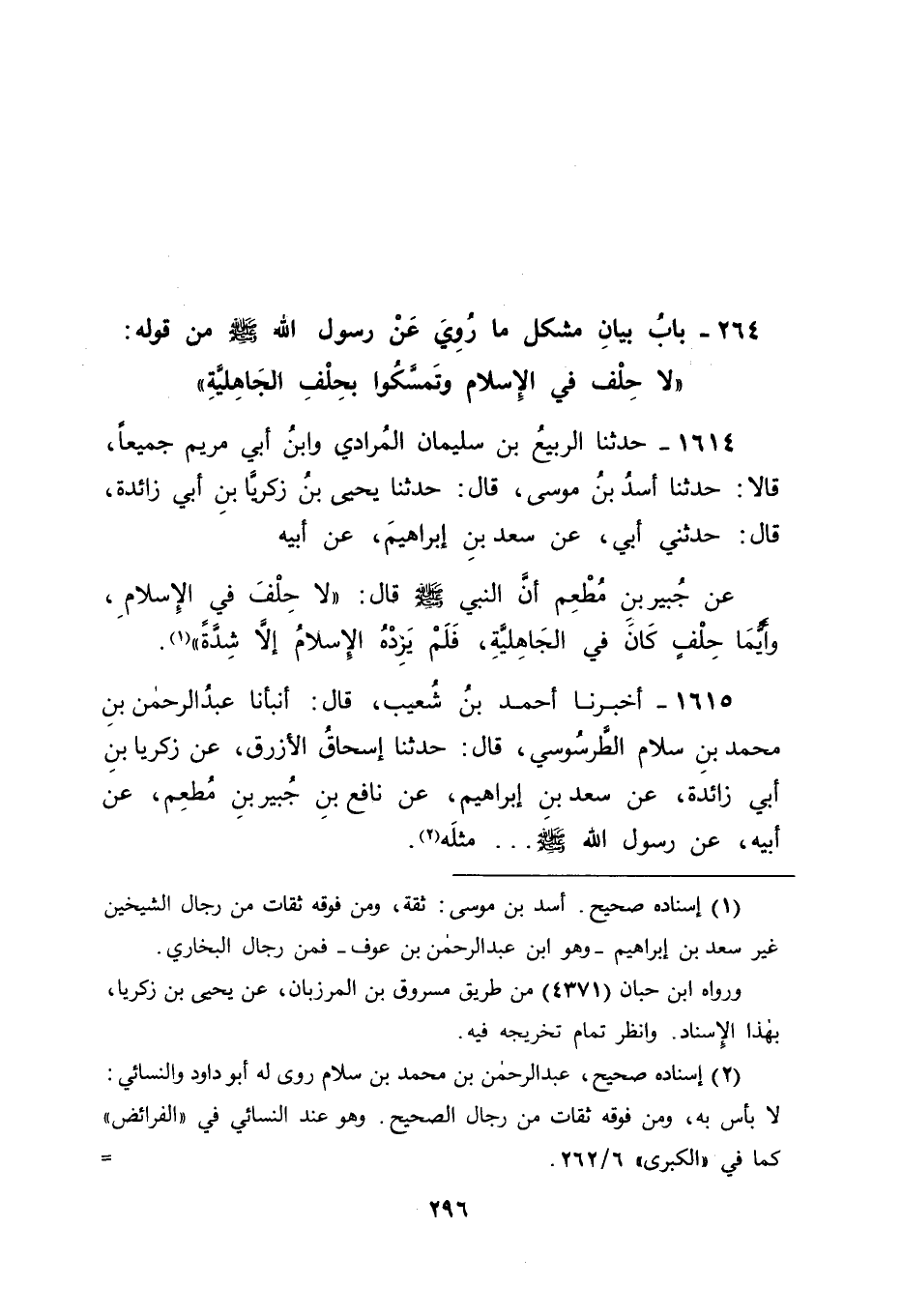 1614 - حَدَّثَنَا الرَّبِيعُ بْنُ سُلَيْمَانَ الْمُرَادِيُّ , وَابْنُ أَبِي مَرْيَمَ , جَمِيعًا قَالَا: حَدَّثَنَا أَسَدُ بْنُ مُوسَى , قَالَ: حَدَّثَنَا يَحْيَى بْنُ زَكَرِيَّا بْنِ أَبِي زَائِدَةَ , قَالَ: حَدَّثَنِي أَبِي , عَنْ سَعْدِ بْنِ إبْرَاهِيمَ , عَنْ أَبِيهِ , عَنْ جُبَيْرِ بْنِ مُطْعَمٍ , أَنَّ النَّبِيَّ صَلَّى اللَّهُ عَلَيْهِ وَسَلَّمَ قَالَ: " لَا حِلْفَ فِي الْإِسْلَامِ، وَأَيُّمَا حِلْفٍ كَانَ فِي الْجَاهِلِيَّةِ فَلَمْ يَزِدْهُ الْإِسْلَامُ إلَّا شِدَّةً "