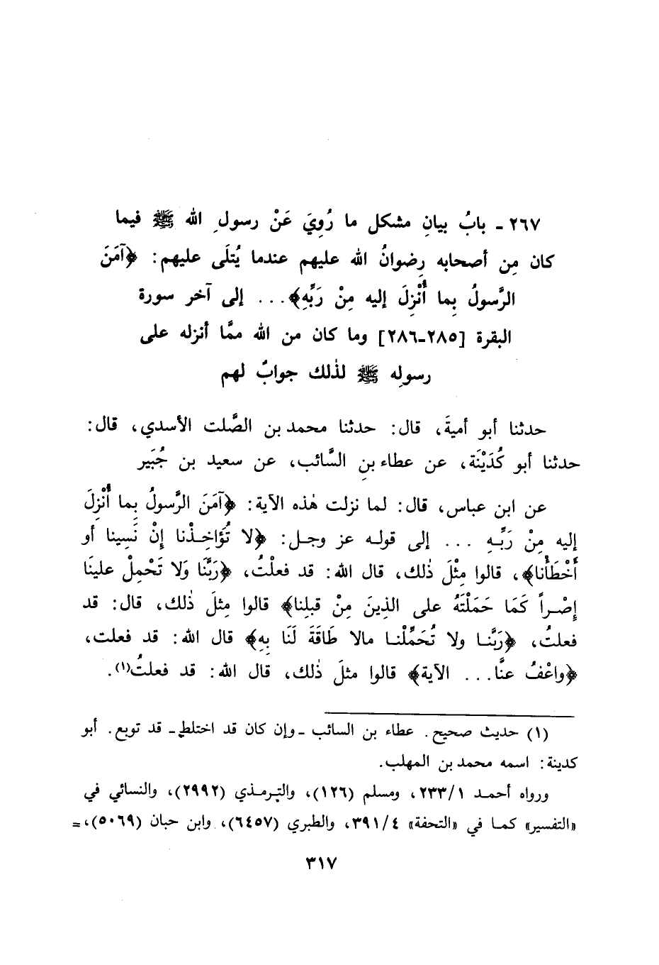حَدَّثَنَا أَبُو أُمَيَّةَ قَالَ: حَدَّثَنَا مُحَمَّدُ بْنُ الصَّلْتِ الْأَسَدِيُّ قَالَ: حَدَّثَنَا أَبُو كُدَيْنَةَ، عَنْ عَطَاءِ بْنِ السَّائِبِ عَنْ سَعِيدِ بْنِ جُبَيْرٍ عَنِ ابْنِ عَبَّاسٍ , قَالَ: لَمَّا نَزَلَتْ هَذِهِ الْآيَةُ {آمَنَ الرَّسُولُ بِمَا أُنْزِلَ إلَيْهِ مِنْ رَبِّهِ} [البقرة: 285] إلَى قَوْلِهِ عَزَّ وَجَلَّ: {لَا تُؤَاخِذْنَا إنْ نَسِينَا أَوْ أَخْطَأْنَا} [البقرة: 286] قَالُوا مِثْلَ ذَلِكَ قَالَ اللهُ: قَدْ فَعَلْتُ {رَبَّنَا وَلَا تَحْمِلْ عَلَيْنَا إصْرًا كَمَا حَمَلْتَهُ عَلَى الَّذِينَ مِنْ قَبْلِنَا} [البقرة: 286] , قَالُوا مِثْلَ ذَلِكَ , قَالَ: قَدْ فَعَلْتُ {رَبَّنَا وَلَا تُحَمِّلْنَا مَا لَا طَاقَةَ لَنَا بِهِ} [البقرة: 286] قَالَ: اللهُ: قَدْ فَعَلْتُ , {وَاعْفُ عَنَّا} [البقرة: 286] الْآيَةَ، قَالُوا مِثْلَ ذَلِكَ , قَالَ اللهُ: قَدْ فَعَلْتُ
