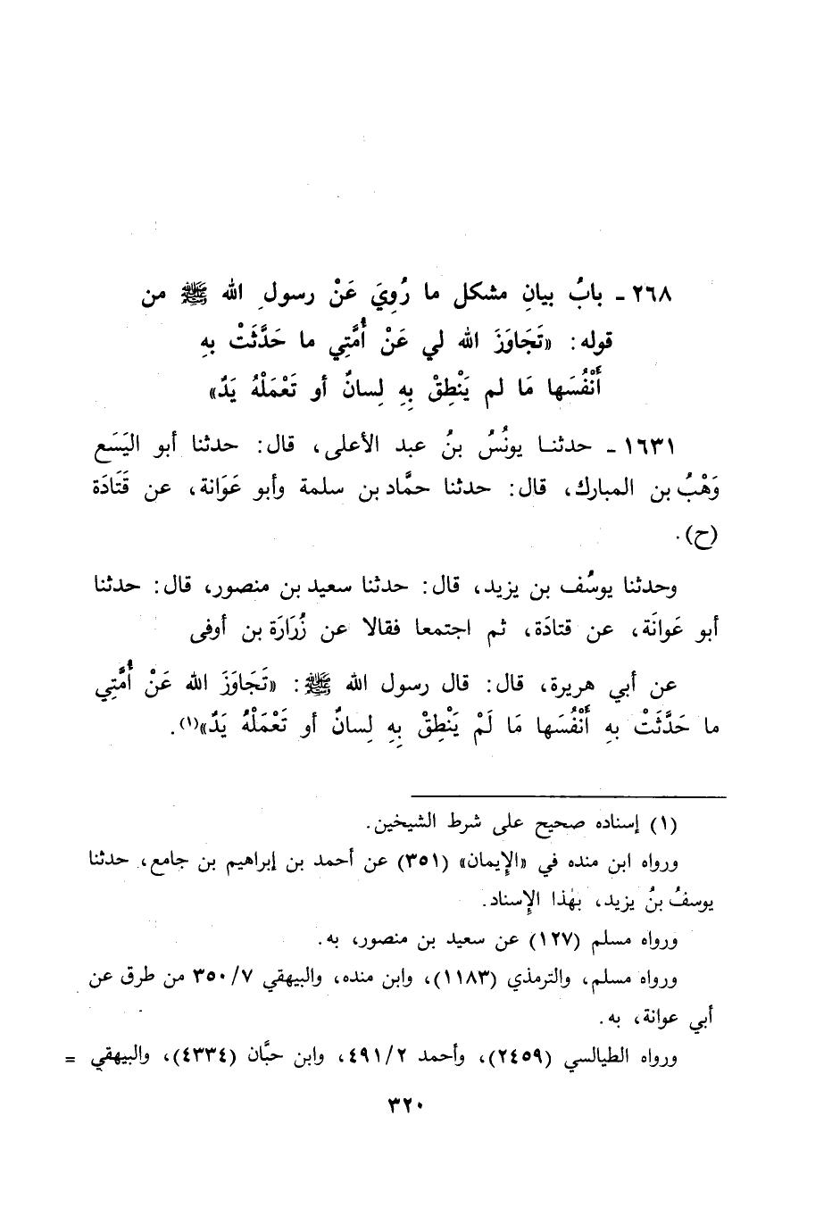 1631 - حَدَّثَنَا يُونُسُ بْنُ عَبْدِ الْأَعْلَى , قَالَ: حَدَّثَنَا أَبُو الْيَسَعِ وَهْبُ بْنُ الْمُبَارَكِ قَالَ: حَدَّثَنَا حَمَّادُ بْنُ سَلَمَةَ , وَأَبُو عَوَانَةَ عَنْ قَتَادَةَ ح وَحَدَّثَنَا يُوسُفُ بْنُ يَزِيدَ , قَالَ: حَدَّثَنَا سَعِيدُ بْنُ مَنْصُورٍ قَالَ: حَدَّثَنَا أَبُو عَوَانَةَ , عَنْ قَتَادَةَ , ثُمَّ اجْتَمَعَا فَقَالَا: عَنْ زُرَارَةَ بْنِ أَوْفَى , عَنْ أَبِي هُرَيْرَةَ , قَالَ: قَالَ رَسُولُ اللهِ صَلَّى اللَّهُ عَلَيْهِ وَسَلَّمَ: " تَجَاوَزَ اللهُ عَنْ أُمَّتِي مَا حَدَّثَتْ بِهِ أَنْفُسَهَا مَا لَمْ يَنْطِقْ بِهِ لِسَانٌ أَوْ تَعْمَلْهُ يَدٌ "