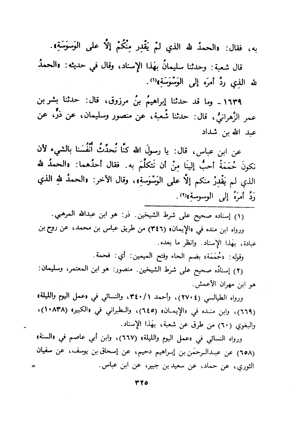 1639 - وَمَا قَدْ حَدَّثَنَا إبْرَاهِيمُ بْنُ مَرْزُوقٍ , قَالَ: حَدَّثَنَا بِشْرُ بْنُ عُمَرَ الزَّهْرَانِيُّ , قَالَ: حَدَّثَنَا شُعْبَةُ , عَنْ مَنْصُورٍ , وَسُلَيْمَانُ , عَنْ ذَرٍّ , عَنْ عَبْدِ اللهِ بْنِ شَدَّادٍ , عَنِ ابْنِ عَبَّاسٍ , قَالَ: يَا رَسُولَ اللهِ كُنَّا نُحَدِّثُ أَنْفُسَنَا بِالشَّيْءِ لَأَنْ نَكُونَ حُمَمَةً أَحَبُّ إلَيْنَا مِنْ أَنْ نَتَكَلَّمَ بِهِ , فَقَالَ أَحَدُهُمَا: " الْحَمْدُ لِلَّهِ الَّذِي لَمْ يَقْدِرْ مِنْكُمْ إلَّا عَلَى الْوَسْوَسَةِ " وَقَالَ الْآخَرُ: " الْحَمْدُ لِلَّهِ الَّذِي رَدَّ أَمْرَهُ إلَى الْوَسْوَسَةِ "