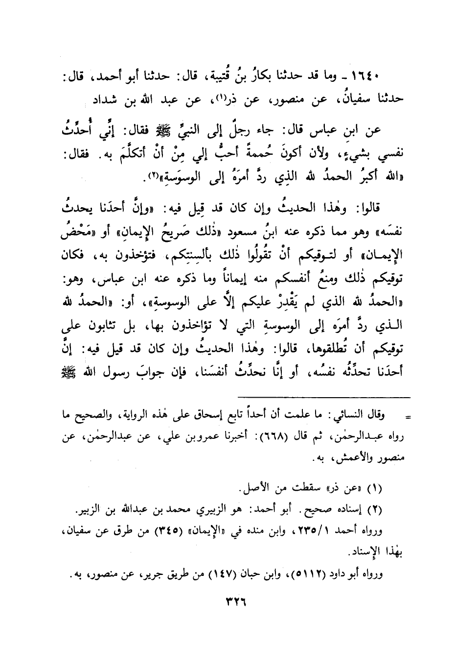 1640 - وَمَا قَدْ حَدَّثَنَا بَكَّارُ بْنُ قُتَيْبَةَ , قَالَ: حَدَّثَنَا أَبُو أَحْمَدَ , قَالَ: حَدَّثَنَا سُفْيَانُ , عَنْ مَنْصُورٍ , عَنْ ذَرٍّ , عَنْ عَبْدِ اللهِ بْنِ شَدَّادٍ عَنِ ابْنِ عَبَّاسٍ , قَالَ: جَاءَ رَجُلٌ إلَى النَّبِيِّ صَلَّى اللَّهُ عَلَيْهِ وَسَلَّمَ , فَقَالَ: إنِّي أُحَدِّثُ نَفْسِي بِشَيْءٍ وَلَأَنْ أَكُونَ حُمَمَةً أَحَبُّ إلَيَّ مِنْ أَنْ أَتَكَلَّمَ بِهِ فَقَالَ: " اللهُ أَكْبَرُ الْحَمْدُ لِلَّهِ الَّذِي رَدَّ أَمَرَهُ إلَى الْوَسْوَسَةِ " قَالُوا: وَهَذَا الْحَدِيثُ وَإِنْ كَانَ قَدْ قِيلَ فِيهِ: وَإِنَّ أَحَدَنَا يُحَدِّثُ نَفْسَهُ , وَهُوَ مِمَّا ذَكَرَهُ عَنْهُ ابْنُ مَسْعُودٍ ذَلِكَ صَرِيحُ الْإِيمَانِ أَوْ مَحْضُ الْإِيمَانِ , أَوْ لِتَوَقِّيكُمْ أَنْ تَقُولُوا ذَلِكَ بِأَلْسِنَتِكُمْ فَتُؤْخَذُونَ بِهِ , فَكَانَ تَوَقِّيكُمْ ذَلِكَ وَمَنْعُ أَنْفُسِكُمْ مِنْهُ إيمَانًا وَمَا ذَكَرَهُ عَنْهُ ابْنُ عَبَّاسٍ , وَهُوَ: " الْحَمْدُ لِلَّهِ الَّذِي لَمْ يَقْدِرْ عَلَيْكُمْ إلَّا عَلَى الْوَسْوَسَةِ , أَوِ الْحَمْدُ لِلَّهِ الَّذِي رَدَّ أَمْرَهُ إلَى الْوَسْوَسَةِ , الَّتِي لَا تُؤَاخَذُونَ بِهَا بَلْ تُثَابُونَ عَلَى تَوَقِّيكُمْ أَنْ تُطْلِقُوهَا " قَالُوا: وَهَذَا الْحَدِيثُ , وَإِنْ كَانَ قَدْ قِيلَ فِيهِ: إنَّ أَحَدَنَا تُحَدِّثُهُ نَفْسُهُ , أَوْ إنَّا نُحَدِّثُ أَنْفُسَنَا , فَإِنَّ جَوَابَ رَسُولِ اللهِ صَلَّى اللَّهُ عَلَيْهِ وَسَلَّمَ -[327]- إيَّاهُمْ فِي ذَلِكَ هُوَ الْمُعْتَمَدُ عَلَيْهِ، وَإِلَيْهِ قَصَدَ بِهِ , وَهُوَ: " الْحَمْدُ لِلَّهِ الَّذِي لَمْ يَقْدِرْ مِنْكُمْ إلَّا عَلَى الْوَسْوَسَةِ " أَوِ الْحَمْدُ لِلَّهِ الَّذِي رَدَّ أَمْرَهُ إلَى الْوَسْوَسَةِ " فَعَادَ ذَلِكَ إلَى وَسْوَاسِهِ أَنْفُسَهُمْ بِمَا تُوَسْوِسُهُمْ بِهِ قَالَ أَبُو جَعْفَرٍ: فَتَأَمَّلْنَا نَحْنُ هَذَا الْحَدِيثَ وَهَلْ يَحْتَمِلُ خِلَافَ مَا قَالَ أَهْلُ اللُّغَةِ فِيهِ , مِمَّا يُوَافِقُ مَا كَانَ الَّذِينَ أَخَذْنَاهُ عَنْهُمْ حَدَّثُونَا بِهِ , مِمَّا يَعُودُ إلَى مَا حَدَّثَتْ بِهِ أَنْفُسَهَا بِالنَّصْبِ أَمْ لَا , فَوَجَدْنَا مِنْهُ ذِكْرَ التَّجَاوُزِ مِنَ اللهِ عَزَّ وَجَلَّ لِنَبِيِّهِ فِي أُمَّتِهِ عَمَّا تَجَاوَزَ لَهَا عَنْهُ , فَكَانَ التَّجَاوُزُ لَا يَكُونُ إلَّا عَنْ مَا لَوْ لَمْ يَتَجَاوَزْ عَنْهُ , لَكَانُوا مُعَاقَبِينَ عَلَيْهِ , وَذَلِكَ مِمَّا قَدْ عَقَلْنَاهُ أَنَّهُ لَا يَكُونُ مِنَ الْخَوَاطِرِ الْمَعْفُوِّ عَنْهَا , وَأَنَّهُ إنَّمَا يَكُونُ مِنَ الْأَشْيَاءِ الْمُجْتَلَبَةِ بِالْهُمُومِ بِهَا , فَكَانَ وَجْهُ ذَلِكَ عِنْدَنَا , وَاللهُ أَعْلَمُ , عَلَى مَا يَهُمُّ بِهِ مِنَ الْمَعَاصِي لِيَعْمَلَهَا , فَتَجَاوَزَ اللهُ لِنَبِيِّهِ صَلَّى اللَّهُ عَلَيْهِ وَسَلَّمَ عَنْهُمْ ذَلِكَ , فَلَمْ يُؤَاخِذْهُمْ بِهِ وَلَمْ يُعَاقِبْهُمْ عَلَيْهِ وَمِنْ ذَلِكَ مَا قَدْ رُوِيَ عَنْ رَسُولِ اللهِ صَلَّى اللَّهُ عَلَيْهِ وَسَلَّمَ