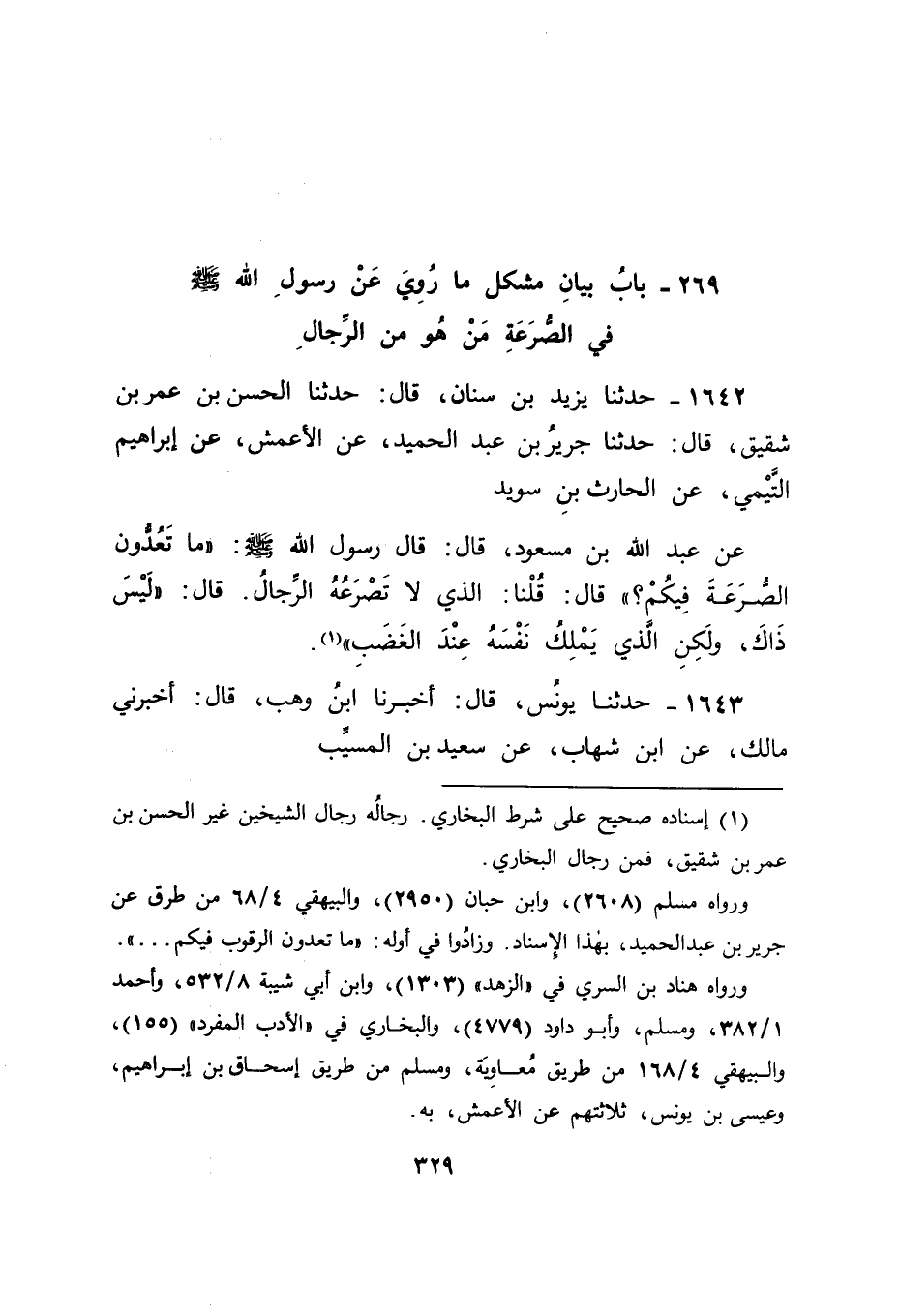 1642 - حَدَّثَنَا يَزِيدُ بْنُ سِنَانٍ , قَالَ: حَدَّثَنَا الْحَسَنُ بْنُ عُمَرَ بْنِ شَقِيقٍ , قَالَ: حَدَّثَنَا جَرِيرُ بْنُ عَبْدِ الْحَمِيدِ , عَنِ الْأَعْمَشِ , عَنْ إبْرَاهِيمَ التَّيْمِيِّ , عَنِ الْحَارِثِ بْنِ سُوَيْدٍ , عَنْ عَبْدِ اللهِ بْنِ مَسْعُودٍ , قَالَ: قَالَ رَسُولُ اللهِ صَلَّى اللَّهُ عَلَيْهِ وَسَلَّمَ: " مَا تَعُدُّونَ الصُّرَعَةَ فِيكُمْ؟ " قَالَ: قُلْنَا: الَّذِي لَا تَصْرَعُهُ الرِّجَالُ قَالَ: " لَيْسَ ذَاكَ وَلَكِنِ الَّذِي يَمْلِكُ نَفْسَهُ عِنْدَ الْغَضَبِ "