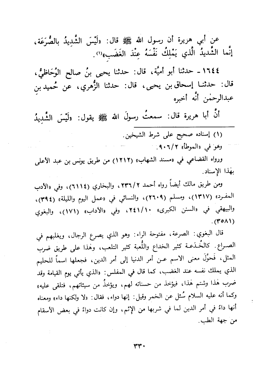 1644 - حَدَّثَنَا أَبُو أُمَيَّةَ , قَالَ: حَدَّثَنَا يَحْيَى بْنُ صَالِحٍ الْوُحَاظِيُّ , قَالَ: حَدَّثَنَا إِسْحَاقُ بْنُ يَحْيَى , قَالَ: حَدَّثَنَا الزُّهْرِيُّ , عَنْ حُمَيْدِ بْنِ عَبْدِ الرَّحْمَنِ , أَنَّهُ أَخْبَرَهُ أَنَّ أَبَا هُرَيْرَةَ قَالَ: سَمِعْتُ رَسُولَ اللهِ صَلَّى اللَّهُ عَلَيْهِ وَسَلَّمَ يَقُولُ: " لَيْسَ الشَّدِيدُ -[331]- بِالصُّرَعَةِ " قَالُوا: فَمَنِ الشَّدِيدُ يَا رَسُولَ اللهِ؟ قَالَ: " الَّذِي يَمْلِكُ نَفْسَهُ عِنْدَ الْغَضَبِ "