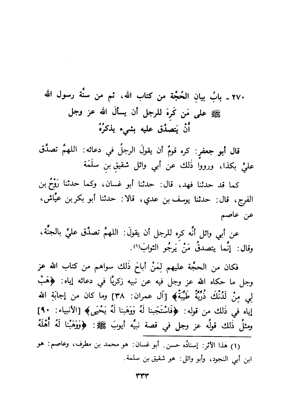 بَابٌ بَيَانُ الْحُجَّةِ مِنْ كِتَابِ اللهِ ثُمَّ مِنْ سُنَّةِ رَسُولِ اللهِ صَلَّى اللَّهُ عَلَيْهِ وَسَلَّمَ عَلَى مَنْ كَرِهَ لِلرَّجُلِ أَنْ يَسْأَلَ اللهَ عَزَّ وَجَلَّ أَنْ يَتَصَدَّقَ عَلَيْهِ بِشَيْءٍ يَذْكُرُهُ قَالَ أَبُو جَعْفَرٍ: كَرِهَ قَوْمٌ أَنْ يَقُولَ الرَّجُلُ فِي دُعَائِهِ: اللهُمَّ تَصَدَّقْ عَلَيَّ بِكَذَا وَرَوَوْا ذَلِكَ عَنْ أَبِي وَائِلٍ شَقِيقِ بْنِ سَلَمَةَ