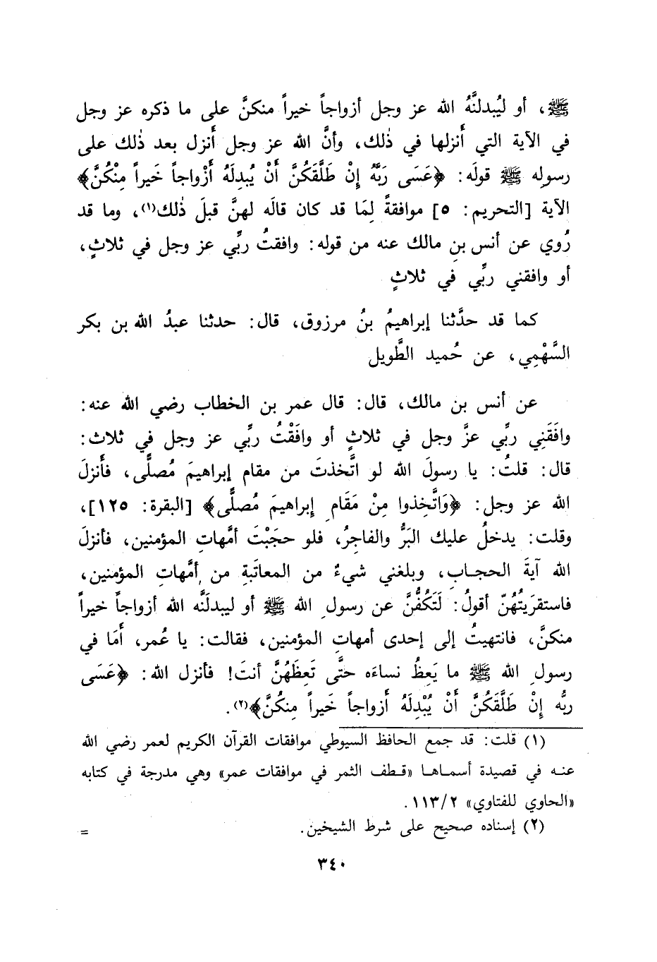 كَمَا قَدْ حَدَّثَنَا إبْرَاهِيمُ بْنُ مَرْزُوقٍ , قَالَ: حَدَّثَنَا عَبْدُ اللهِ بْنُ بَكْرٍ السَّهْمِيُّ , عَنْ حُمَيْدٍ الطَّوِيلِ عَنْ أَنَسِ بْنِ مَالِكٍ قَالَ: قَالَ عُمَرُ بْنُ الْخَطَّابِ رَضِيَ اللهُ عَنْهُ: " وَافَقَنِي رَبِّي عَزَّ وَجَلَّ فِي ثَلَاثٍ أَوْ وَافَقْتُ رَبِّي عَزَّ وَجَلَّ فِي ثَلَاثٍ قَالَ: قُلْتُ: يَا رَسُولَ اللهِ لَوِ اتَّخَذْتَ مِنْ مَقَامِ إبْرَاهِيمَ مُصَلًّى فَأَنْزَلَ اللهُ عَزَّ وَجَلَّ {وَاتَّخِذُوا مِنْ مَقَامِ إبْرَاهِيمَ مُصَلًّى} [البقرة: 125] وَقُلْتُ: يَدْخُلُ عَلَيْكَ الْبَرُّ وَالْفَاجِرُ فَلَوْ حَجَبْتَ أُمَّهَاتِ الْمُؤْمِنِينَ فَأَنْزَلَ اللهُ آيَةَ الْحِجَابِ وَبَلَغَنِي شَيْءٌ مِنَ الْمُعَاتَبَةِ مِنْ أُمَّهَاتِ الْمُؤْمِنِينَ فَاسْتَقْرَيْتُهُنَّ أَقُولُ: لَتَكُفُّنَّ عَنْ رَسُولِ اللهِ صَلَّى اللَّهُ عَلَيْهِ وَسَلَّمَ أَوْ لَيُبْدِلَنَّهُ اللهُ أَزْوَاجًا خَيْرًا مِنْكُنَّ فَانْتَهَيْتُ إلَى إحْدَى أُمَّهَاتِ الْمُؤْمِنِينَ فَقَالَتْ: يَا عُمَرُ، أَمَا فِي رَسُولِ اللهِ صَلَّى اللَّهُ عَلَيْهِ وَسَلَّمَ مَا يَعِظُ نِسَاءَهُ حَتَّى تَعِظَهُنَّ أَنْتَ فَأَنْزَلَ اللهُ {عَسَى رَبُّهُ إنْ طَلَّقَكُنَّ أَنْ يُبْدِلَهُ أَزْوَاجًا خَيْرًا مِنْكُنَّ} [التحريم: 5]-[341]- وَقَدْ رُوِيَ عَنْ عَبْدِ اللهِ بْنِ عَبَّاسٍ فِي تَوْكِيدِ مَا تَأَوَّلْنَا الْحَدِيثَ الْأَوَّلَ الَّذِي ذَكَرْنَا فِي هَذَا الْبَابِ عَلَيْهِ