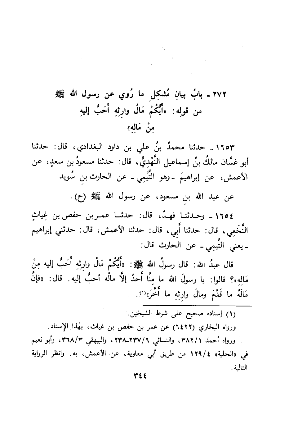 1654 - وَحَدَّثَنَا فَهْدٌ , قَالَ: حَدَّثَنَا عُمَرُ بْنُ حَفْصِ بْنِ غِيَاثٍ النَّخَعِيُّ , قَالَ: حَدَّثَنَا أَبِي , قَالَ: حَدَّثَنَا الْأَعْمَشُ , قَالَ: حَدَّثَنِي إبْرَاهِيمُ يَعْنِي التَّيْمِيَّ عَنِ الْحَارِثِ , قَالَ: قَالَ عَبْدُ اللهِ: قَالَ رَسُولُ اللهِ صَلَّى اللَّهُ عَلَيْهِ وَسَلَّمَ: " أَيُّكُمْ مَالُ وَارِثِهِ أَحَبُّ إلَيْهِ مِنْ مَالِهِ؟ " قَالُوا: يَا رَسُولَ اللهِ مَا مِنَّا أَحَدٌ إلَّا مَالُهُ أَحَبُّ إلَيْهِ، قَالَ: " فَإِنَّ مَالَهُ مَا قَدَّمَ وَمَالَ وَارِثِهِ مَا أَخَّرَ "