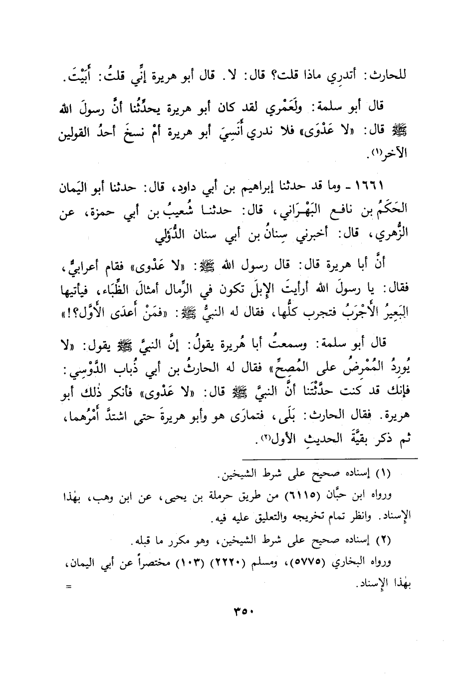 1661 - وَمَا قَدْ حَدَّثَنَا إبْرَاهِيمُ بْنُ أَبِي دَاوُدَ , قَالَ: حَدَّثَنَا أَبُو الْيَمَانِ الْحَكَمُ بْنُ نَافِعٍ الْبَهْرَانِيُّ , قَالَ: حَدَّثَنَا شُعَيْبُ بْنُ أَبِي حَمْزَةَ , عَنِ الزُّهْرِيِّ , قَالَ: أَخْبَرَنِي سِنَانُ بْنُ أَبِي سِنَانٍ الدُّؤَلِيُّ , أَنَّ أَبَا هُرَيْرَةَ , قَالَ قَالَ: رَسُولُ اللهِ صَلَّى اللَّهُ عَلَيْهِ وَسَلَّمَ: " لَا عَدْوَى " فَقَامَ أَعْرَابِيُّ، فَقَالَ: يَا رَسُولَ اللهِ أَرَأَيْتَ الْإِبِلَ تَكُونُ فِي الرِّمَالِ أَمْثَالَ الظِّبَاءِ فَيَأْتِيهَا الْبَعِيرُ الْأَجْرَبُ فَتَجْرَبُ كُلُّهَا فَقَالَ لَهُ النَّبِيُّ صَلَّى اللَّهُ عَلَيْهِ وَسَلَّمَ: " فَمَنْ أَعْدَى الْأَوَّلَ؟ "