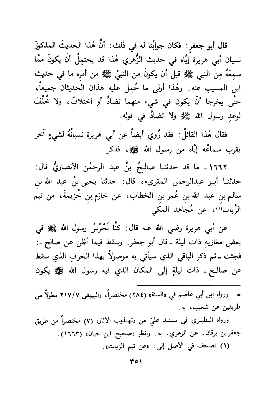 1662 - مَا قَدْ حَدَّثَنَا صَالِحُ بْنُ عَبْدِ الرَّحْمَنِ الْأَنْصَارِيُّ , قَالَ: حَدَّثَنَا أَبُو عَبْدِ الرَّحْمَنِ الْمُقْرِئُ , قَالَ: حَدَّثَنَا يَحْيَى بْنُ عَبْدِ اللهِ بْنِ سَالِمِ بْنِ عَبْدِ اللهِ بْنِ عُمَرَ بْنِ الْخَطَّابِ , عَنْ خَازِمِ بْنِ خُزَيْمَةَ , مِنْ تَيْمِ الرَّبَابِ عَنْ مُجَاهِدٍ الْمَكِّيِّ , عَنْ أَبِي هُرَيْرَةَ , رَضِيَ اللهُ عَنْهُ قَالَ: " كُنَّا نَحْرُسُ رَسُولَ اللهِ صَلَّى اللَّهُ عَلَيْهِ وَسَلَّمَ فِي بَعْضِ مَغَازِيهِ ذَاتَ لَيْلَةٍ قَالَ أَبُو جَعْفَرٍ: وَسَقَطَ فِيمَا أَظُنُّ عَنْ صَالِحٍ " فَجِئْتُ " ثُمَّ ذَكَرَ الْبَاقِيَ الَّذِي سَيَأْتِي بِهِ مَوْصُولًا بِهَذَا الْحَرْفِ الَّذِي سَقَطَ عَنْ صَالِحٍ ذَاتَ لَيْلَةٍ إلَى الْمَكَانِ الَّذِي فِيهِ رَسُولُ اللهِ صَلَّى اللَّهُ عَلَيْهِ وَسَلَّمَ يَكُونُ -[352]- مُضْطَجِعًا فَلَمْ أَجِدْ رَسُولَ اللهِ صَلَّى اللَّهُ عَلَيْهِ وَسَلَّمَ فِي مَضْجَعِهِ فَعَلِمْتُ أَنَّ رَسُولَ اللهِ صَلَّى اللَّهُ عَلَيْهِ وَسَلَّمَ إنَّمَا أَقَامَتْهُ الصَّلَاةُ فَتَلَفَّتُّ وَرَمَيْتُ بِبَصَرِي يَمِينًا وَشِمَالًا فَإِذَا رَسُولُ اللهِ صَلَّى اللَّهُ عَلَيْهِ وَسَلَّمَ قَائِمٌ إلَى الشَّجَرَةِ يُصَلِّي فَهَوَيْتُ نَحْوَهُ , فَإِذَا رَجُلٌ قَدْ أَخْرَجَهُ مِثْلُ الَّذِي أَخْرَجَنِي فَقُمْتُ أَنَا وَهُوَ خَلْفَ رَسُولِ اللهِ صَلَّى اللَّهُ عَلَيْهِ وَسَلَّمَ نُصَلِّي بِصَلَاةِ رَسُولِ اللهِ صَلَّى اللَّهُ عَلَيْهِ وَسَلَّمَ مَا شَاءَ أَنْ نُصَلِّيَ حَتَّى إذَا كَانَ بَيْنَ ظَهْرَانَيْ صَلَاتِهِ سَجَدَ سَجْدَةً ظَنَنْتُ أَنْ قَدْ قُبِضَ فِيهَا فَابْتَدَرْنَاهُ فَجَلَسْنَا بَيْنَ يَدَيْهِ أَنَا وَصَاحِبِي، فَسَاءَلَنَا رَسُولُ اللهِ صَلَّى اللَّهُ عَلَيْهِ وَسَلَّمَ وَسَاءَلْنَاهُ ثُمَّ قَالَ: " هَلْ أَنْكَرْتُمْ مِنْ صَلَاتِي اللَّيْلَةَ شَيْئًا؟ " قَالَ: فَقُلْنَا: نَعَمْ يَا رَسُولَ اللهِ، سَجَدْتَ مِنْ بَيْنِ ظَهْرَانَيْ صَلَاتِكَ سَجْدَةً حَتَّى ظَنَنَّا أَنَّكَ قَدْ قُبِضْتُ فِيهَا، فَقَالَ رَسُولُ اللهِ صَلَّى اللَّهُ عَلَيْهِ وَسَلَّمَ: " إنِّي أُعْطِيتُ فِيهَا خَمْسًا لَمْ يُعْطَهَا نَبِيٌّ قَبْلِي إنِّي بُعِثْتُ إلَى النَّاسِ كَافَّةً أَحْمَرِهِمْ وَأَسْوَدِهِمْ وَكَانَ النَّبِيُّ قَبْلِي يُبْعَثُ إلَى أَهْلِ بَيْتِهِ أَوْ إلَى أَهْلِ قَرْيَتِهِ، وَنُصِرْتُ عَلَى عَدُوِّي بِالرُّعْبِ مَسِيرَةَ شَهْرٍ أَمَامِي وَشَهْرٍ خَلْفِي، وَأُحِلَّتْ لِي الْغَنَائِمُ وَالْأَخْمَاسُ وَلَمْ تَحِلَّ لِنَبِيٍّ قَبْلِي، إنَّمَا تُؤْخَذُ فَتُوضَعُ فَتَنْزِلُ عَلَيْهَا نَارٌ مِنَ السَّمَاءِ بَيْضَاءُ فَتَحْرِقُهَا، وَجُعِلَتْ لِي الْأَرْضُ مَسْجِدًا وَطَهُورًا أُصَلِّي فِيهَا حَيْثُ أَدْرَكَتْنِي الصَّلَاةُ وَأُعْطِيتُ حِينَئِذٍ دَعْوَةً فَذَخَرْتُهَا شَفَاعَةً لِأُمَّتِي يَوْمَ الْقِيَامَةِ " قَالَ مُجَاهِدٌ قَالَ: أَبُو هُرَيْرَةَ وَقَالَ لِي صَاحِبِي , وَكَانَ أَفْضَلَ مِنِّي: نَسِيتَ أَفْضَلَهَا أَوْ أَخْيَرَهَا قَوْلَ رَسُولِ اللهِ صَلَّى اللَّهُ عَلَيْهِ وَسَلَّمَ: " وَأَنَا أَرْجُو أَنْ تَنَالَ مِنْ أُمَّتِي مَنْ لَا يُشْرِكُ بِاللهِ شَيْئًا " , وَذَكَرَ أَبُو هُرَيْرَةَ أَنَّ صَاحِبَهُ ذَلِكَ كَانَ أَبَا ذَرٍّ الْغِفَارِيَّ رَضِيَ اللهُ عَنْهُ -[353]- فَكَانَ فِي هَذَا الْحَدِيثِ إخْبَارُ أَبِي ذَرٍّ أَبَا هُرَيْرَةَ نِسْيَانَهُ مَا قَدْ سَمِعَهُ مِنْ رَسُولِ اللهِ صَلَّى اللَّهُ عَلَيْهِ وَسَلَّمَ بِقُرْبِ سَمَاعِهِ إيَّاهُ مِنْهُ فَكَانَ جَوَابَنَا لَهُ بِتَوْفِيقِ اللهِ عَزَّ وَجَلَّ وَعَوْنِهِ أَنَّهُ قَدْ يَحْتَمِلُ أَنْ يَكُونَ هَذَا كَانَ مِنْ أَبِي هُرَيْرَةَ قَبْلَ أَنْ يَكُونَ مِنْ رَسُولِ الل