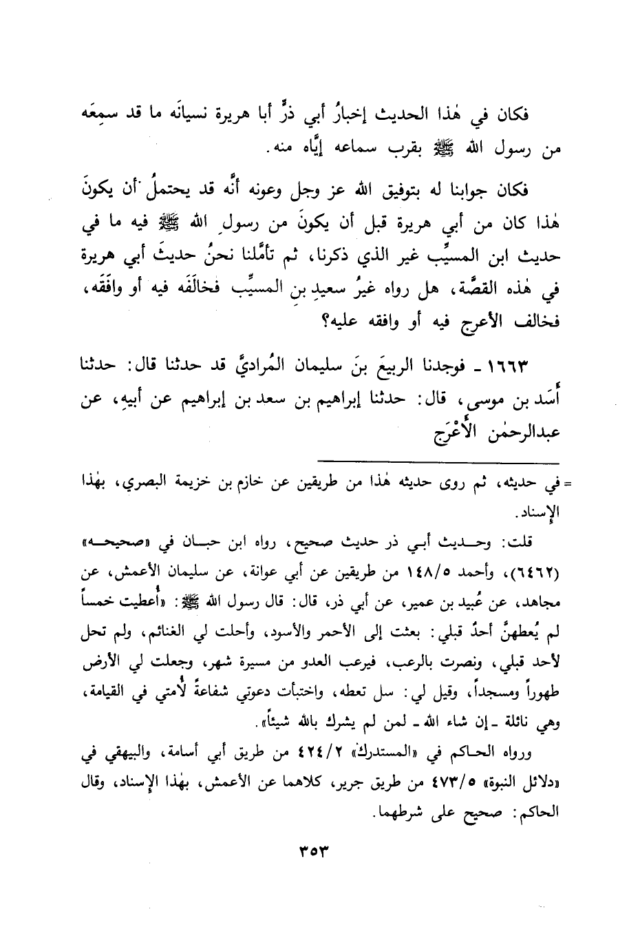 1663 - فَوَجَدْنَا الرَّبِيعَ بْنَ سُلَيْمَانَ الْمُرَادِيَّ قَدْ حَدَّثَنَا قَالَ: حَدَّثَنَا أَسَدُ بْنُ مُوسَى , قَالَ: حَدَّثَنَا إبْرَاهِيمُ بْنُ سَعْدِ بْنِ إبْرَاهِيمَ , عَنْ أَبِيهِ , عَنْ عَبْدِ الرَّحْمَنِ الْأَعْرَجِ , -[354]- أَنَّ أَبَا هُرَيْرَةَ , قَالَ: يَقُولُونَ أَبُو هُرَيْرَةَ: " يُكْثِرُ وَاللهُ الْمَوْعِدُ يَقُولُونَ: مَا بَالُ الْمُهَاجِرِينَ لَا يُحَدِّثُونَ مِثْلَ حَدِيثِهِ ? وَمَا بَالُ الْأَنْصَارِ لَا يُحَدِّثُونَ بِمِثْلِ أَحَادِيثِهِ وَإِنِّي أُحَدِّثُكُمْ عَنْ ذَلِكَ إنَّ إخْوَانِي مِنَ الْمُهَاجِرِينَ كَانَ يَشْغَلُهُمُ الصَّفْقُ بِالْأَسْوَاقِ، وَإِنَّ إخْوَانِي مِنَ الْأَنْصَارِ كَانَ يَشْغَلُهُمْ عَمَلُ أَمْوَالِهِمْ وَكُنْتُ مِسْكِينًا أَلْزَمُ النَّبِيَّ صَلَّى اللَّهُ عَلَيْهِ وَسَلَّمَ عَلَى شِبَعِ مِلْءِ بَطْنِي وَأَحْضُرُ حِينَ يَغِيبُونَ وَأَعِي حِينَ يَنْسَوْنَ، وَلَقَدْ قَالَ النَّبِيُّ صَلَّى اللَّهُ عَلَيْهِ وَسَلَّمَ يَوْمًا: " إنْ بَسَطَ أَحَدٌ مِنْكُمْ ثَوْبَهُ حَتَّى أَقْضِيَ مَقَالَتِي هَذِهِ ثُمَّ يَجْمَعُ ثَوْبَهُ إلَى صَدْرِهِ فَلَا يَنْسَى مِنْ مَقَالَتِي شَيْئًا أَبَدًا " قَالَ أَبُو هُرَيْرَةَ: فَبَسَطْتُ نَمِرَةً لَيْسَ عَلَيَّ ثَوْبٌ غَيْرُهَا حَتَّى قَضَى النَّبِيُّ صَلَّى اللَّهُ عَلَيْهِ وَسَلَّمَ مَقَالَتَهُ، ثُمَّ جَمَعْتُهُ إلَى صَدْرِي، فَوَالَّذِي بَعَثَ مُحَمَّدًا صَلَّى اللَّهُ عَلَيْهِ وَسَلَّمَ بِالْحَقِّ مَا نَسِيتُ مِنْ مَقَالَتِهِ تِلْكَ كَلِمَةً إلَى يَوْمِي هَذَا , وَوَاللهِ لَوْلَا آيَتَانِ أَنْزَلَهُمَا اللهُ فِي كِتَابِهِ مَا حَدَّثْتُكُمْ بِشَيْءٍ أَبَدًا: قَوْلُ اللهِ عَزَّ وَجَلَّ: {إنَّ الَّذِينَ يَكْتُمُونَ مَا أَنْزَلْنَا مِنَ الْبَيِّنَاتِ وَالْهُدَى. . .} [البقرة: 159] فَوَقَفْنَا بِذَلِكَ عَلَى خِلَافِ عَبْدِ الرَّحْمَنِ الْأَعْرَجِ سَعِيدَ بْنَ الْمُسَيِّبِ عَنْ أَبِي هُرَيْرَةَ فِي هَذَا الْحَدِيثِ وَعَلَى رِوَايَةِ سَعِيدِ بْنِ الْمُسَيِّبِ إيَّاهُ عَلَى إطْلَاقِ نَفْيِ النِّسْيَانِ عَنْ أَبِي هُرَيْرَةَ مَا سَمِعَهُ مِنَ النَّبِيِّ صَلَّى اللَّهُ عَلَيْهِ وَسَلَّمَ بَعْدَ -[355]- أَنْ كَانَ مِنْهُ فِيهِ مَا كَانَ , وَعَلَى رِوَايَةِ الْأَعْرَجِ عَنْهُ أَنَّهُ إنَّمَا كَانَ ذَلِكَ مِنْ رَسُولِ اللهِ صَلَّى اللَّهُ عَلَيْهِ وَسَلَّمَ فِي الْمَقَالَةِ الَّتِي كَانَتْ مِنْهُ فِي ذَلِكَ الْمَجْلِسِ لَا فِيمَا كَانَ أَبُو هُرَيْرَةَ سَمِعَهُ مِنْهُ قَبْلَ ذَلِكَ، وَلَا فِيمَا سِوَاهُ مِمَّا سَمِعَهُ مِنْهُ بَعْدَ ذَلِكَ وَاللهُ أَعْلَمُ بِحَقِيقَةِ الْأَمْرِ كَانَ فِي ذَلِكَ وَقَدِ اسْتَدَلَّ قَوْمٌ عَلَى تَثْبِيتِ مَا رَوَى الْأَعْرَجُ عَنْ أَبِي هُرَيْرَةَ فِي ذَلِكَ مِنْ مَا قَضَوْا لَهُ عَلَى سَعِيدِ بْنِ الْمُسَيِّبِ فِيمَا رَوَاهُ عَنْ أَبِي هُرَيْرَةَ مِنْ ذَلِكَ مِمَّا خَالَفَهُ فِيهِ مِمَّا قَدْ رَوَاهُ عَنْهُ غَيْرُهُمَا