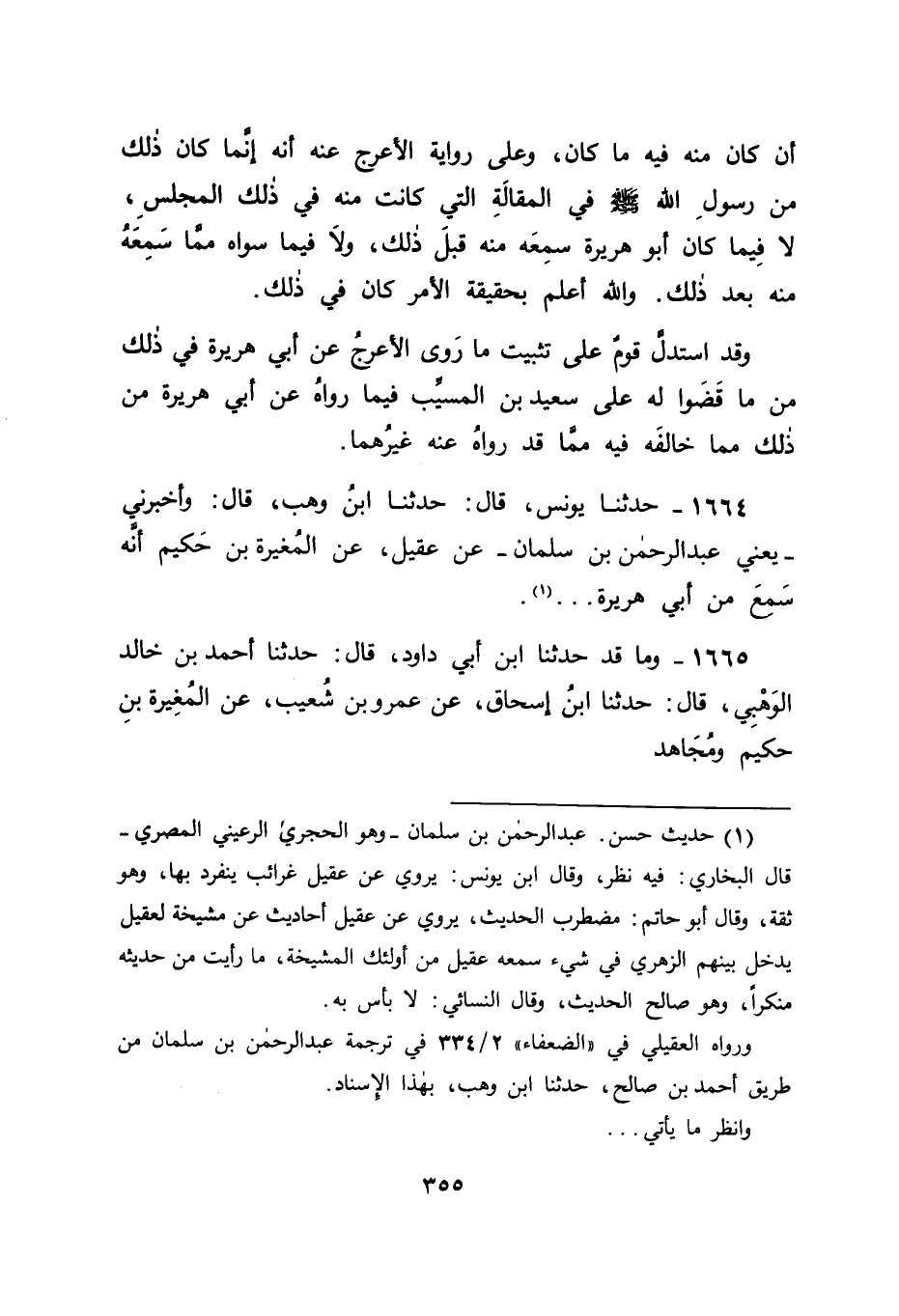 1664 - حَدَّثَنَا يُونُسُ , قَالَ: حَدَّثَنَا ابْنُ وَهْبٍ , قَالَ: وَأَخْبَرَنِي يَعْنِي عَبْدَ الرَّحْمَنِ بْنَ سَلْمَانَ , عَنْ عُقَيْلٍ , عَنِ الْمُغِيرَةِ بْنِ حَكِيمٍ , أَنَّهُ سَمِعَ مِنْ أَبِي هُرَيْرَةَ