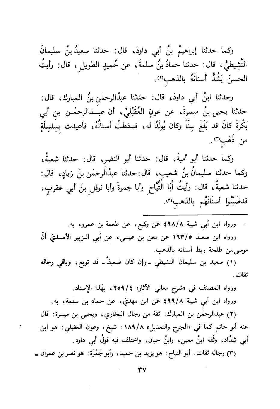 وَكَمَا حَدَّثَنَا إبْرَاهِيمُ بْنُ أَبِي دَاوُدَ قَالَ: حَدَّثَنَا سَعِيدُ بْنُ سُلَيْمَانَ النُّشَيْطِيُّ قَالَ: حَدَّثَنَا حَمَّادُ بْنُ سَلَمَةَ، عَنْ حُمَيْدٍ الطَّوِيلِ قَالَ: رَأَيْتُ الْحَسَنَ يَشُدُّ أَسْنَانَهُ بِالذَّهَبِ ". وَحَدَّثَنَا ابْنُ أَبِي دَاوُدَ قَالَ: حَدَّثَنَا عَبْدُ الرَّحْمَنِ بْنُ الْمُبَارَكِ قَالَ: حَدَّثَنَا يَحْيَى بْنُ مَيْسَرَةَ، عَنْ عَوْنٍ الْعُقَيْلِيِّ، أَنَّ عَبْدَ الرَّحْمَنِ بْنَ أَبِي بَكْرَةَ كَانَ قَدْ بَلَغَ سِنًّا وَكَانَ يُولَدُ لَهُ فَسَقَطَتْ أَسْنَانُهُ فَأُعِيدَتْ بِسِلْسِلَةٍ مِنْ ذَهَبٍ