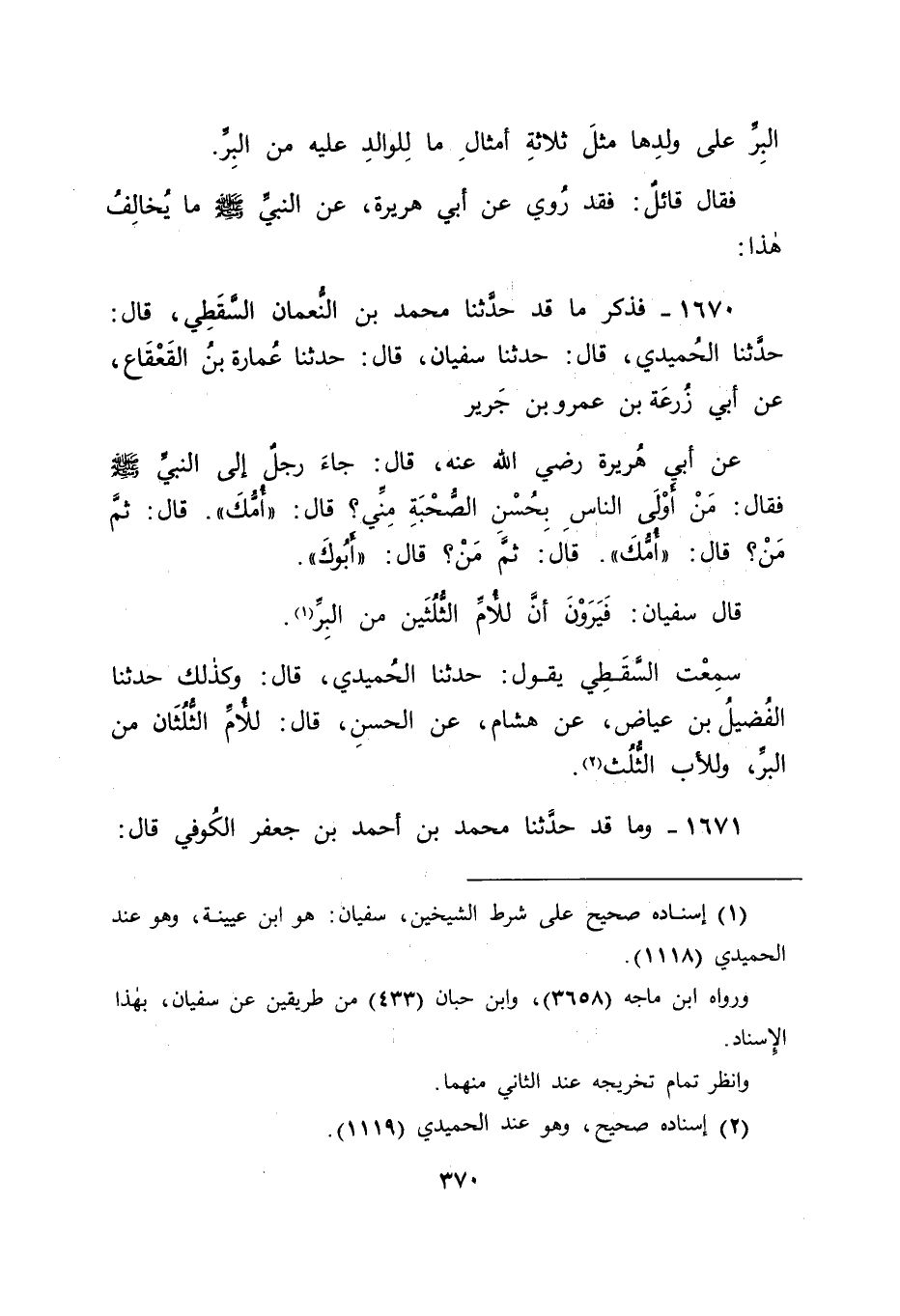 1671 - وَمَا قَدْ حَدَّثَنَا مُحَمَّدُ بْنُ أَحْمَدَ بْنِ جَعْفَرٍ الْكُوفِيُّ , قَالَ: -[371]- حَدَّثَنَا عَلِيُّ بْنُ الْمَدِينِيِّ , قَالَ: حَدَّثَنَا سُفْيَانُ بْنُ عُيَيْنَةَ , قَالَ: حَدَّثَنَا عُمَارَةُ بْنُ الْقَعْقَاعِ , عَنْ أَبِي زُرْعَةَ , عَنْ أَبِي هُرَيْرَةَ , رَضِيَ اللهُ عَنْهُ، قَالَ: قَالَ رَجُلٌ: يَا رَسُولَ اللهِ، مَنْ أَحَقُّ النَّاسِ مِنِّي بِحُسْنِ الصُّحْبَةِ؟ قَالَ: " أُمُّكَ " قَالَ: ثُمَّ مَنْ؟ قَالَ: " أُمُّكَ " قَالَ: ثُمَّ مَنْ؟ قَالَ: " أَبُوكَ " قَالَ: فَيَرَوْنَ أَنَّ لِلْأُمِّ الثُّلُثَيْنِ مِنَ الْبِرِّ، وَأَنَّ لِلْأَبِ الثُّلُثَ فَقِيلَ لِسُفْيَانَ: لِلْأُمِّ الثُّلُثَانِ فِي الْحَدِيثِ؟ قَالَ: سَمِعْتُهُ مِنَ ابْنِ شُبْرُمَةَ يُحَدِّثُهُ عَنْ عُمَارَةَ قَبْلَ أَنْ أَرَاهُ، فَسَأَلْتُ عُمَارَةَ , فَجَاءَ بِهِ قَالَ أَبُو جَعْفَرٍ: فَكَانَ جَوَابَنَا لَهُ فِي ذَلِكَ بِتَوْفِيقِ اللهِ وَعَوْنِهِ أَنَّ هَذَا قَدْ يَحْتَمِلُ أَنْ يَكُونَ ابْنُ عُيَيْنَةَ ذَهَبَ عَنْهُ فِي ذَلِكَ مَا قَدْ حَفِظَهُ شُجَاعٌ ; لِأَنَّ ابْنَ عُيَيْنَةَ إنَّمَا كَانَ يُحَدِّثُ مِنْ حِفْظِهِ , وَشُجَاعٌ كَانَ يُحَدِّثُ مِنْ كِتَابِهِ , وَإِنْ كَانَ ابْنُ عُيَيْنَةَ قَدْ زَادَ عَلَى شُجَاعٍ فِي إسْنَادِ هَذَا الْحَدِيثِ عُمَارَةَ بْنَ الْقَعْقَاعِ بَيْنَ ابْنِ شُبْرُمَةَ وَبَيْنَ أَبِي زُرْعَةَ، وَكَانَ الْأَوْلَى بِنَا لَمَّا اخْتُلِفَ عَنْ أَبِي هُرَيْرَةَ فِي ذَلِكَ هَذَا الِاخْتِلَافَ الَّذِي ذَكَرْنَاهُ فِي بِرِّ الْأُمِّ أَنْ يُجْعَلَ الْأَوْلَى بِهِ مِنْهُ مَا قَدْ وَافَقَهُ عَلَيْهِ مُعَاوِيَةُ بْنُ حَيْدَةَ جَدُّ بَهْزِ بْنِ حَكِيمٍ وَخِدَاشٌ أَبُو سَلَامَةَ عَنِ النَّبِيِّ صَلَّى اللَّهُ عَلَيْهِ وَسَلَّمَ لَا مَا خَالَفَاهُ فِيهِ عَنْهُ فَثَبَتَ بِذَلِكَ أَنَّ الْوَاجِبَ لِلْأُمِّ عَلَى وَلَدِهَا مِنَ الْبِرِّ وَحُسْنِ الصُّحْبَةِ ثَلَاثَةُ أَمْثَالِ مَا لِلْوَالِدِ عَلَيْهِ مِنْهُمَا، وَاللهَ نَسْأَلُهُ التَّوْفِيقَ -[372]- قَالَ أَبُو جَعْفَرٍ: ثُمَّ تَأَمَّلْنَا حَدِيثَ أَبِي زُرْعَةَ الَّذِي بَدَأْنَا بِذِكْرِهِ فِي أَوَّلِ هَذَا الْبَابِ، وَهَلْ وَافَقَ شُجَاعًا عَلَى مَا رَوَاهُ عَلَيْهِ مِمَّا خَالَفَ فِيهِ ابْنَ عُيَيْنَةَ أَحَدٌ