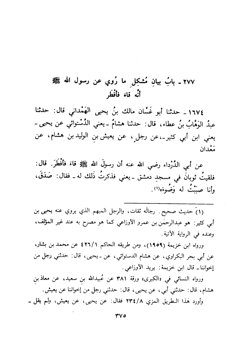 1674 - حَدَّثَنَا أَبُو غَسَّانَ مَالِكُ بْنُ يَحْيَى الْهَمْدَانِيُّ , قَالَ: حَدَّثَنَا عَبْدُ الْوَهَّابِ بْنُ عَطَاءٍ , قَالَ: حَدَّثَنَا هِشَامٌ يَعْنِي الدَّسْتُوَائِيَّ , عَنْ يَحْيَى يَعْنِي ابْنَ أَبِي كَثِيرٍ، عَنْ رَجُلٍ , عَنْ يَعِيشَ بْنِ الْوَلِيدِ بْنِ هِشَامٍ , عَنْ مَعْدَانَ , عَنْ أَبِي الدَّرْدَاءِ , رَضِيَ اللهُ عَنْهُ , أَنَّ رَسُولَ اللهِ صَلَّى اللَّهُ عَلَيْهِ وَسَلَّمَ " قَاءَ فَأَفْطَرَ " قَالَ: فَلَقِيتُ ثَوْبَانَ فِي مَسْجِدِ دِمَشْقَ يَعْنِي فَذَكَرْتُ ذَلِكَ لَهُ، فَقَالَ: صَدَقَ وَأَنَا صَبَبْتُ لَهُ وَضُوءَهُ " -[376]- قَالَ أَبُو جَعْفَرٍ: فَكَانَ فِي هَذَا الْحَدِيثِ سُكُوتُ هِشَامٍ عَنْ تَسْمِيَةِ الرَّجُلِ الَّذِي حَدَّثَهُ يَحْيَى بْنُ أَبِي كَثِيرٍ بِهَذَا الْحَدِيثِ عَنْهُ , وَهُوَ عَبْدُ الرَّحْمَنِ بْنُ عَمْرٍو الْأَوْزَاعِيِّ
