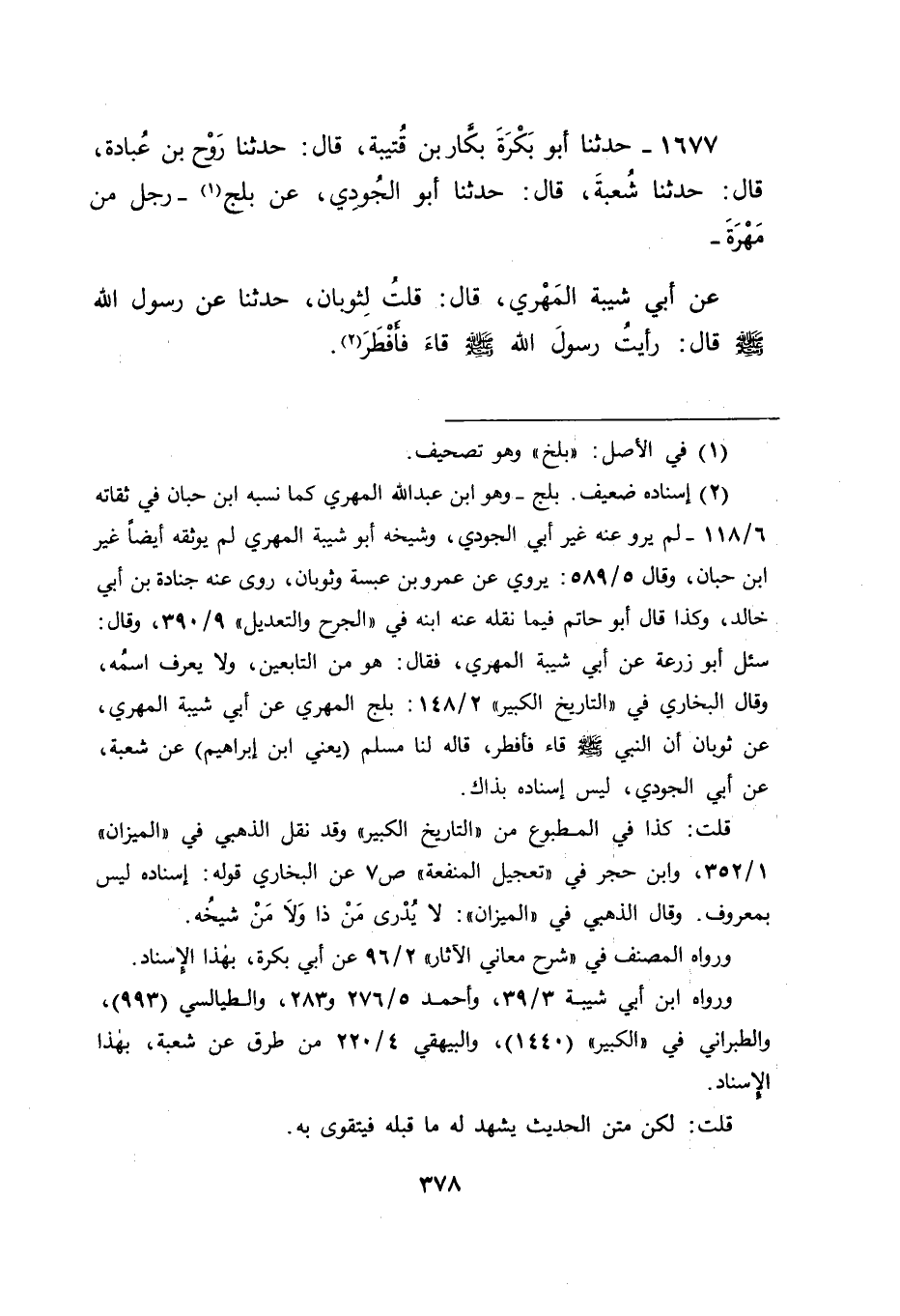 1677 - حَدَّثَنَا أَبُو بَكْرَةَ بَكَّارُ بْنُ قُتَيْبَةَ , قَالَ: حَدَّثَنَا رَوْحُ بْنُ عُبَادَةَ , قَالَ: حَدَّثَنَا شُعْبَةُ , قَالَ: حَدَّثَنَا أَبُو الْجُودِيِّ , عَنْ بَلْجٍ رَجُلٍ مِنْ مَهْرَةَ عَنْ أَبِي شَيْبَةَ الْمَهْرِيِّ , قَالَ: قُلْتُ لِثَوْبَانَ: حَدِّثْنَا عَنْ رَسُولِ اللهِ صَلَّى اللَّهُ عَلَيْهِ وَسَلَّمَ قَالَ: " رَأَيْتُ رَسُولَ اللهِ صَلَّى اللَّهُ عَلَيْهِ وَسَلَّمَ " قَاءَ فَأَفْطَرَ "