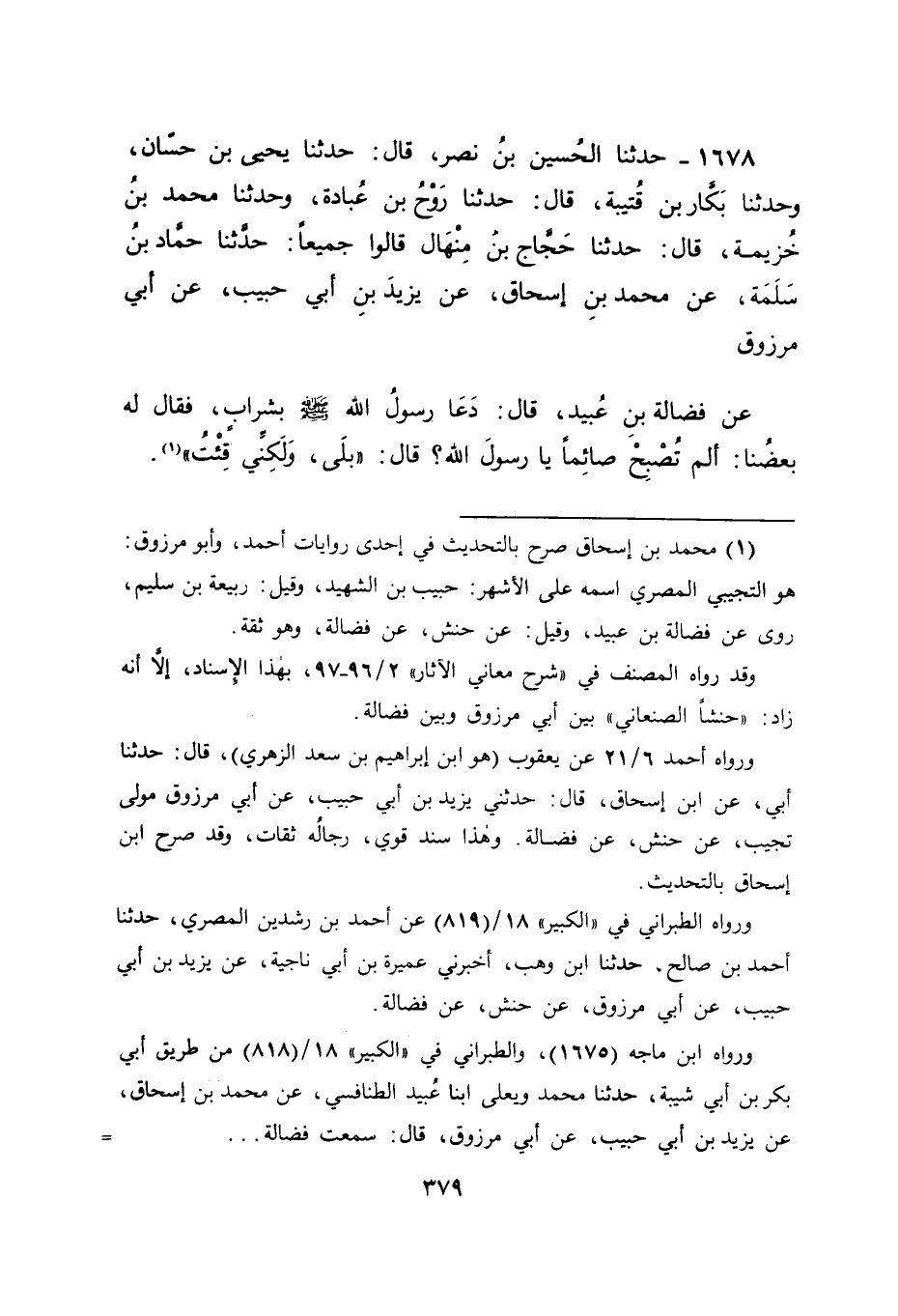 1678 - حَدَّثَنَا الْحُسَيْنُ بْنُ نَصْرٍ , قَالَ: حَدَّثَنَا يَحْيَى بْنُ حَسَّانَ , وَحَدَّثَنَا بَكَّارُ بْنُ قُتَيْبَةَ , قَالَ: حَدَّثَنَا رَوْحُ بْنُ عُبَادَةَ , وَحَدَّثَنَا مُحَمَّدُ بْنُ خُزَيْمَةَ , قَالَ: حَدَّثَنَا حَجَّاجُ بْنُ مِنْهَالٍ , قَالُوا جَمِيعًا حَدَّثَنَا حَمَّادُ بْنُ سَلَمَةَ , عَنْ مُحَمَّدِ بْنِ إِسْحَاقَ , عَنْ يَزِيدَ بْنِ أَبِي حَبِيبٍ , عَنْ أَبِي مَرْزُوقٍ , عَنْ فَضَالَةَ بْنِ عُبَيْدٍ , قَالَ: " دَعَا رَسُولُ اللهِ صَلَّى اللَّهُ عَلَيْهِ وَسَلَّمَ بِشَرَابٍ، فَقَالَ لَهُ بَعْضُنَا أَلَمْ تُصْبِحْ صَائِمًا يَا رَسُولَ اللهِ؟ قَالَ: بَلَى , وَلَكِنِّي قِئْتُ " -[380]-