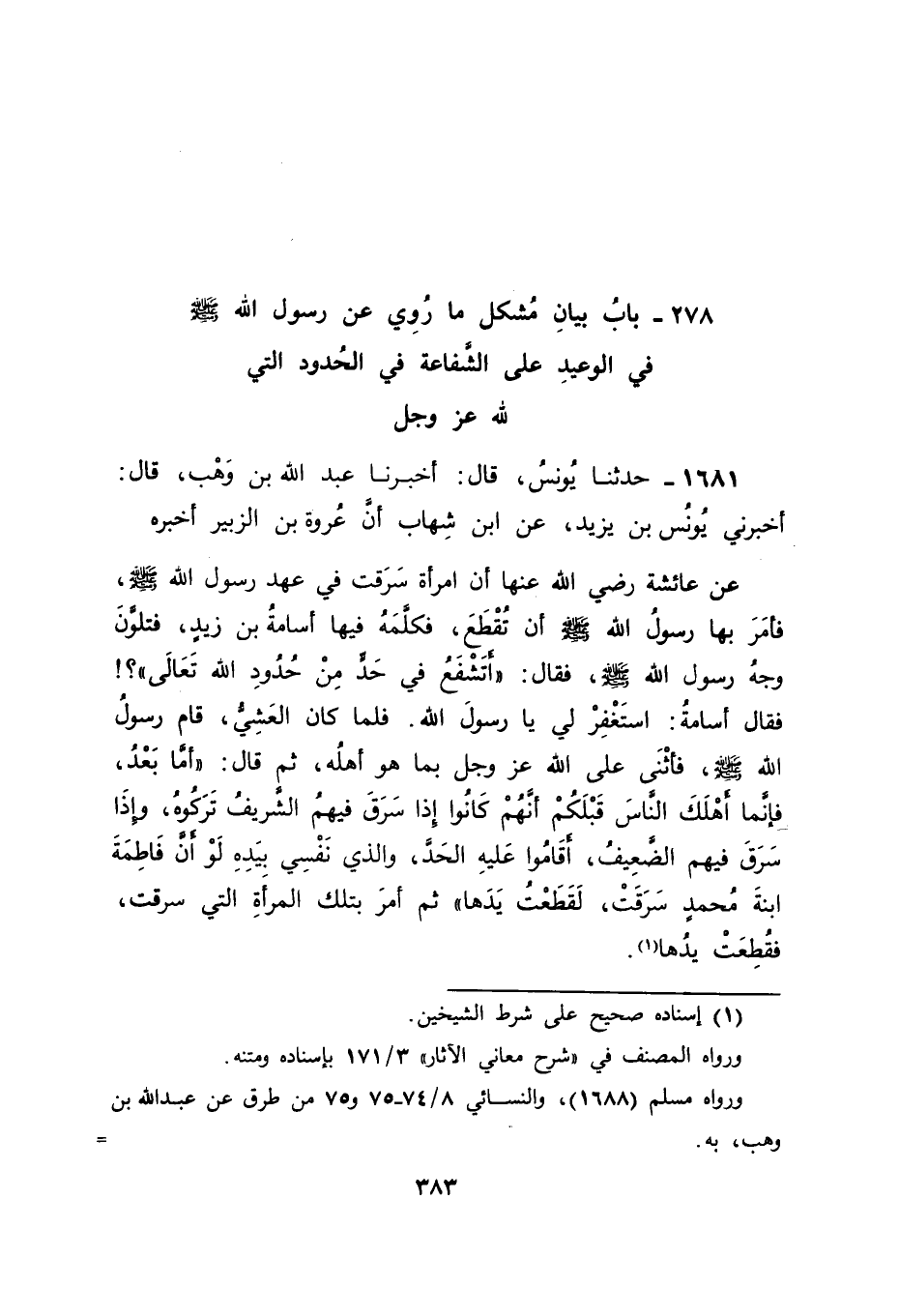 1681 - حَدَّثَنَا يُونُسُ , قَالَ: أَخْبَرَنَا عَبْدُ اللهِ بْنُ وَهْبٍ , قَالَ: أَخْبَرَنِي يُونُسُ بْنُ يَزِيدَ , عَنِ ابْنِ شِهَابٍ , أَنَّ عُرْوَةَ بْنَ الزُّبَيْرِ , أَخْبَرَهُ عَنْ عَائِشَةَ , رَضِيَ اللهُ عَنْهَا " أَنَّ امْرَأَةً سَرَقَتْ فِي عَهْدِ رَسُولِ اللهِ صَلَّى اللَّهُ عَلَيْهِ وَسَلَّمَ فَأَمَرَ بِهَا رَسُولُ اللهِ صَلَّى اللَّهُ عَلَيْهِ وَسَلَّمَ أَنْ تُقْطَعَ فَكَلَّمَهُ فِيهَا أُسَامَةُ بْنُ زَيْدٍ فَتَلَوَّنَ وَجْهُ رَسُولِ اللهِ صَلَّى اللَّهُ عَلَيْهِ وَسَلَّمَ فَقَالَ: " أَتَشْفَعُ فِي حَدٍّ مِنْ حُدُودِ اللهِ تَعَالَى؟ " فَقَالَ أُسَامَةُ: اسْتَغْفِرْ لِي يَا رَسُولَ اللهِ، فَلَمَّا كَانَ الْعَشِيُّ، قَامَ رَسُولُ اللهِ صَلَّى اللَّهُ عَلَيْهِ وَسَلَّمَ فَأَثْنَى عَلَى اللهِ عَزَّ وَجَلَّ بِمَا هُوَ أَهْلُهُ ثُمَّ قَالَ: " أَمَّا بَعْدُ، فَإِنَّمَا أَهْلَكَ النَّاسَ قَبْلَكُمْ أَنَّهُمْ كَانُوا إذَا سَرَقَ فِيهِمُ الشَّرِيفُ تَرَكُوهُ , وَإِذَا سَرَقَ فِيهِمُ الضَّعِيفُ أَقَامُوا عَلَيْهِ الْحَدَّ , وَالَّذِي نَفْسِي بِيَدِهِ لَوْ أَنَّ فَاطِمَةَ ابْنَةَ مُحَمَّدٍ سَرَقَتْ لَقَطَعْتُ يَدَهَا ثُمَّ أَمَرَ بِتِلْكَ الْمَرْأَةِ الَّتِي سَرَقَتْ فَقُطِعَتْ يَدُهَا " -[384]-