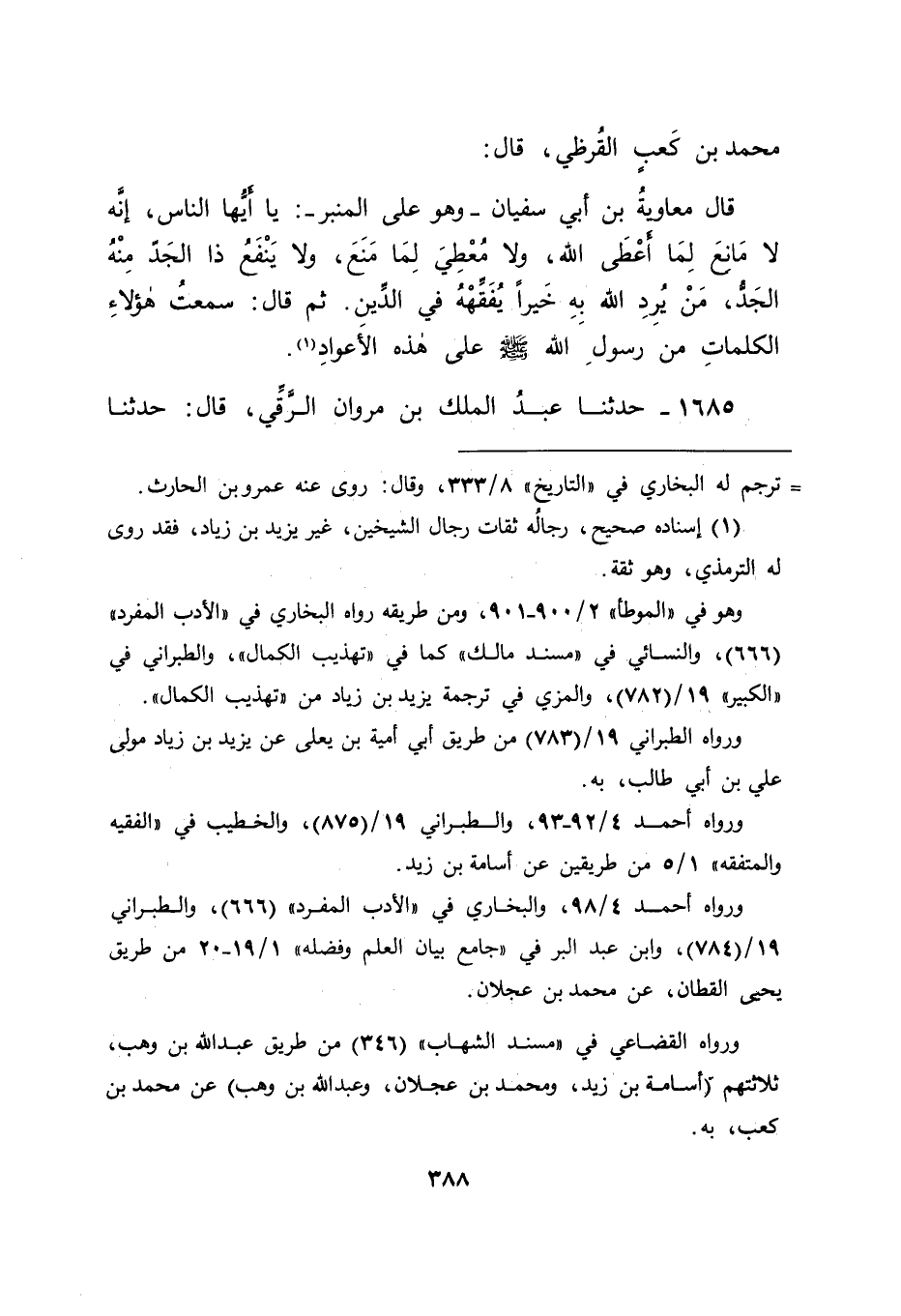 1685 - حَدَّثَنَا عَبْدُ الْمَلِكِ بْنُ مَرْوَانَ الرَّقِّيُّ , قَالَ: حَدَّثَنَا -[389]- شُجَاعُ بْنُ الْوَلِيدِ , عَنْ عُثْمَانَ بْنِ حَكِيمٍ الْأَنْصَارِيِّ , عَنْ مُحَمَّدِ بْنِ كَعْبٍ الْقُرَظِيِّ , قَالَ: قَالَ مُعَاوِيَةُ فِي حَجَّتِهِ: " سَمِعْتُ رَسُولَ اللهِ صَلَّى اللَّهُ عَلَيْهِ وَسَلَّمَ يَقُولُ عَلَى هَذِهِ الْأَعْوَادِ: اللهُمَّ لَا مَانِعَ لِمَا أَعْطَيْتُ، وَلَا مُعْطِيَ لِمَا مَنَعْتُ، مَنْ يُرِدِ اللهُ بِهِ الْخَيْرَ يُفَقِّهْهُ فِي الدِّينِ "